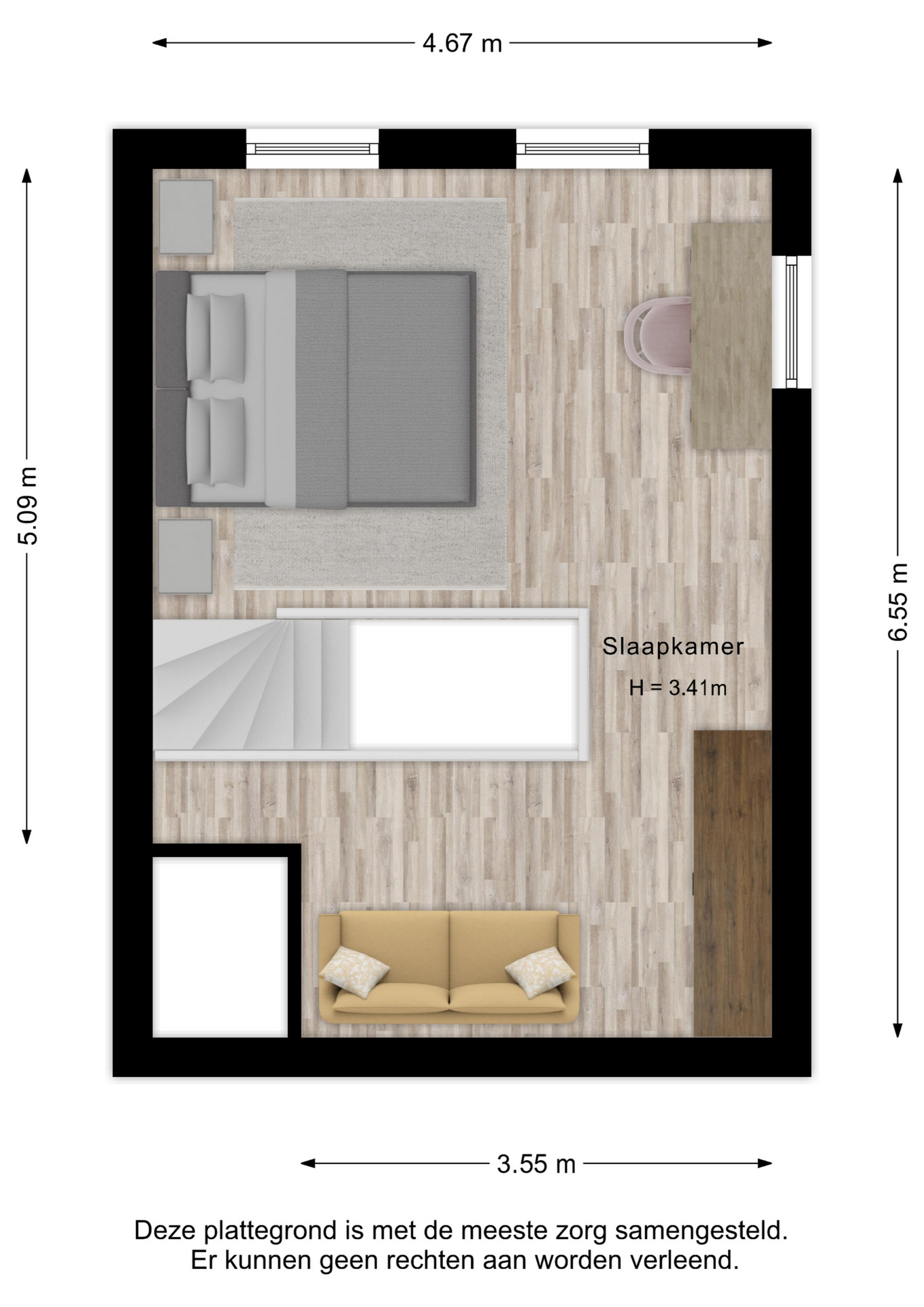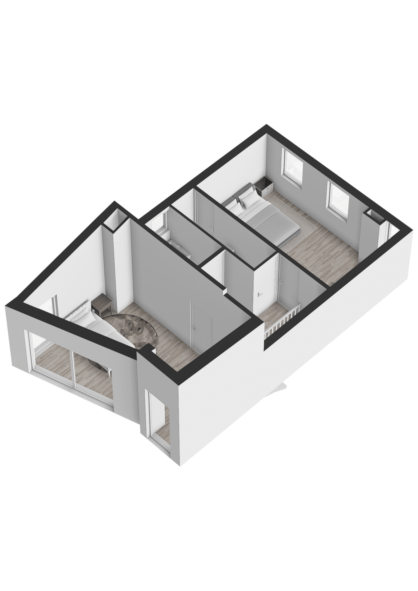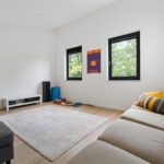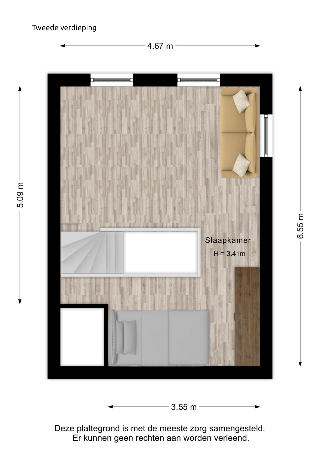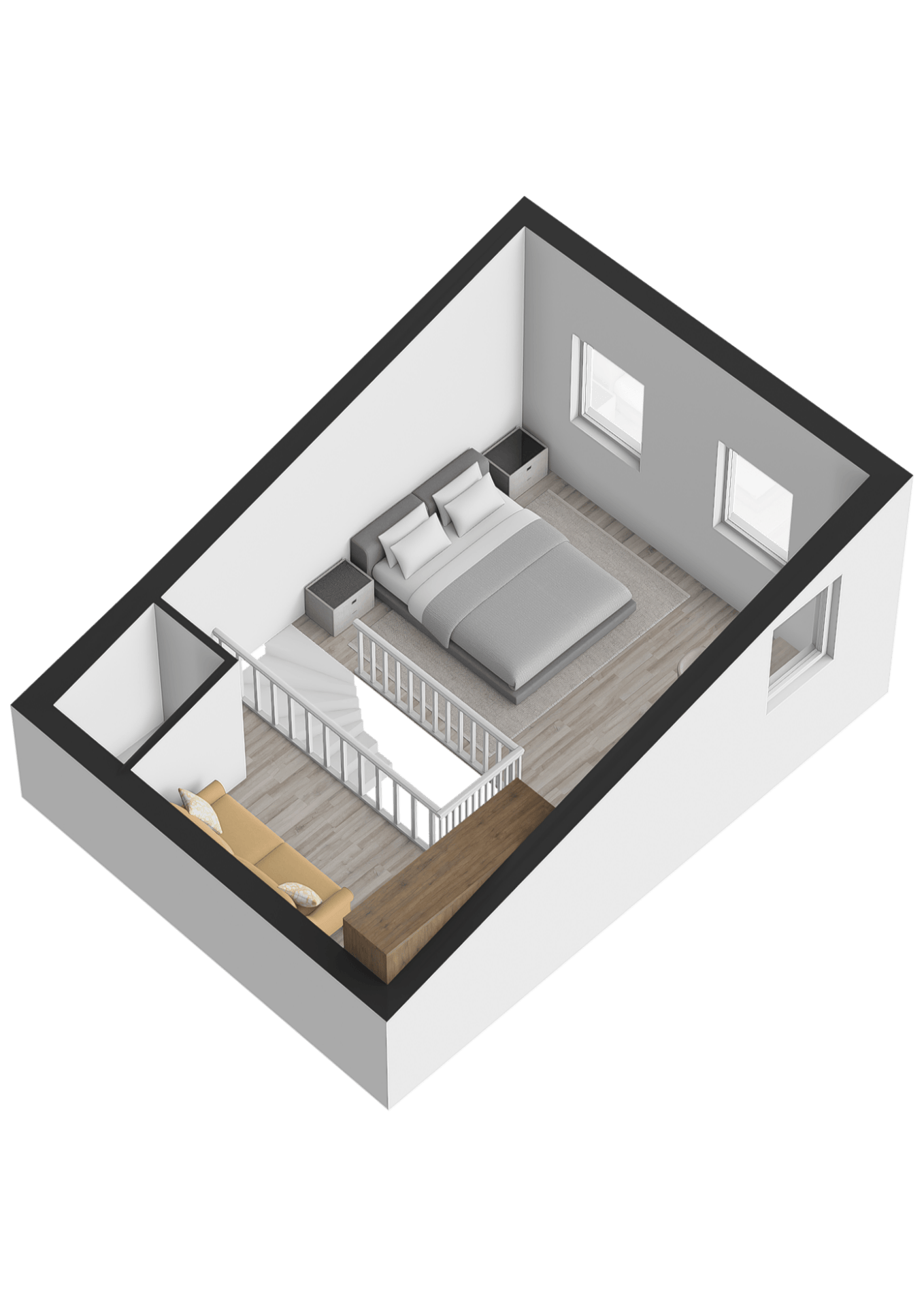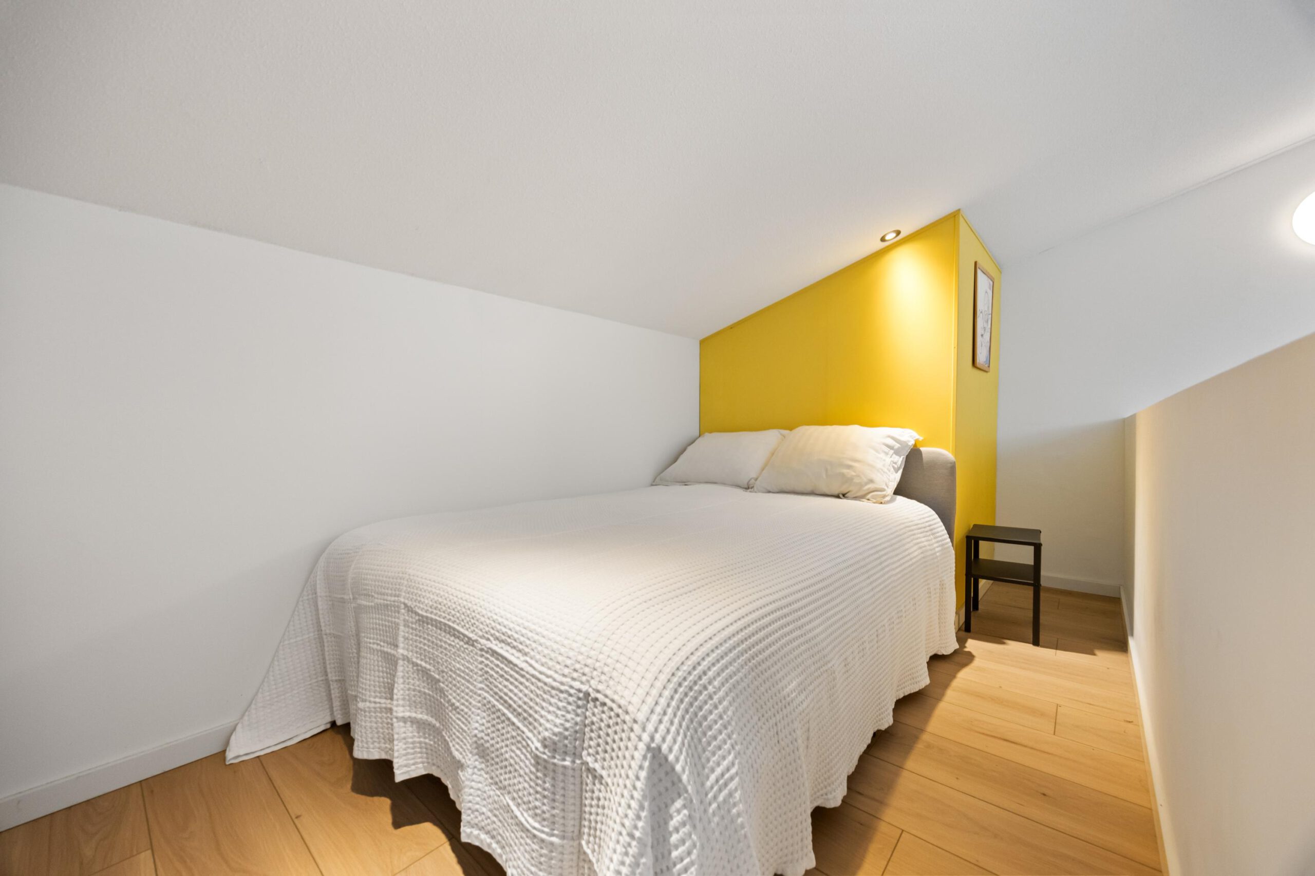 2e verdieping: Grote slaapkamer met veel lichtinval. Thans ingericht als sportruimte, bioscoop en logeerkamer. Het zijraam biedt toegang tot het dak