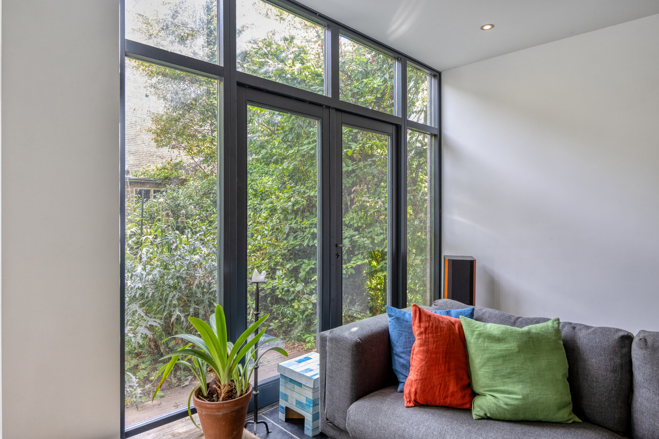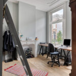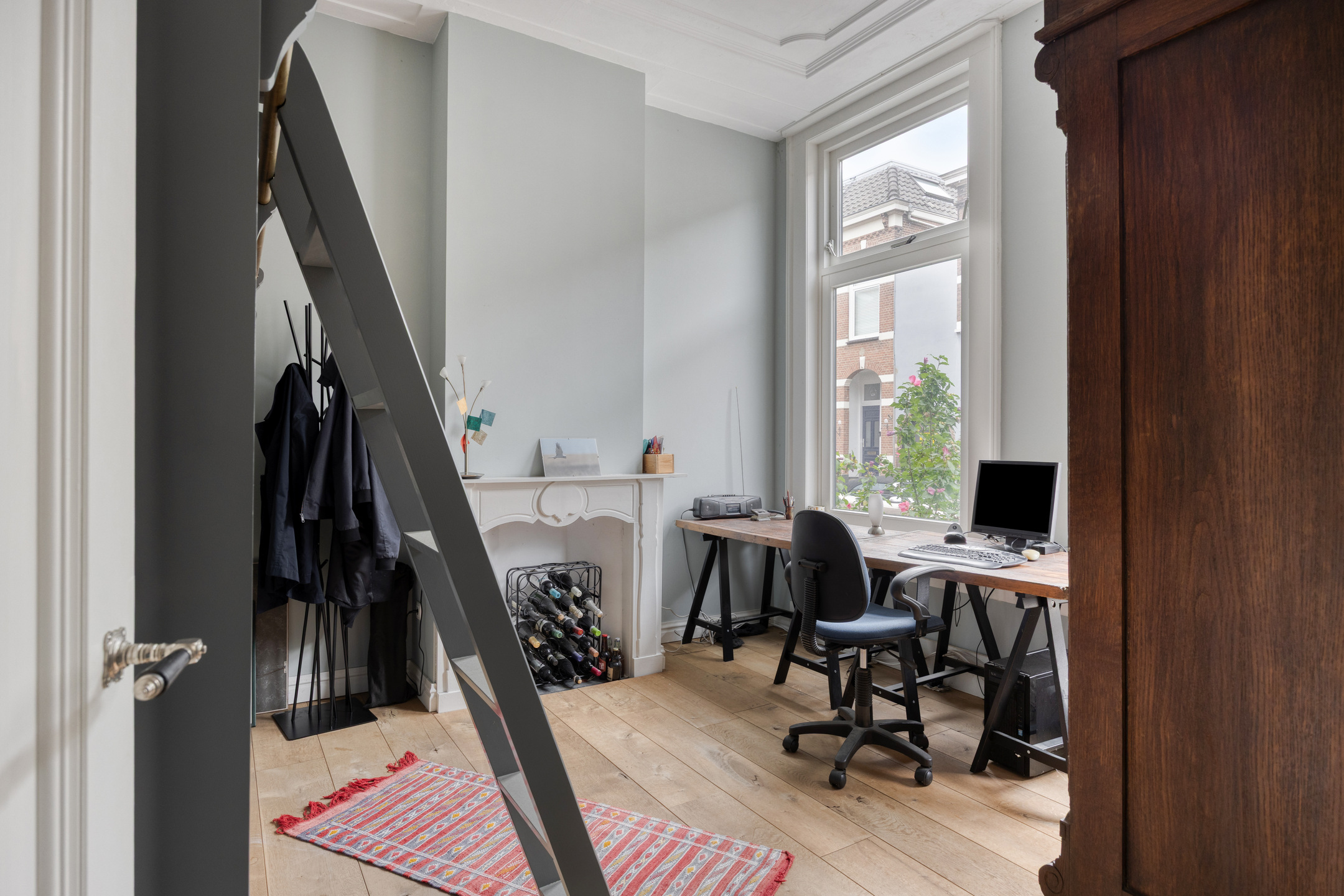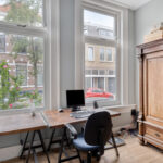 Aan de voorzijde vind je een sfeervolle slaap-/werkkamer met karakteristieke details, ideaal voor wie thuis werkt of graag een rustige plek heeft om te lezen of te slapen. Aansluitend vind je het separate toilet en toegang naar het souterrain en woongedeelte.