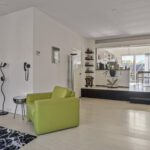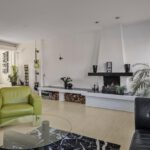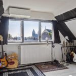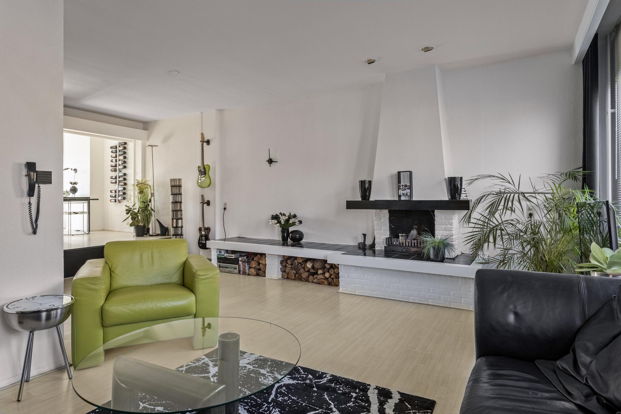 Overloop met toilet, een slaap/werkkamer, ruime lichte woonkamer met open haard en openslaande deuren naar balkon,