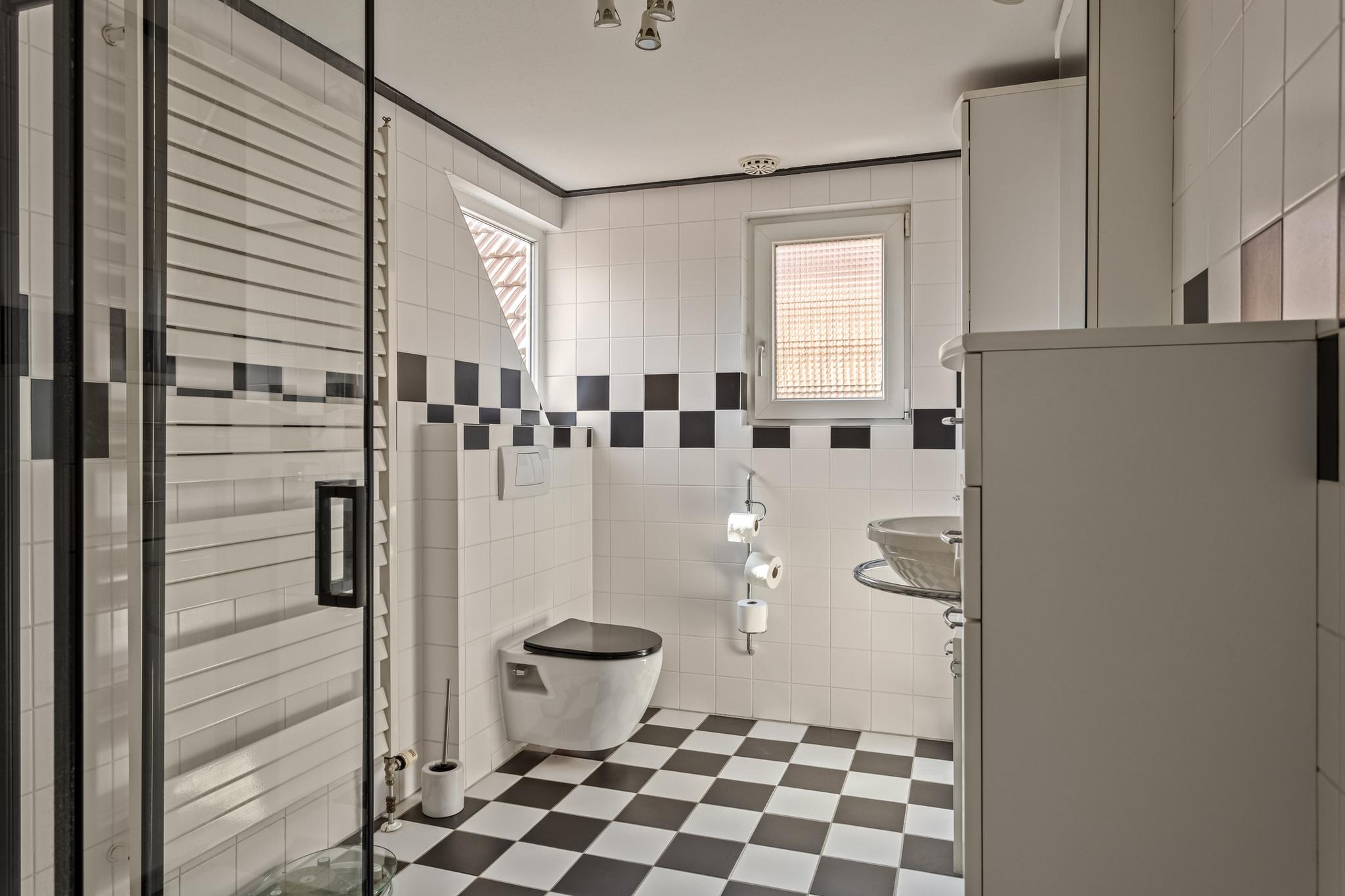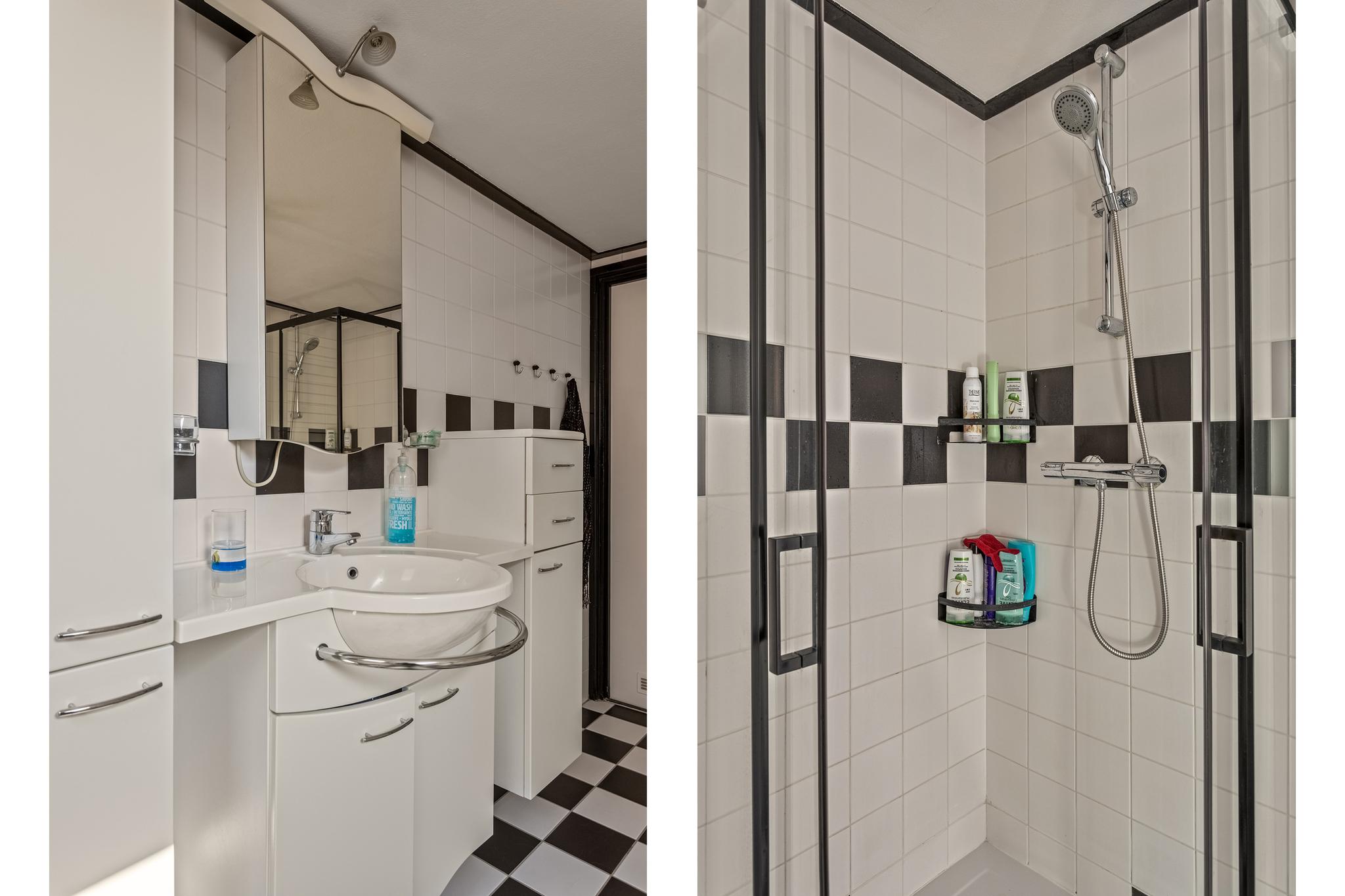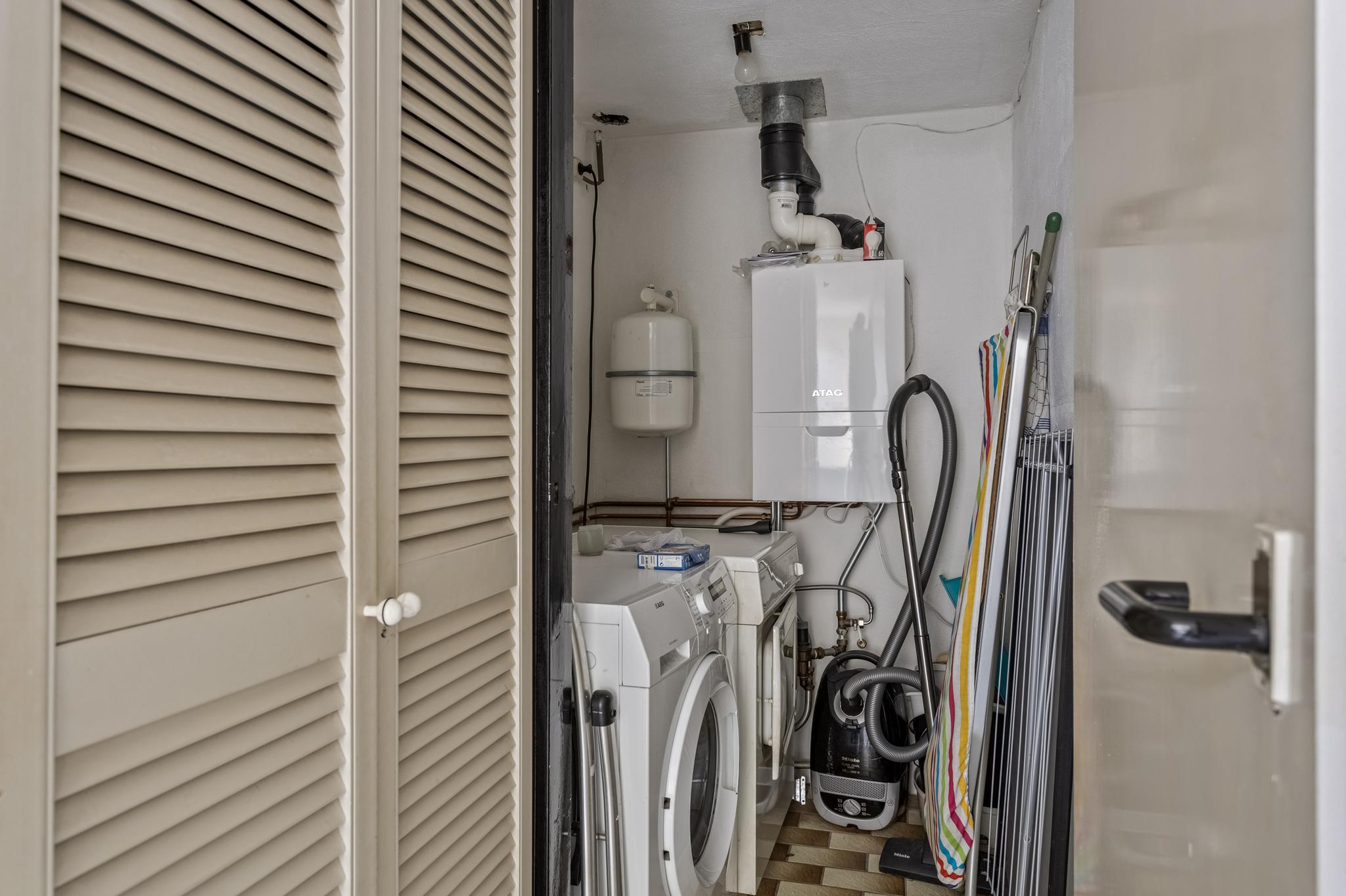 Overloop, bergkast met c.v.-installatie en plaats voor de wasmachine, 2 ruime slaapkamers en een badkamer met toilet, douche en wastafel.