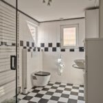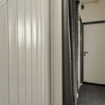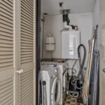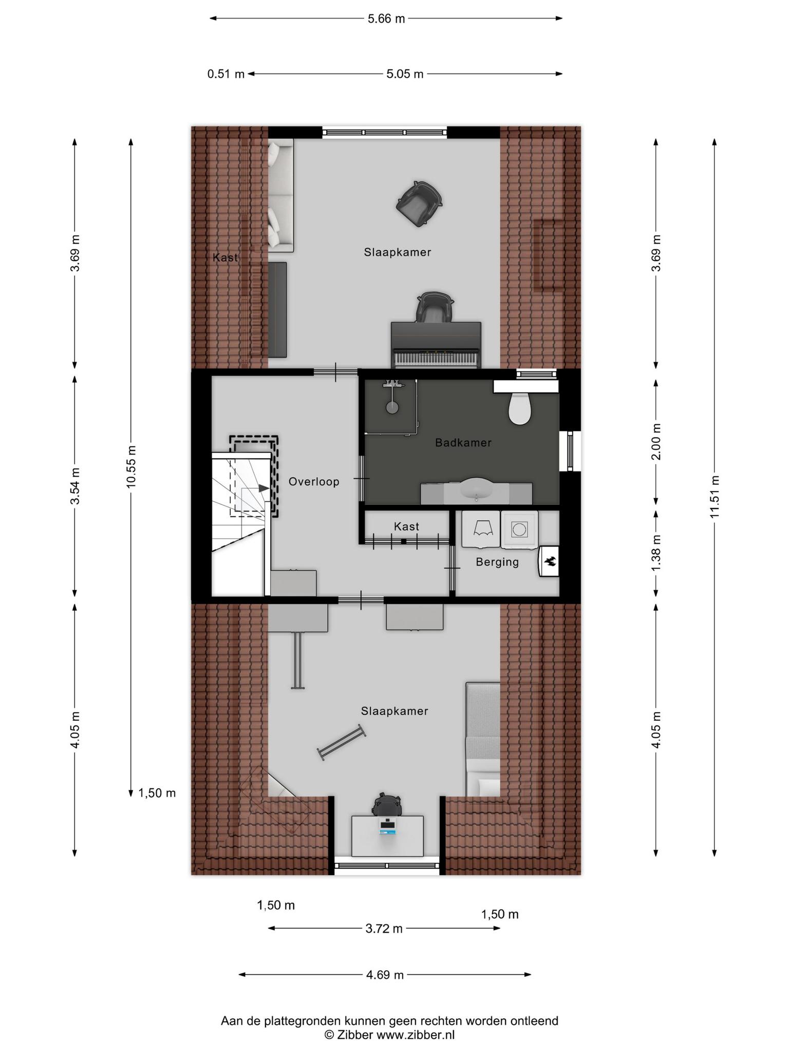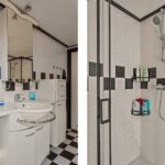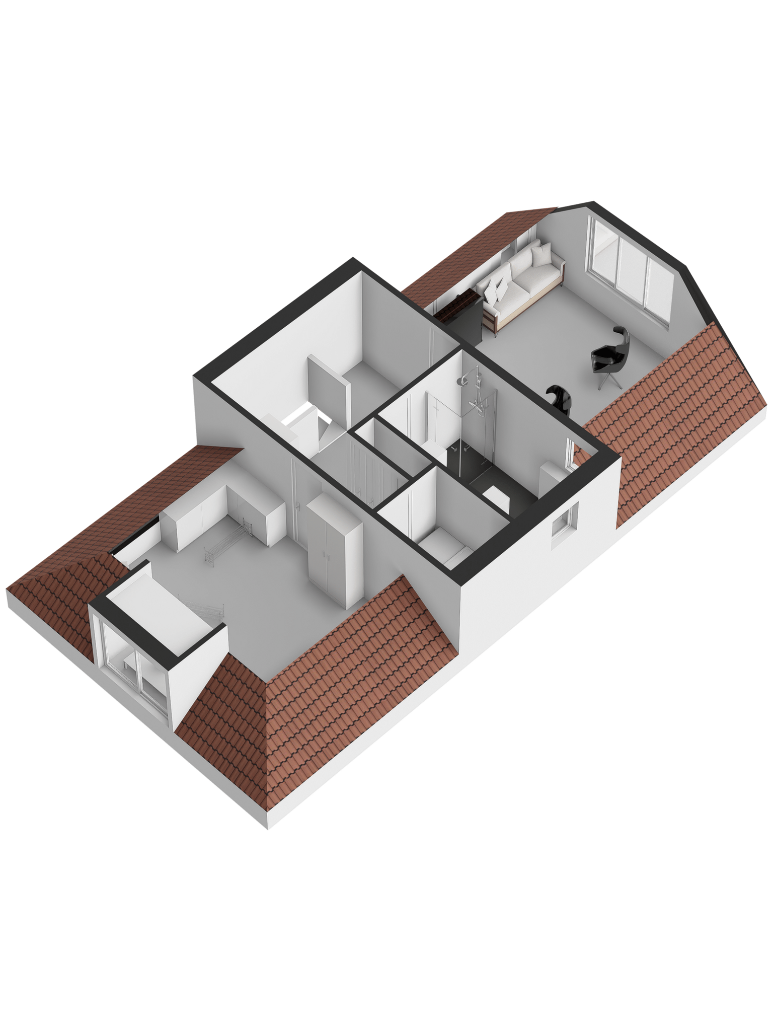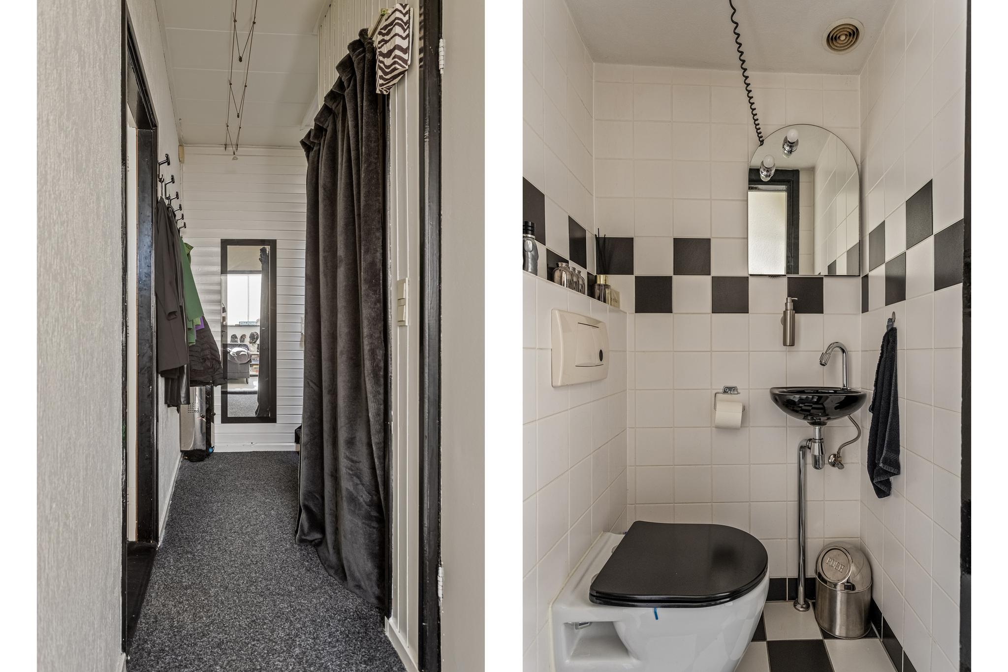 Overloop, bergkast met c.v.-installatie en plaats voor de wasmachine, 2 ruime slaapkamers en een badkamer met toilet, douche en wastafel.