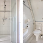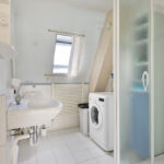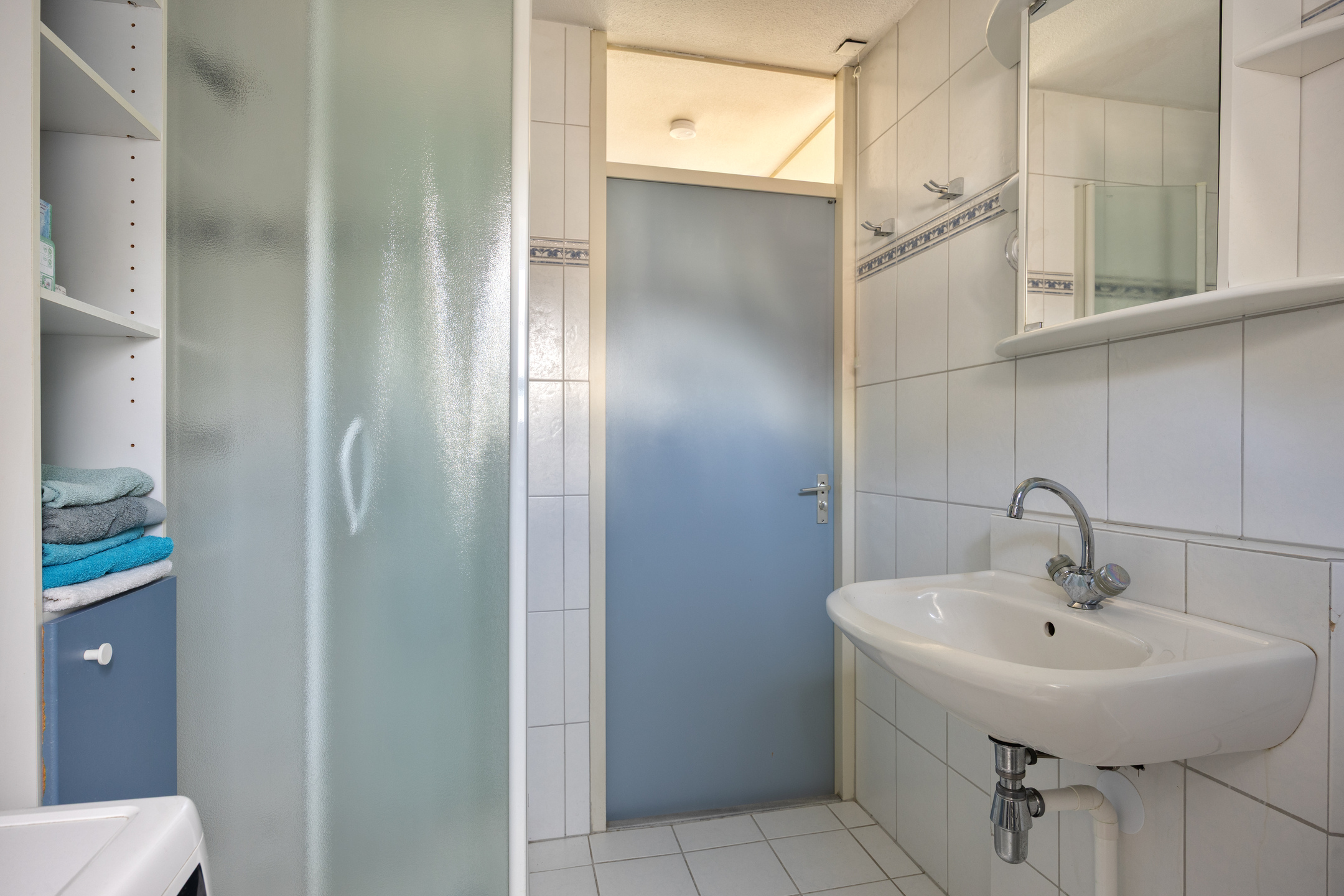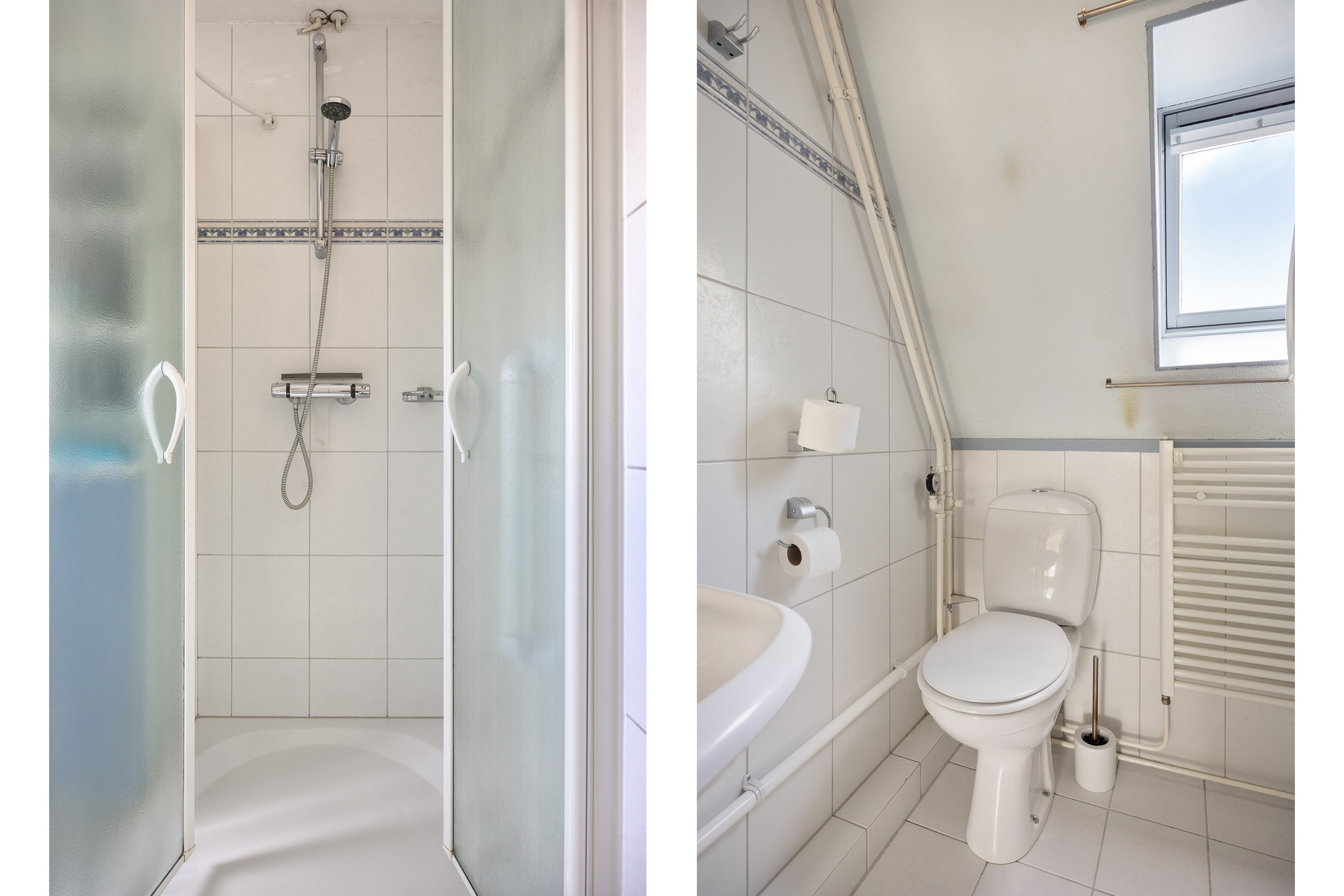 Op de eerste etage vind je drie slaapkamers en een badkamer, voorzien van een toilet, douche en wastafel. Een praktische verdieping met voldoende ruimte voor een gezin.