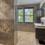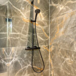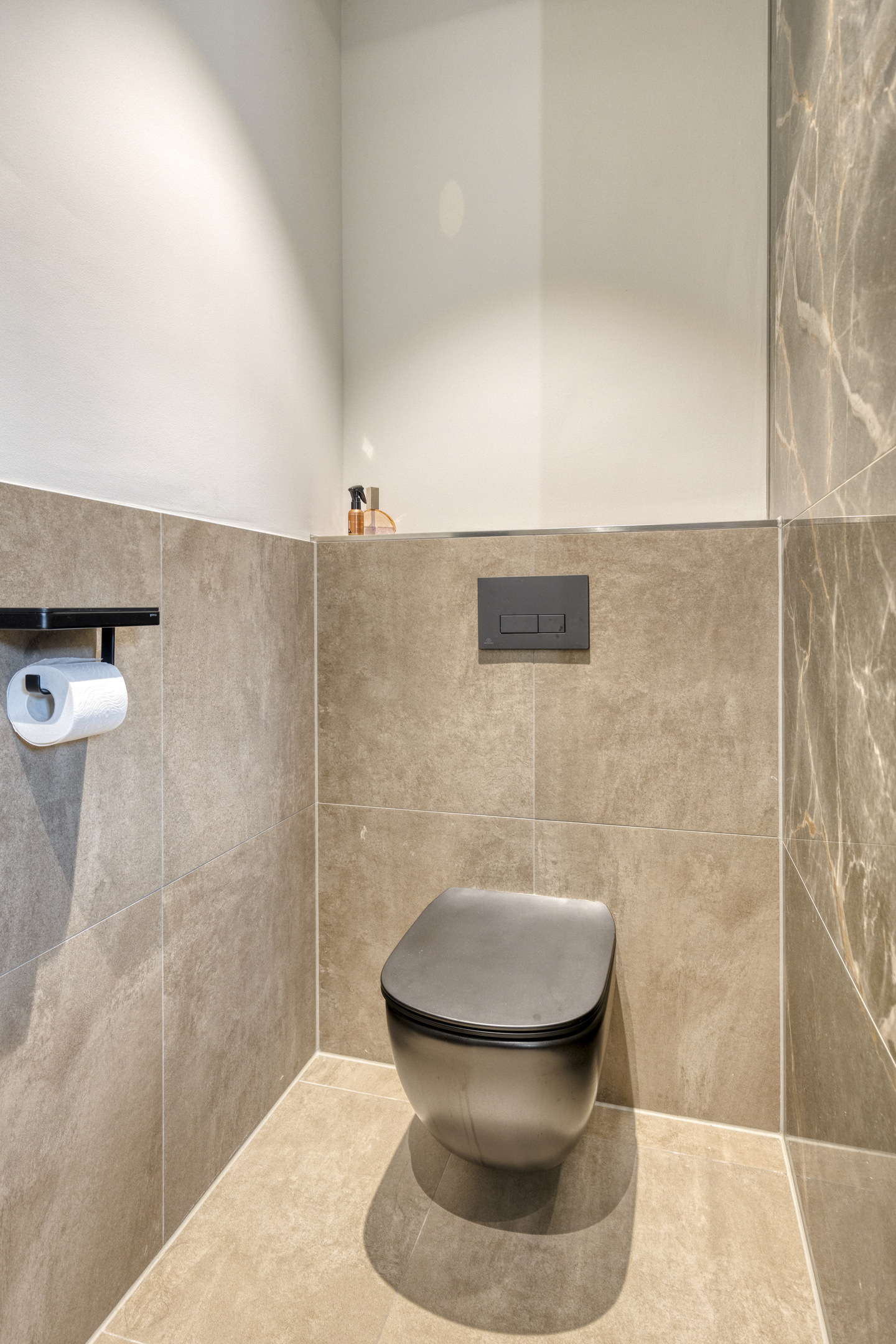 Op de 1e verdieping zijn twee grote slaapkamers (met de mogelijkheid tot het maken van drie slaapkamers). In beide kamers is dus plaats voldoende voor een tweepersoonsbed en kledingkast, maar gebruik als werkkamer of atelier is ook een optie. In de masterbedroom is een prachtige op maat gemaakte inbouwkast, welke veel opbergmogelijkheden geeft. De moderne badkamer is ook lekker ruim en voorzien van een inloopdouche, wastafel en 2e toilet. Op de vloer liggen betonlook tegels, de wanden zijn ook daarmee betegeld met een deel marmer look.
