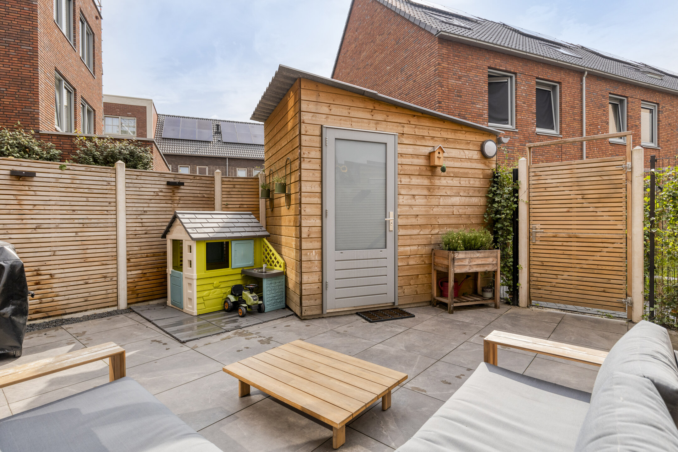De tuin achter het huis is al net zo netjes als het huis. Hij is onderhoudsarm, want grotendeels bestraat met grote donkergrijze betontegels. Achterin de tuin staat een met hout beklede berging voor je fietsen en tuinspullen.