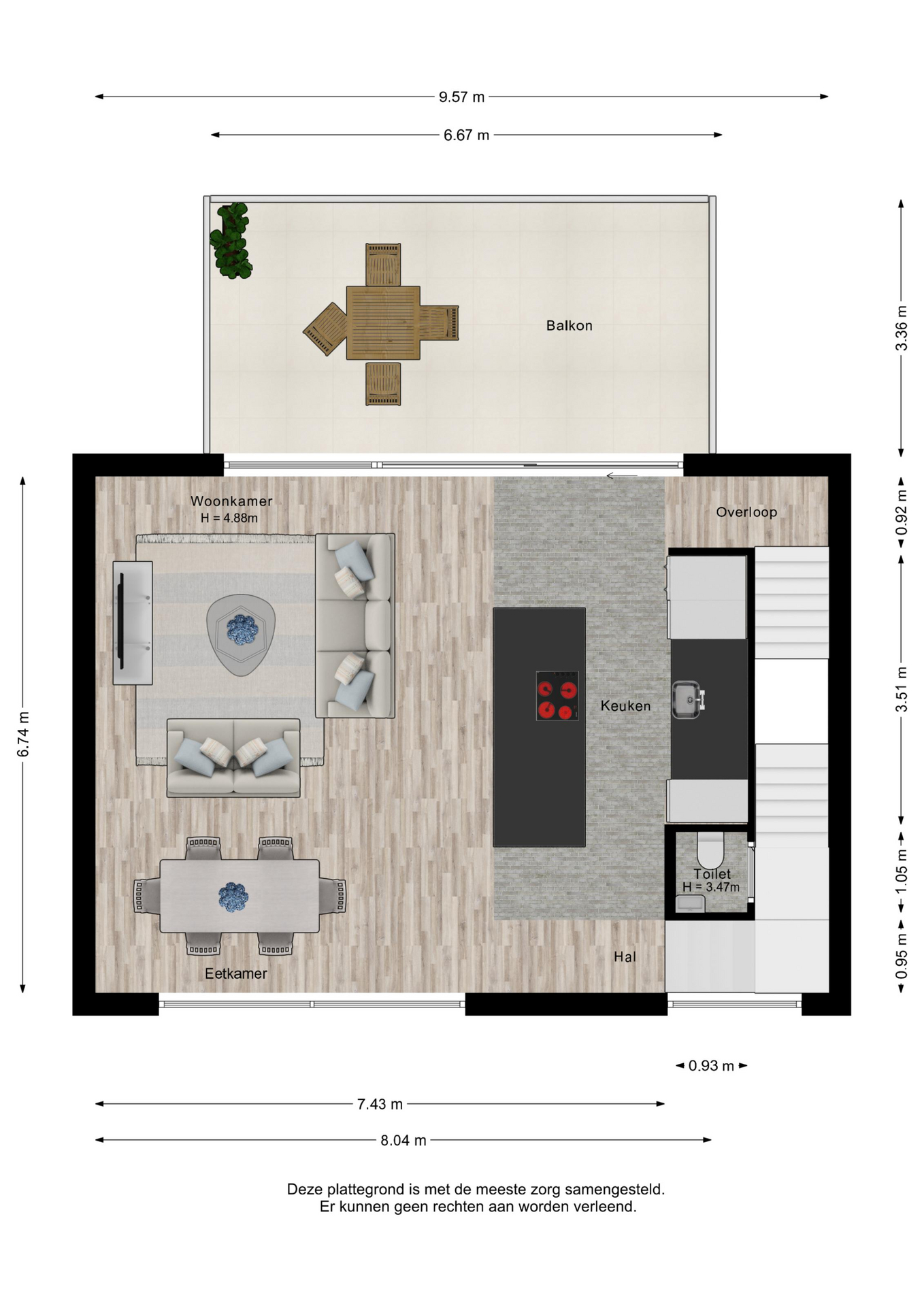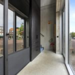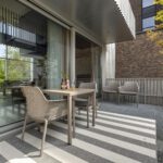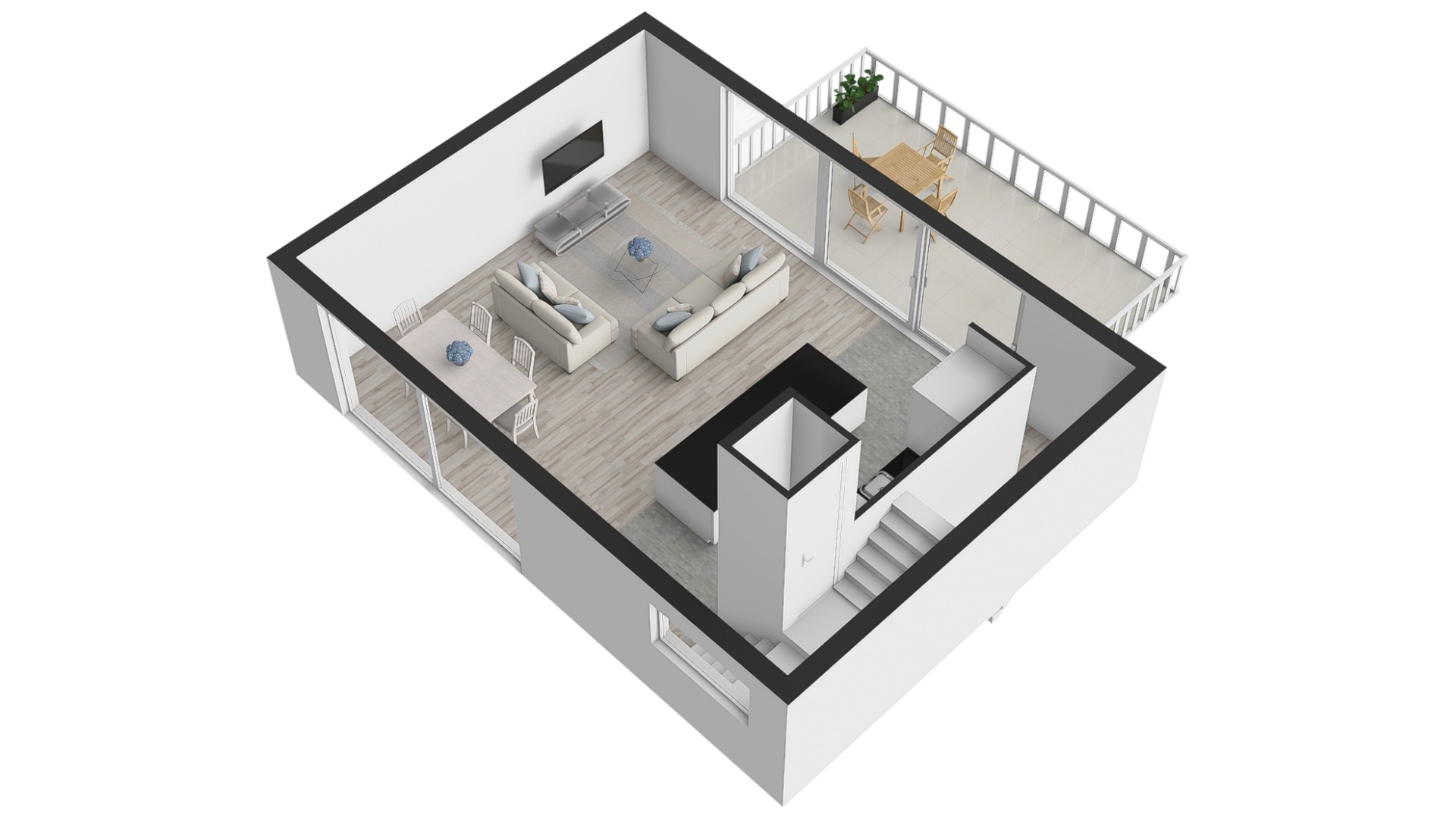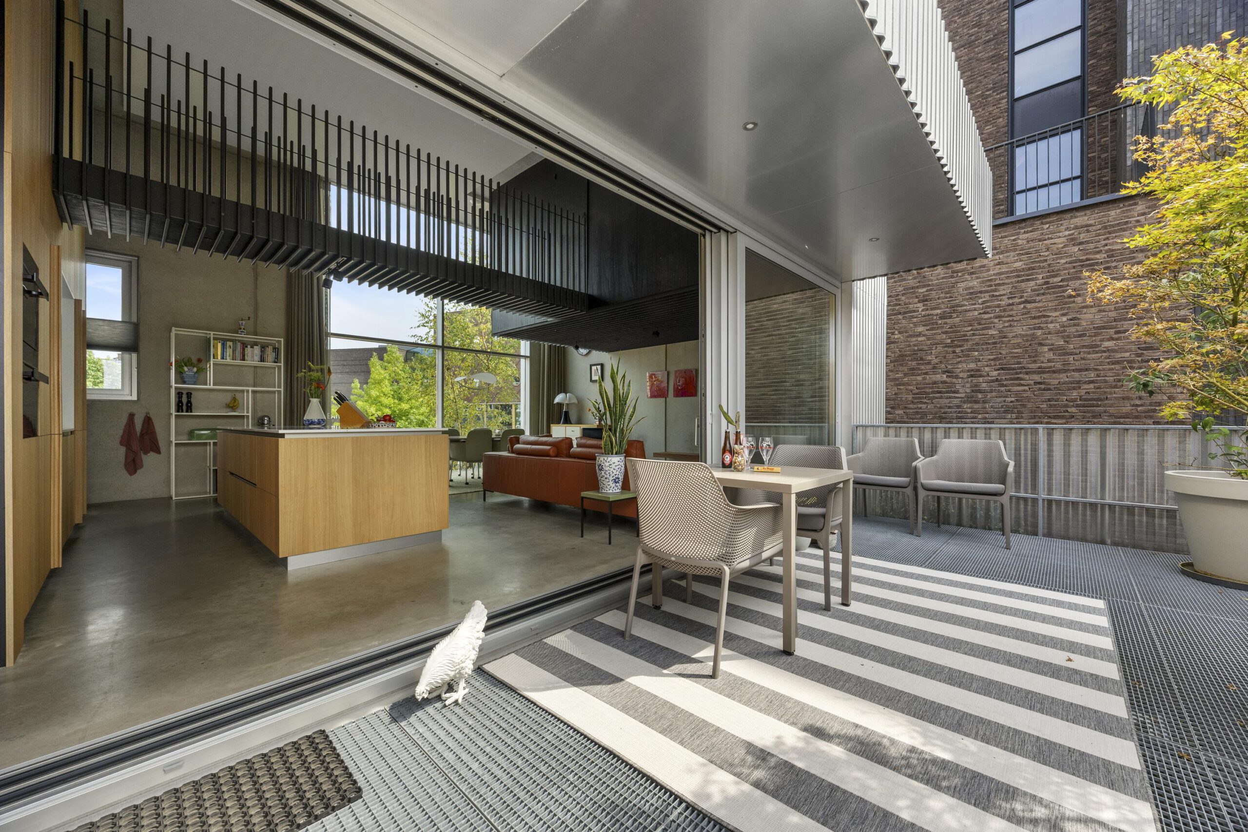 De schuifdeuren aan de achterzijde kunnen helemaal open en bieden toegang tot een riant balkon op het zuiden. Zomers voeg je zo dik 20m2 toe aan je woonkamer.