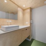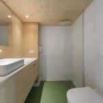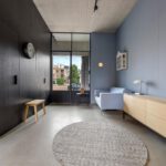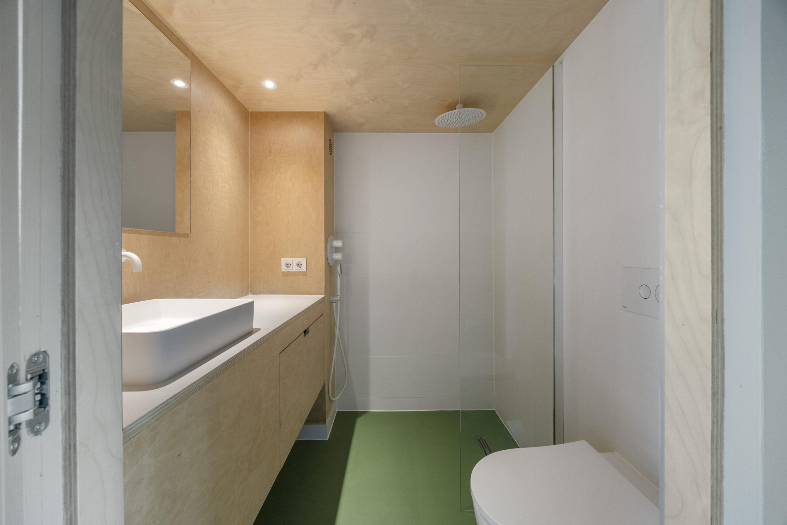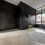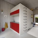 In plaats van traditionele kamers heeft deze woning open, veelzijdige leefruimtes die met elkaar in verbinding staan. Het zwart geschilderde maatwerkmeubel, uitgevoerd in houtskeletbouw, herbergt de trap, twee toiletten, de keuken, de wasopstelling en de technische installaties. De woning is eenvoudig aan te passen aan andere woonwensen. Het trappenhuis is er als het ware omheen gevouwen, met metalen treden die los in de muren zijn bevestigd.