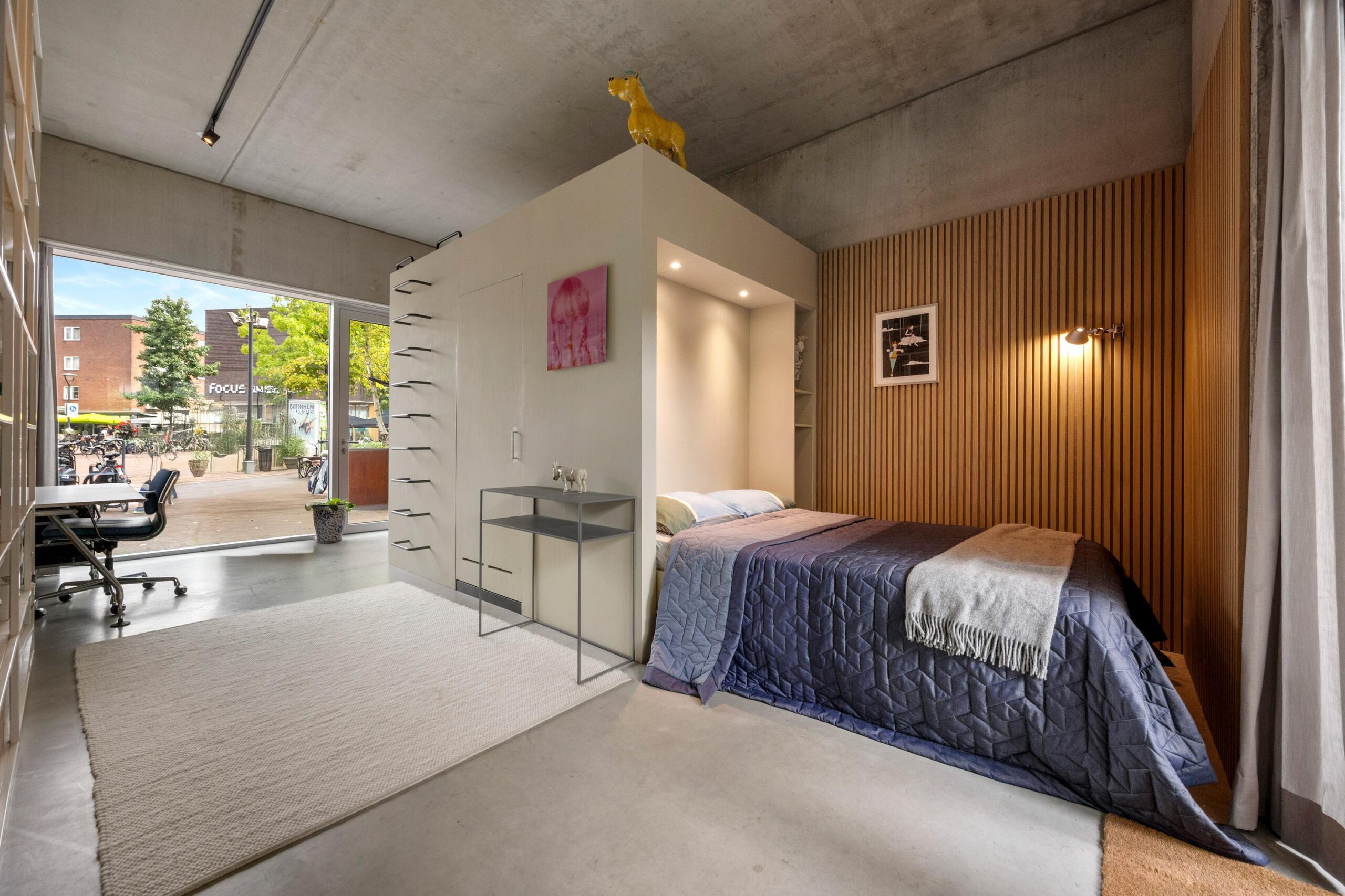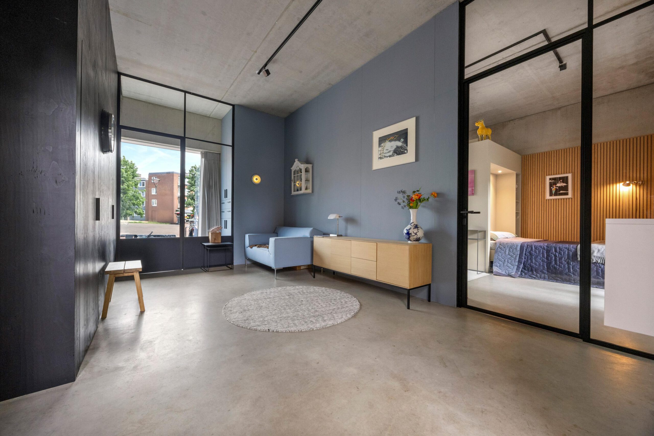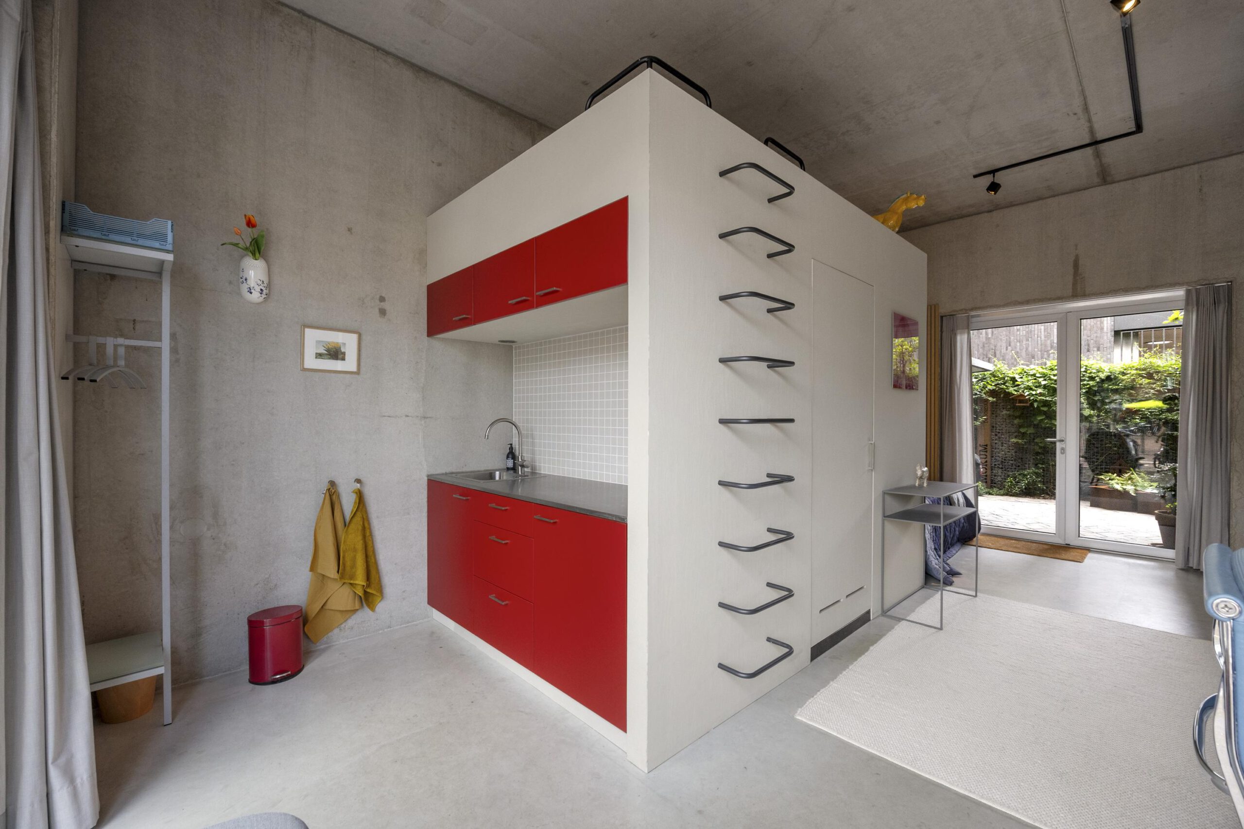 Bedrijfsruimte met plafondhoogte van ruim 3 meter. In deze open ruimte is een meubel geplaatst met badkamer met toilet en moderne pantry. Slapen kan op hoogte of in het ruime opklapbed. De eerste bewoners gebruikten de ruimte als B&B. Het heeft een eigen ingang en toegang tot de tuin aan de achterzijde.