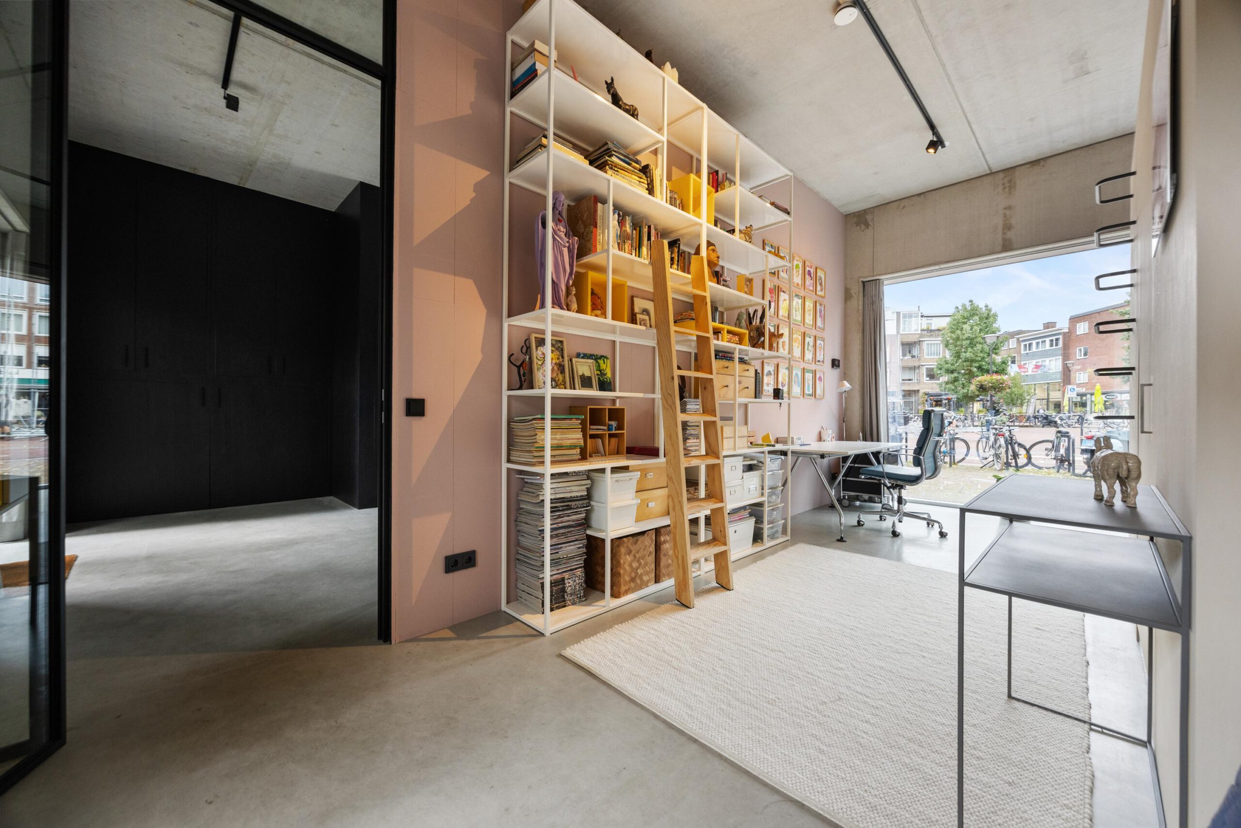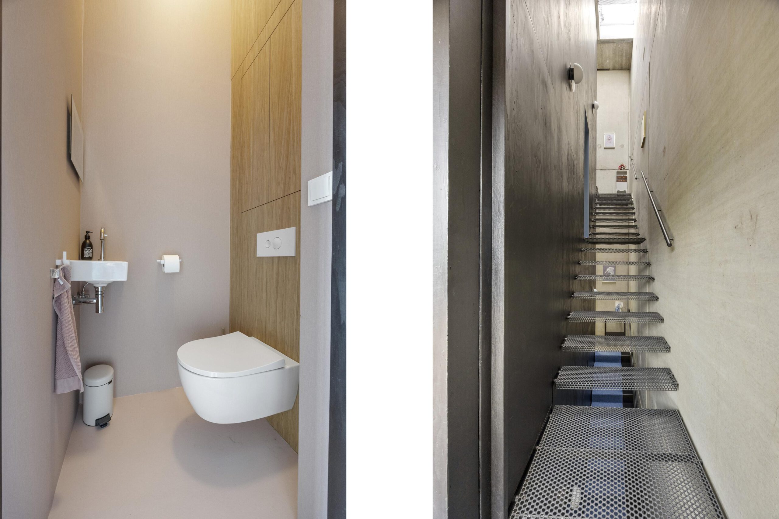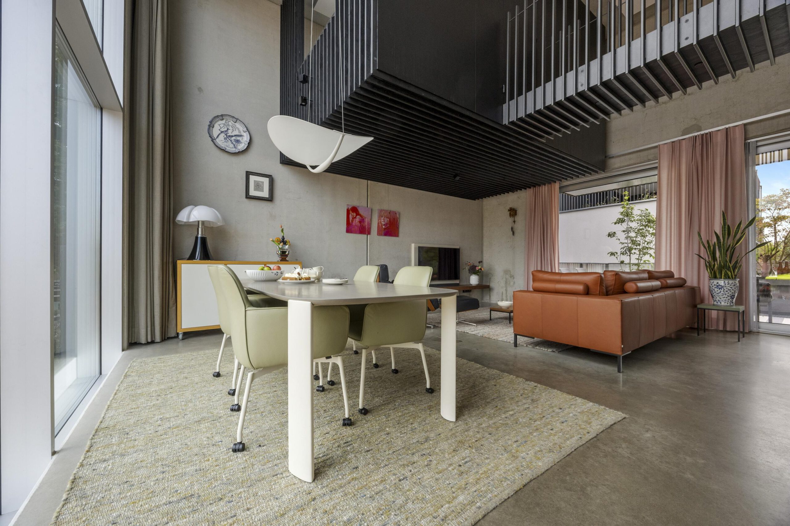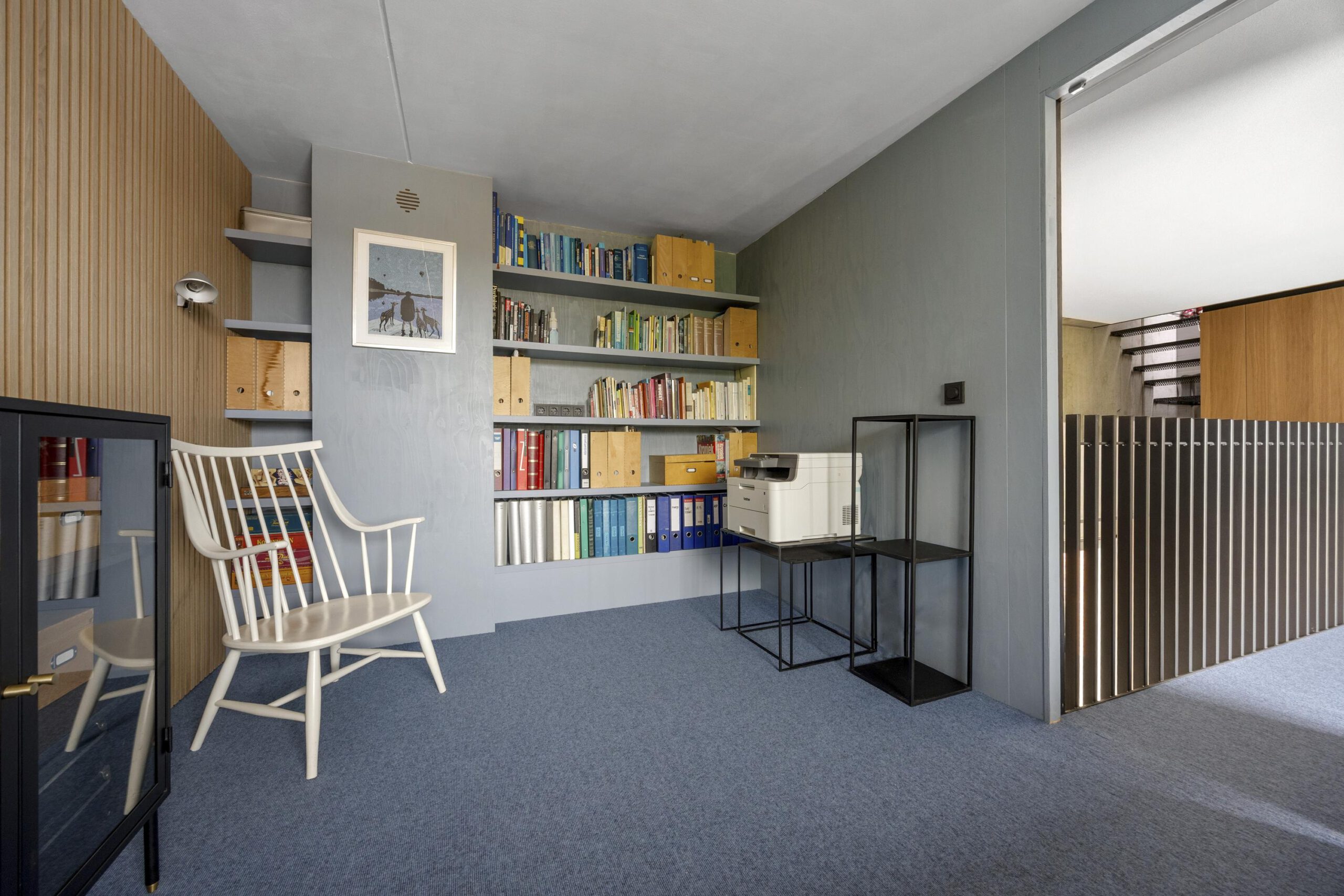 De naastgelegen multifunctionele ruimte is voorzien van plafondhoge inbouwkasten, een technische ruimte met bodemwarmtepomp en boiler en toegang tot de eigen tuin. De industriële maatwerkdeur verbindt de twee losse ruimtes.