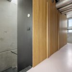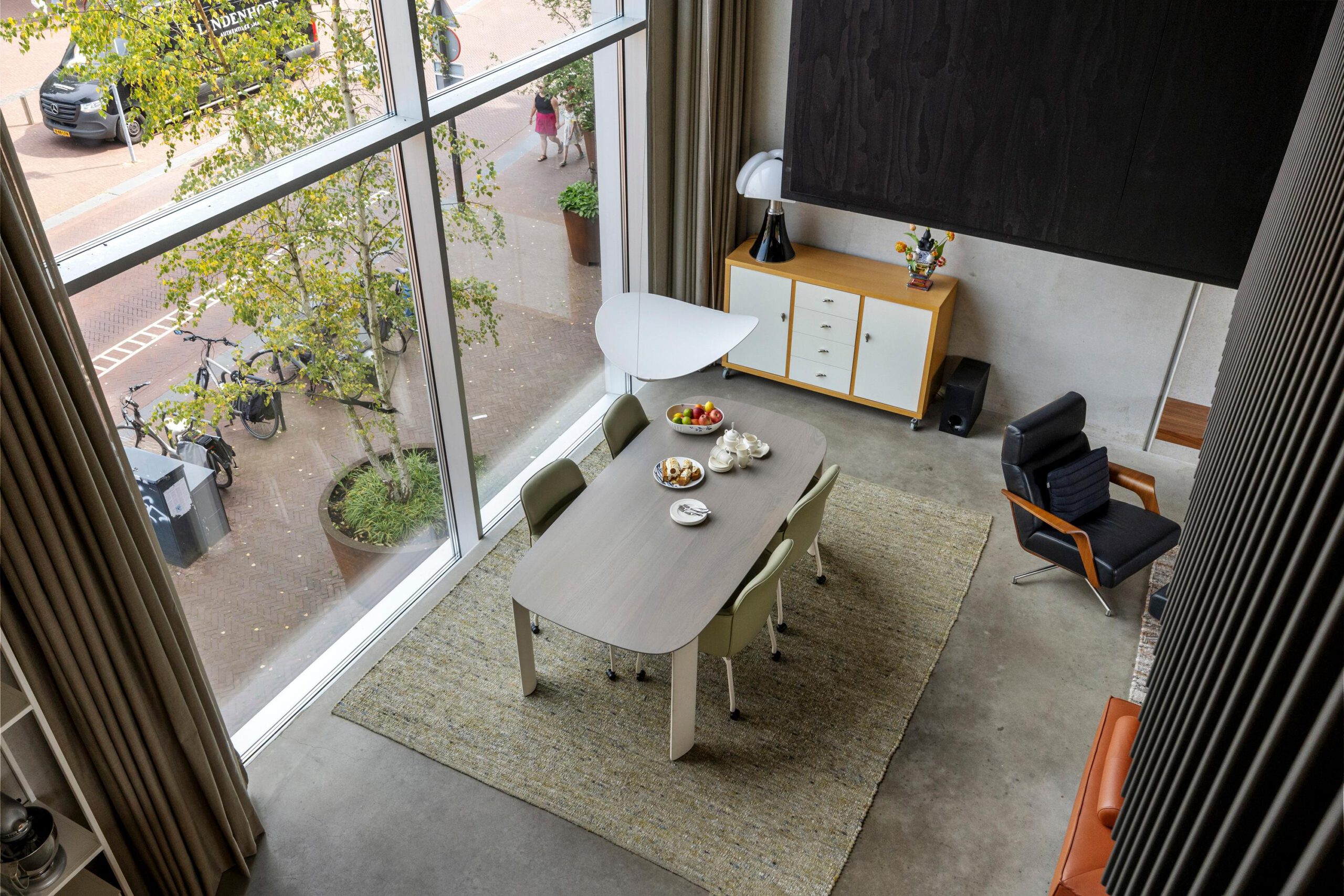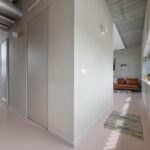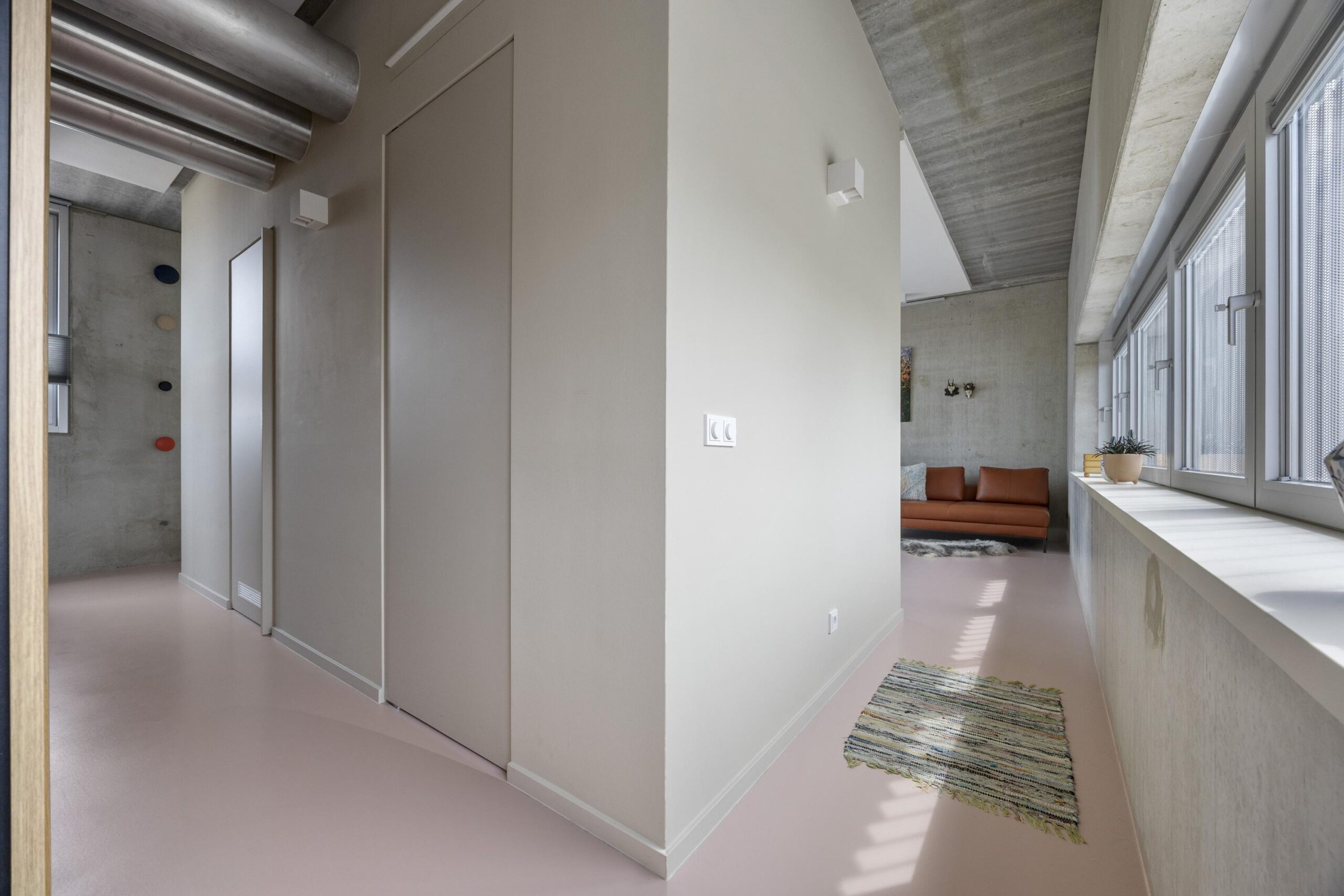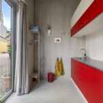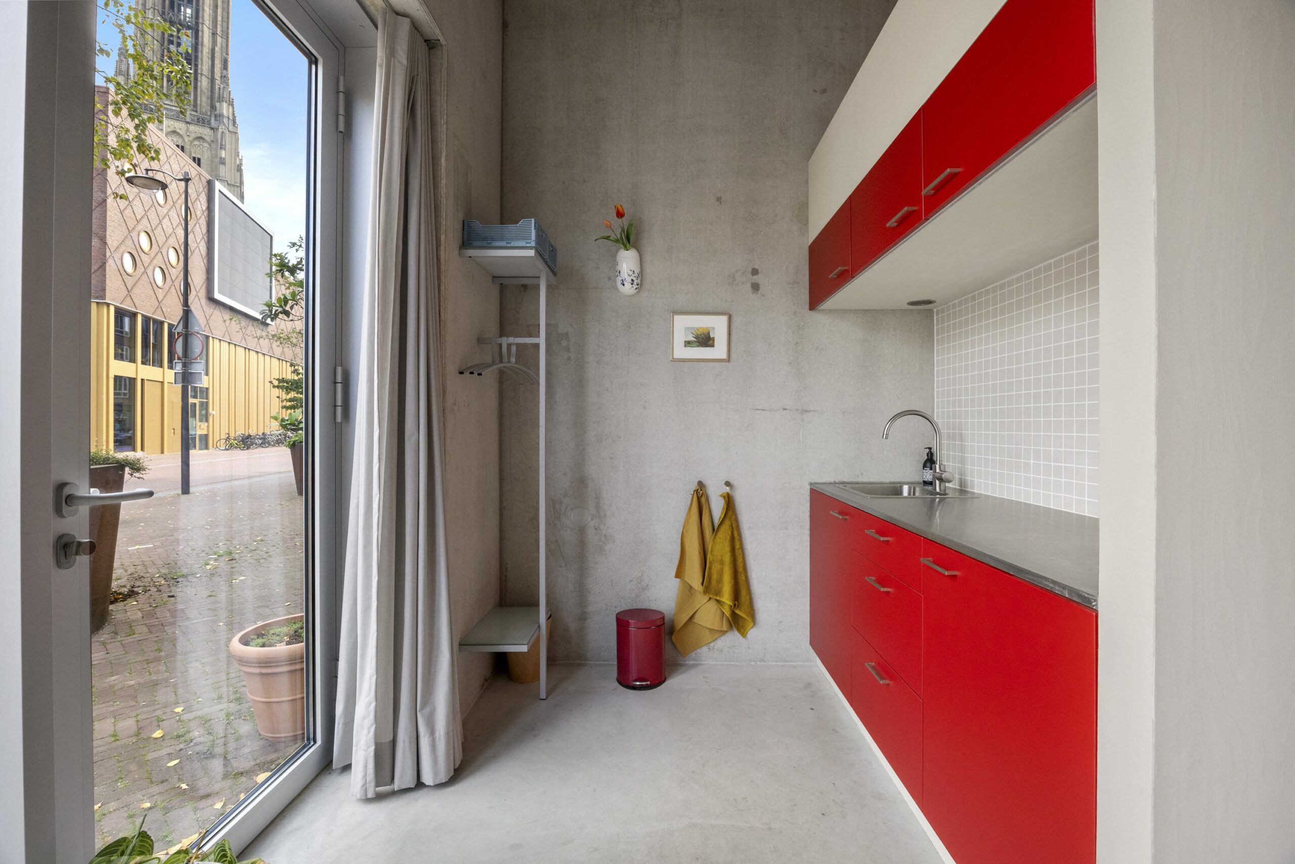 De naastgelegen multifunctionele ruimte is voorzien van plafondhoge inbouwkasten, een technische ruimte met bodemwarmtepomp en boiler en toegang tot de eigen tuin. De industriële maatwerkdeur verbindt de twee losse ruimtes.