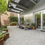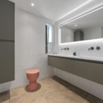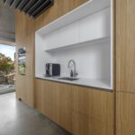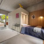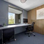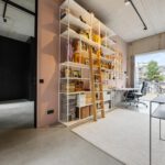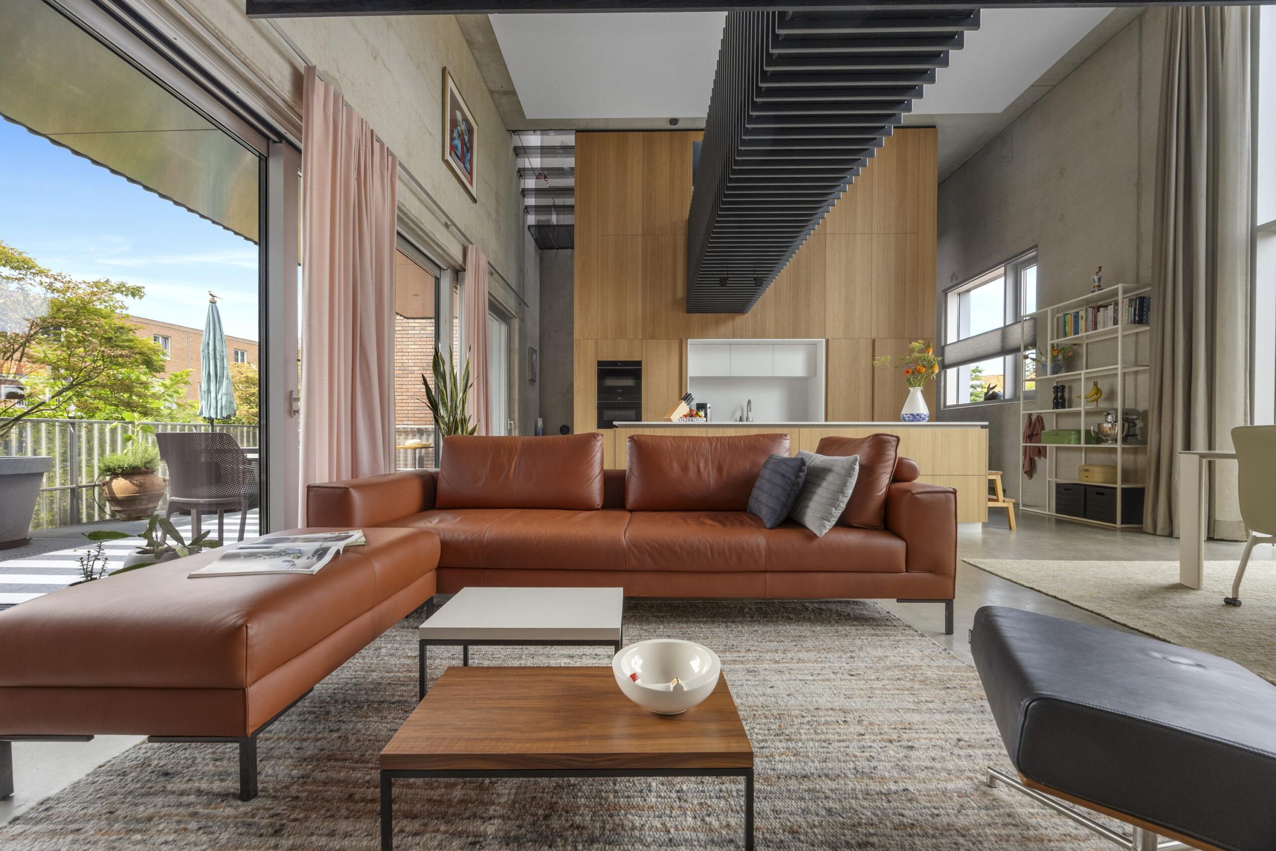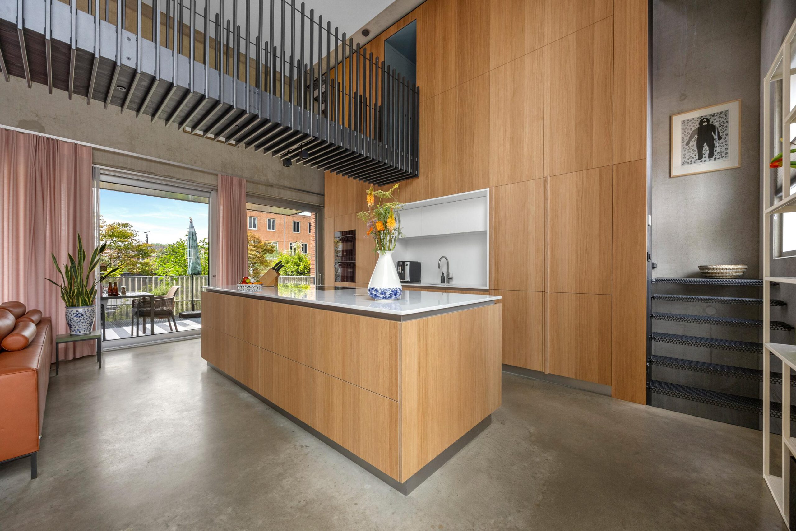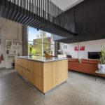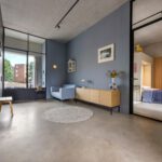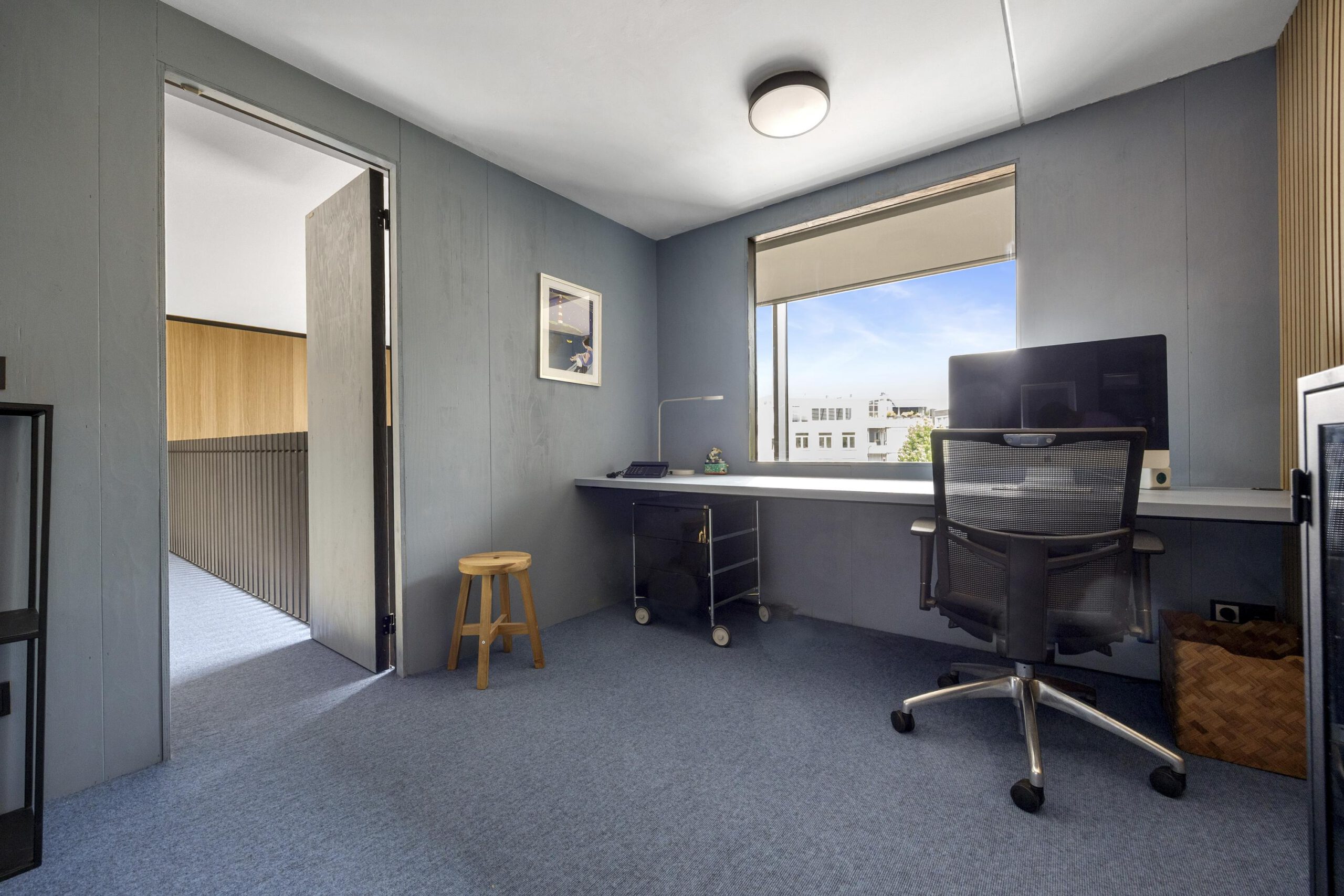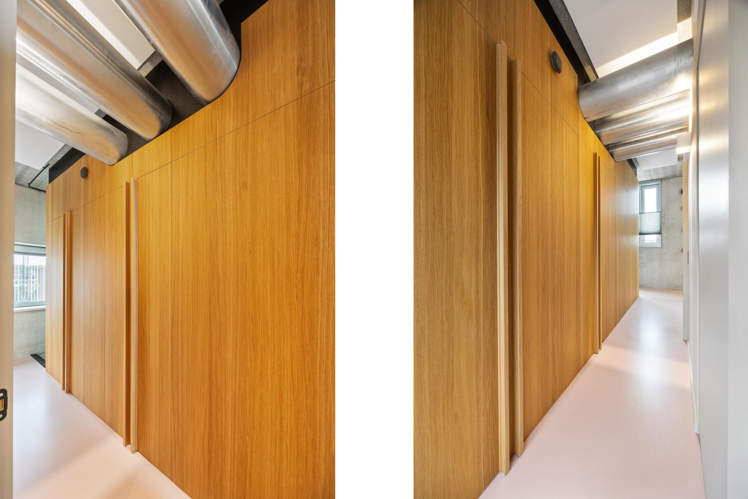 De naastgelegen multifunctionele ruimte is voorzien van plafondhoge inbouwkasten, een technische ruimte met bodemwarmtepomp en boiler en toegang tot de eigen tuin. De industriële maatwerkdeur verbindt de twee losse ruimtes.