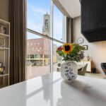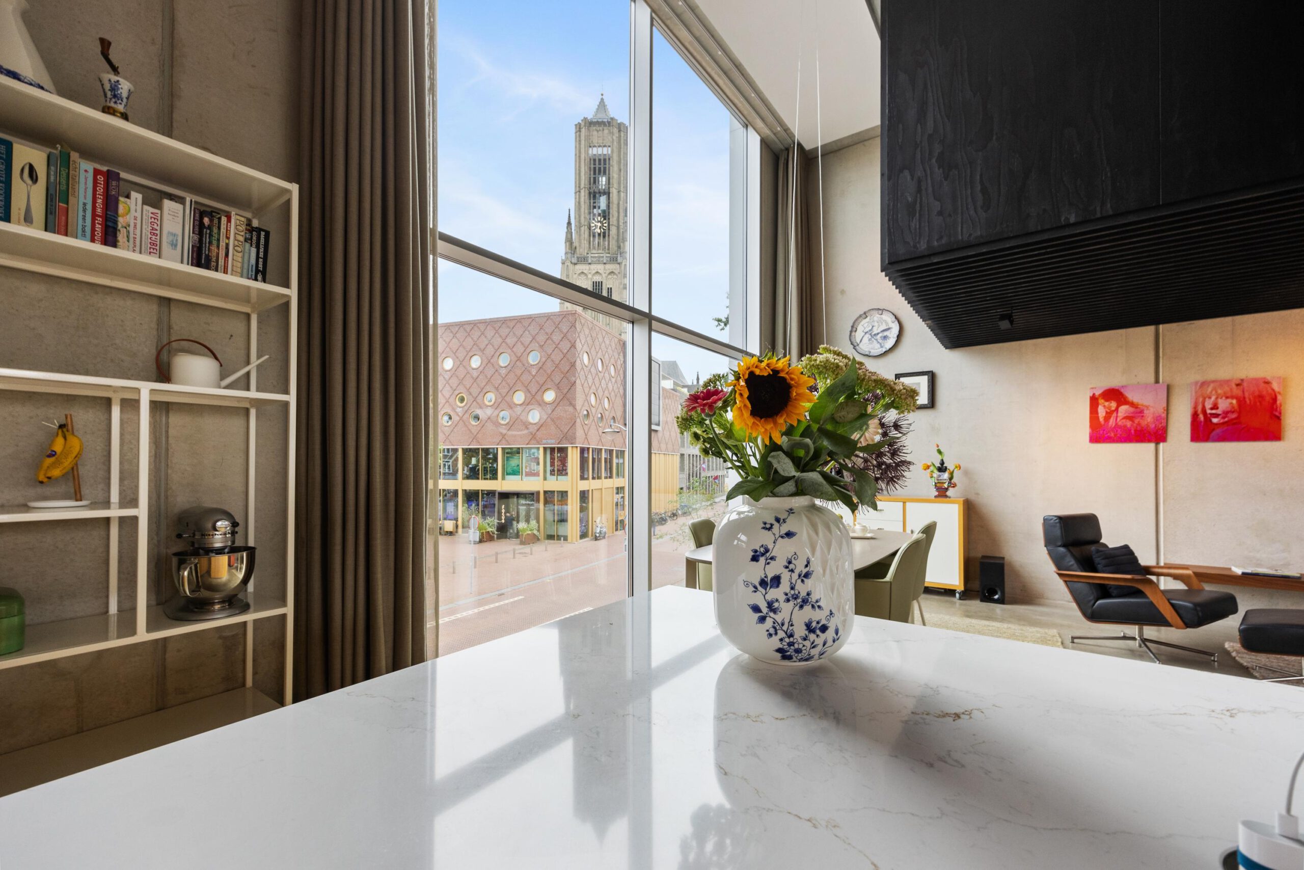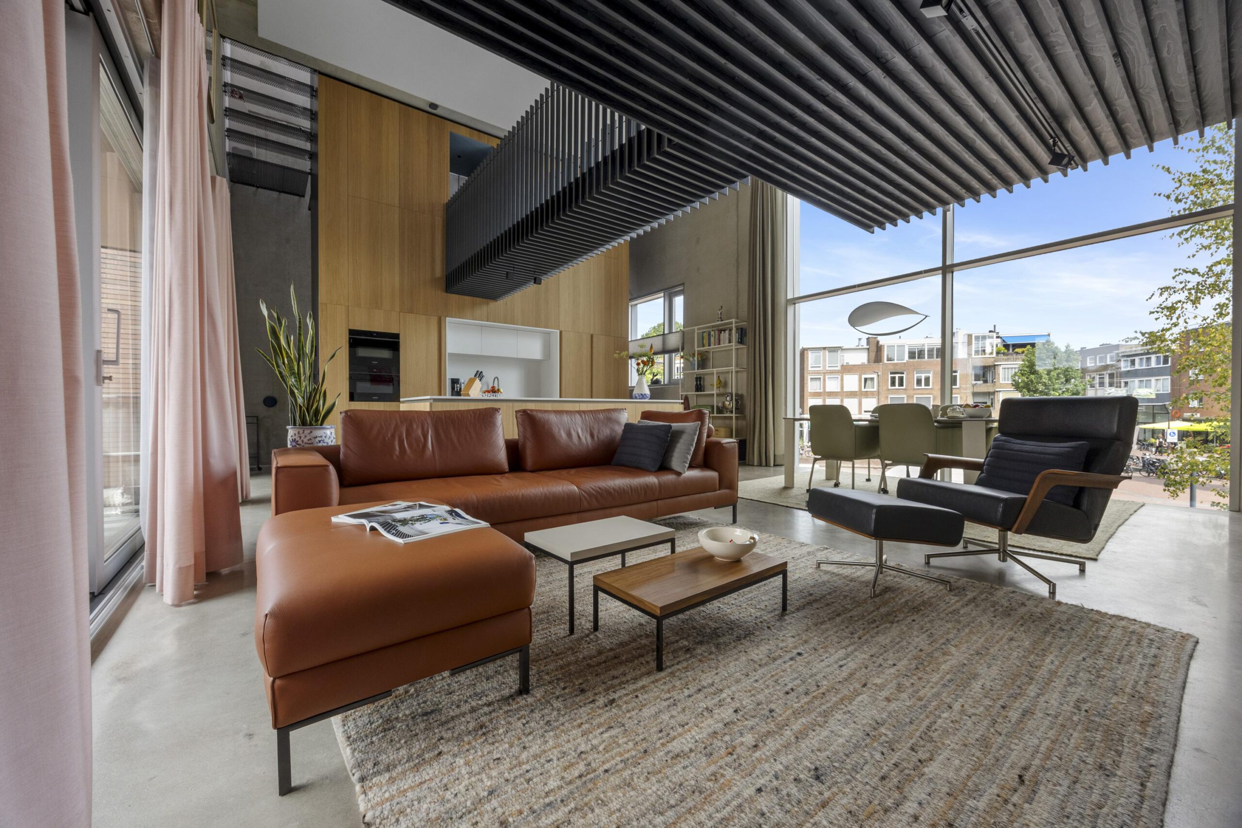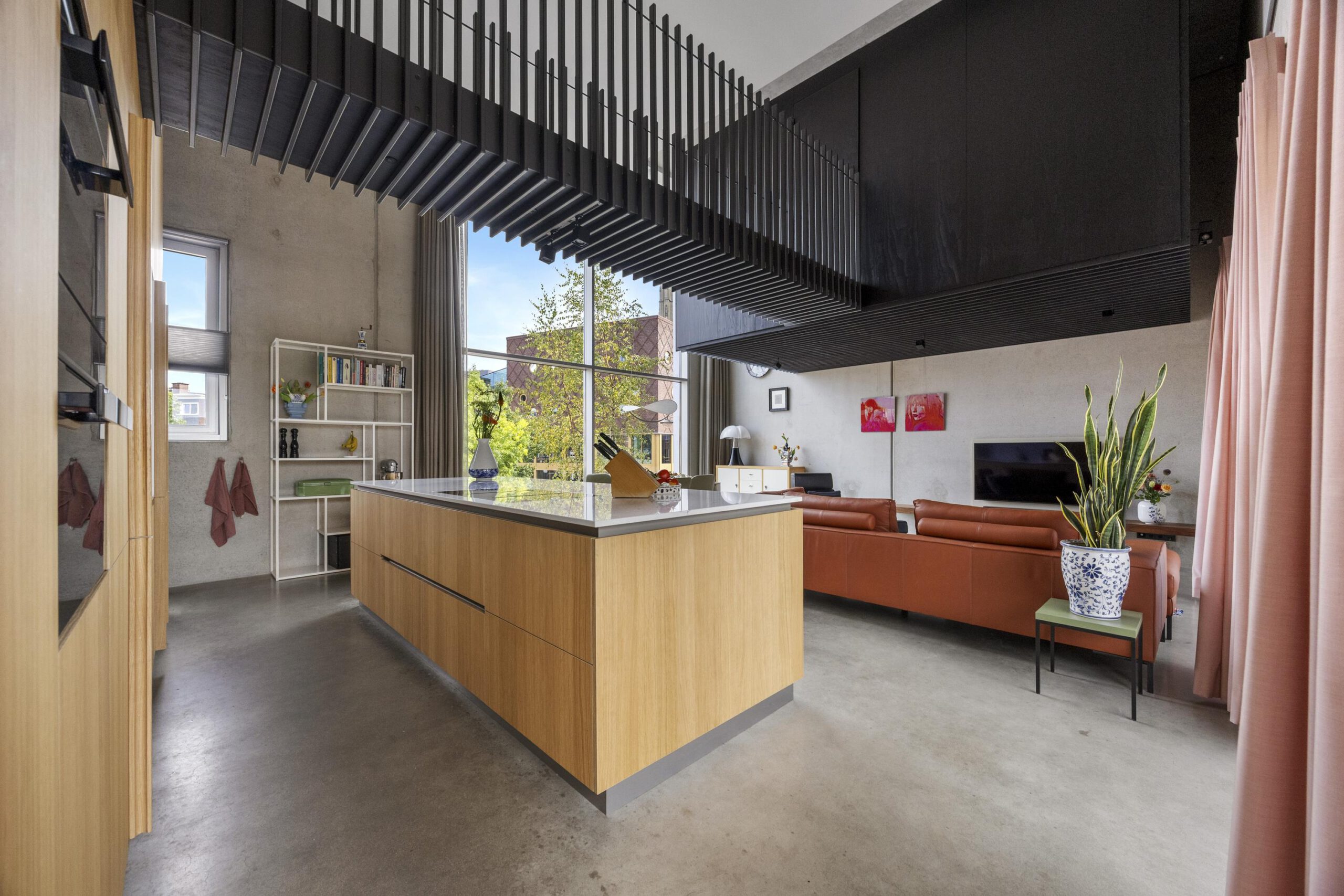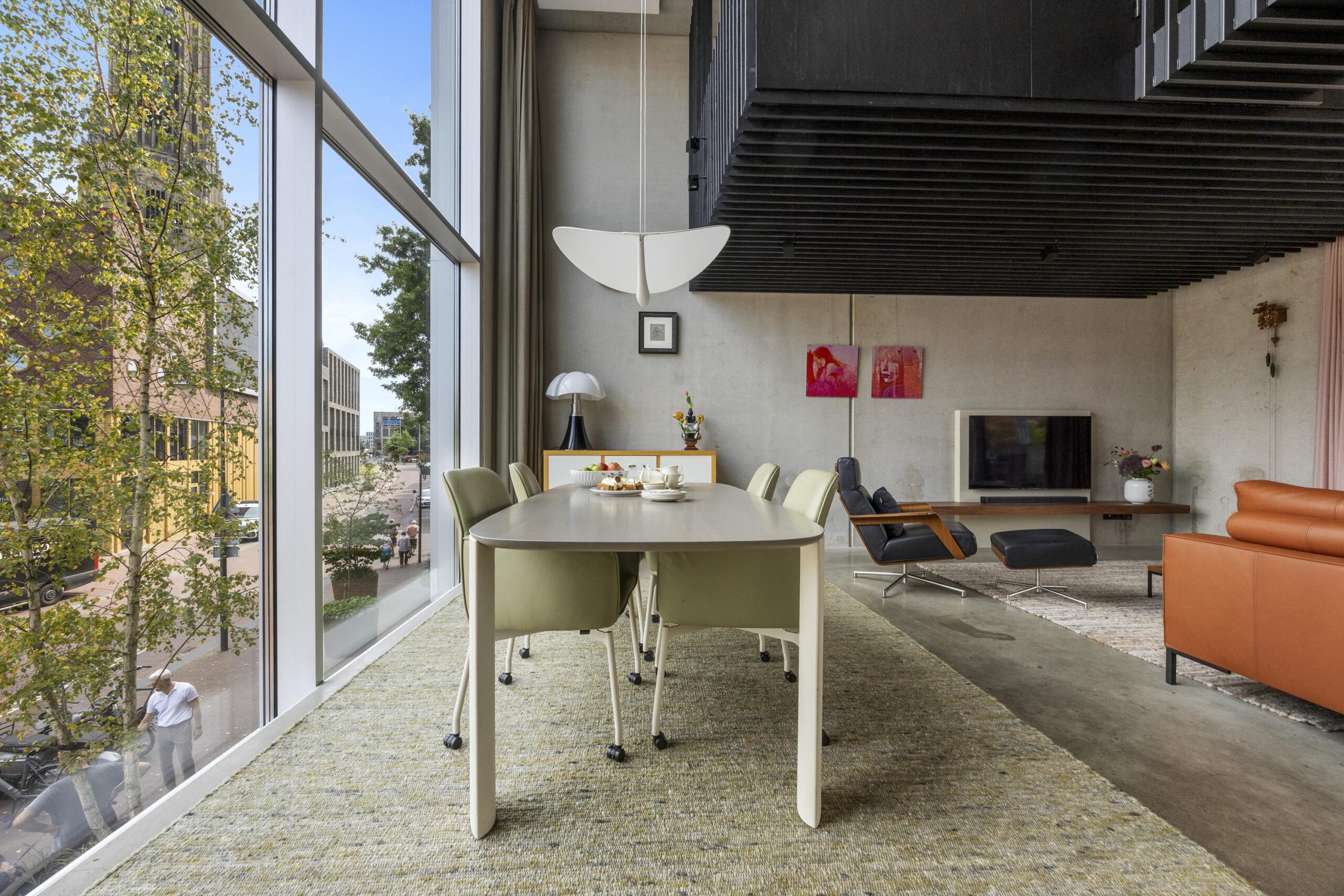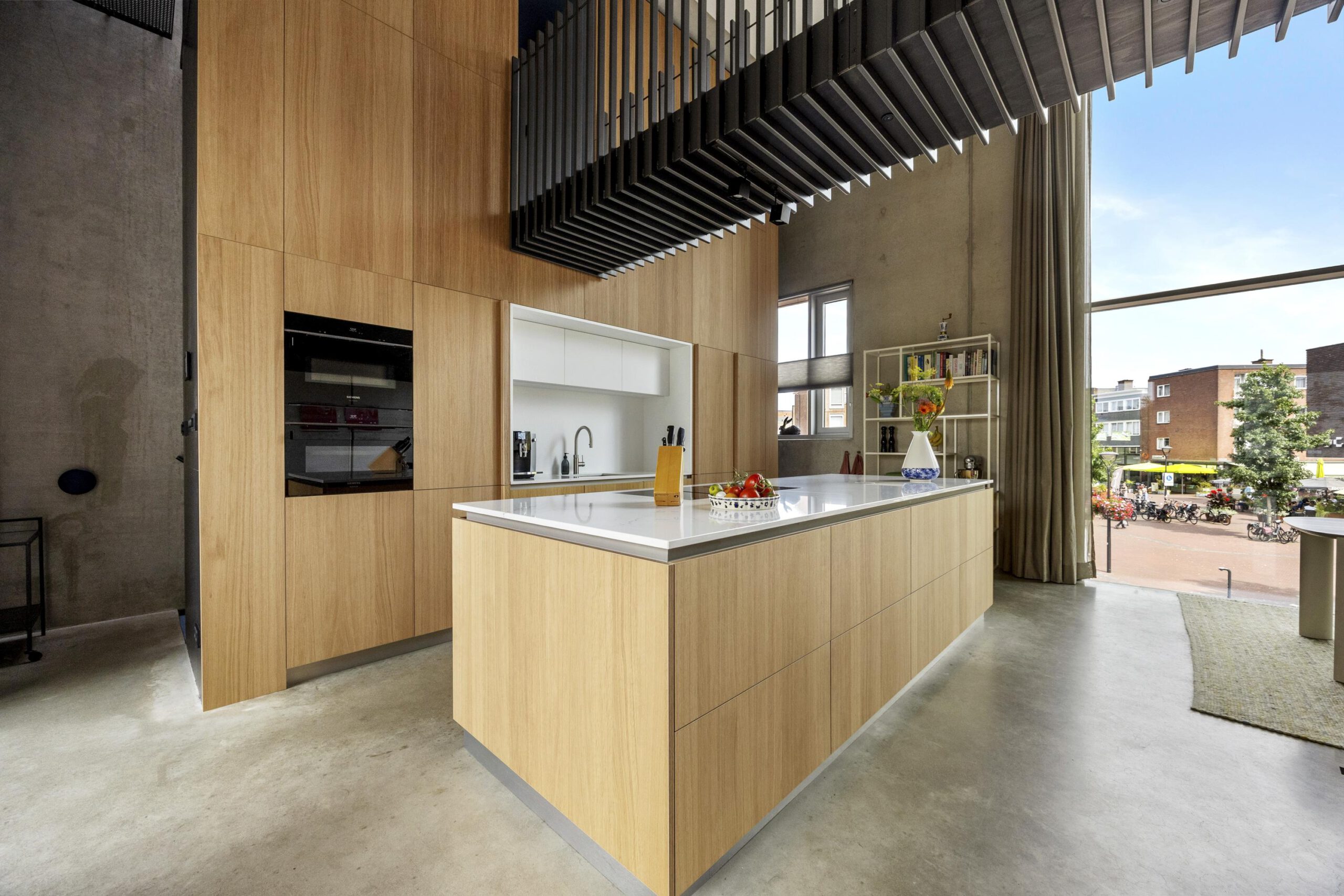 Via de entree/ hal en een prachtige houten trap bereik je de woonkamer waar het daglicht door de grote raampartijen aan weerszijden rijkelijk binnenvalt. Het raam aan de pleinzijde is maar liefst 5 meter hoog. Hier schuift de stad letterlijk aan je voorbij en zit je eersterangs met Koningsdag, straatfestivals of gewoon een zomerse terrasdag. In 2024 is een volledig op maat gemaakte keuken met ruim kookeiland geplaatst met Siemens inbouwapparatuur en Quooker. De woonkamer heeft een akoestisch plafond.