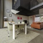 Bijzonder aan de woonkamer is de fraaie stalen loopbrug naar de zwarte ‘hangende’ werkkamer aan het hoge plafond.