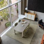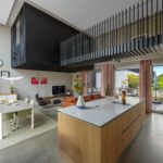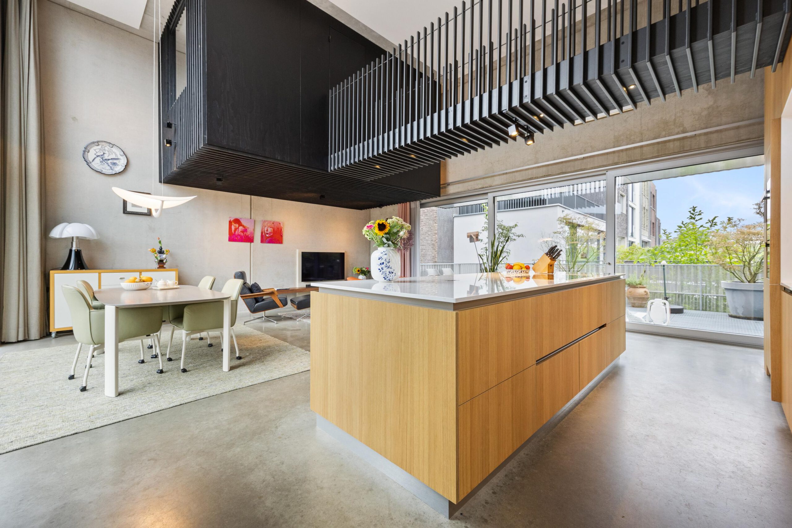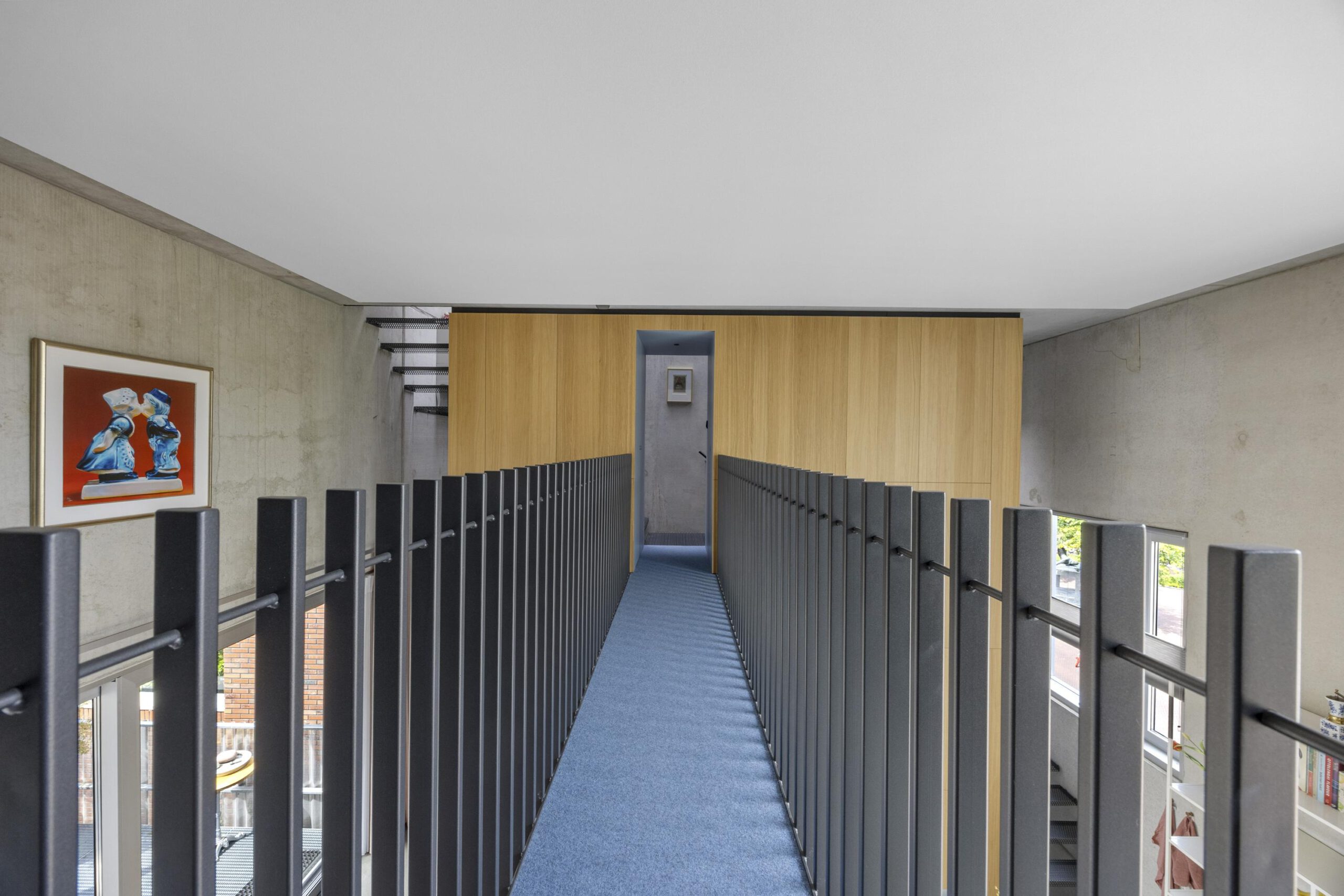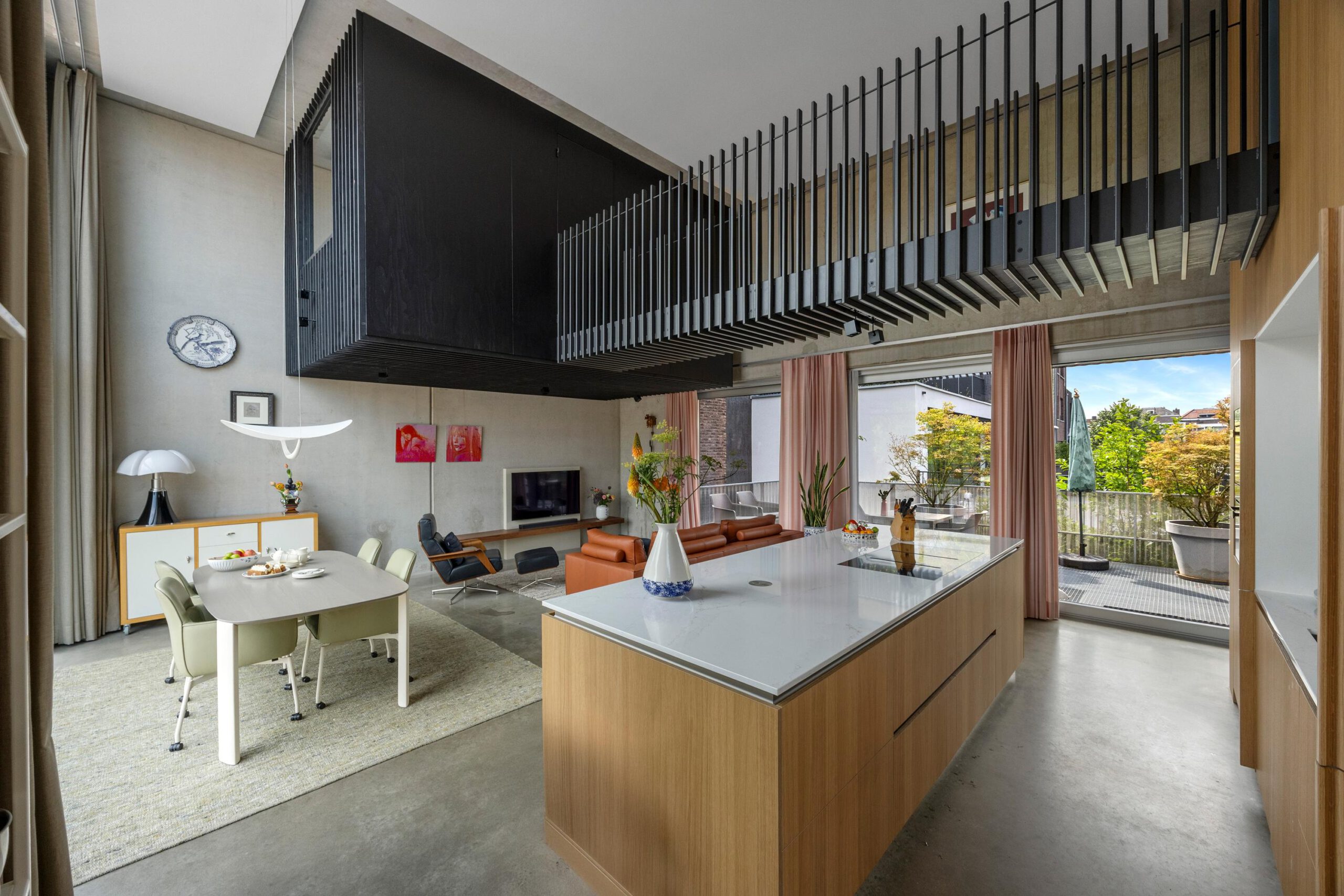 Royale woonkamer met zwevende werkkamer via loopbrug, nieuwe keuken, balkon.