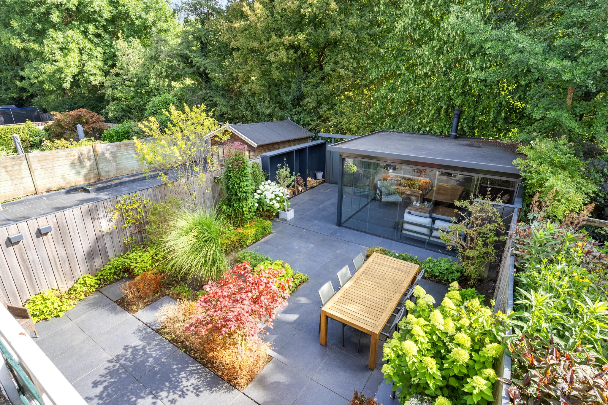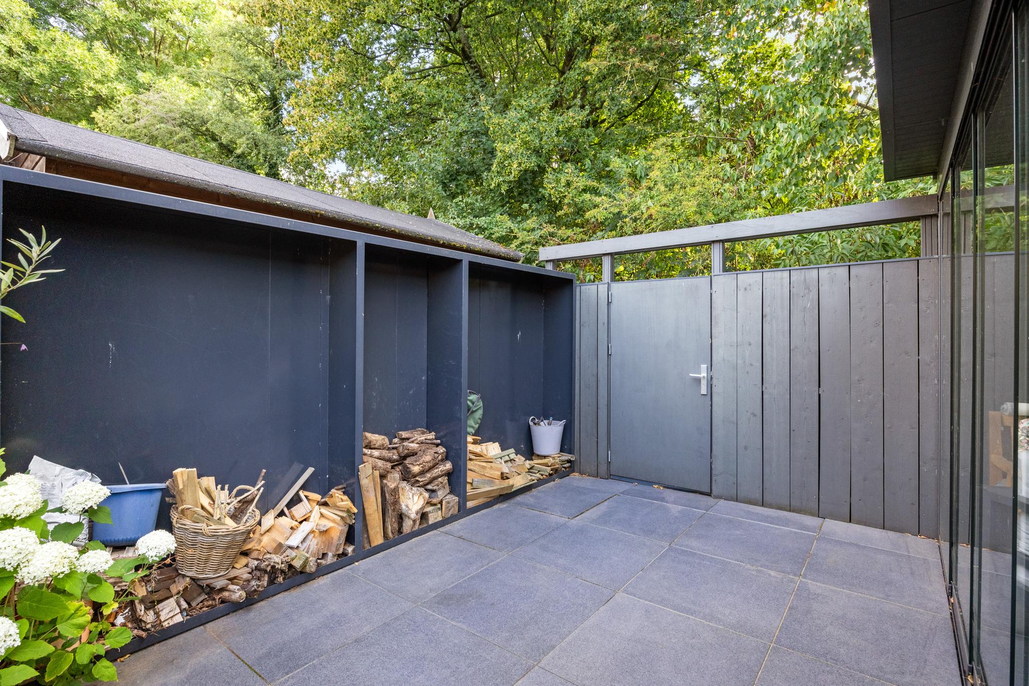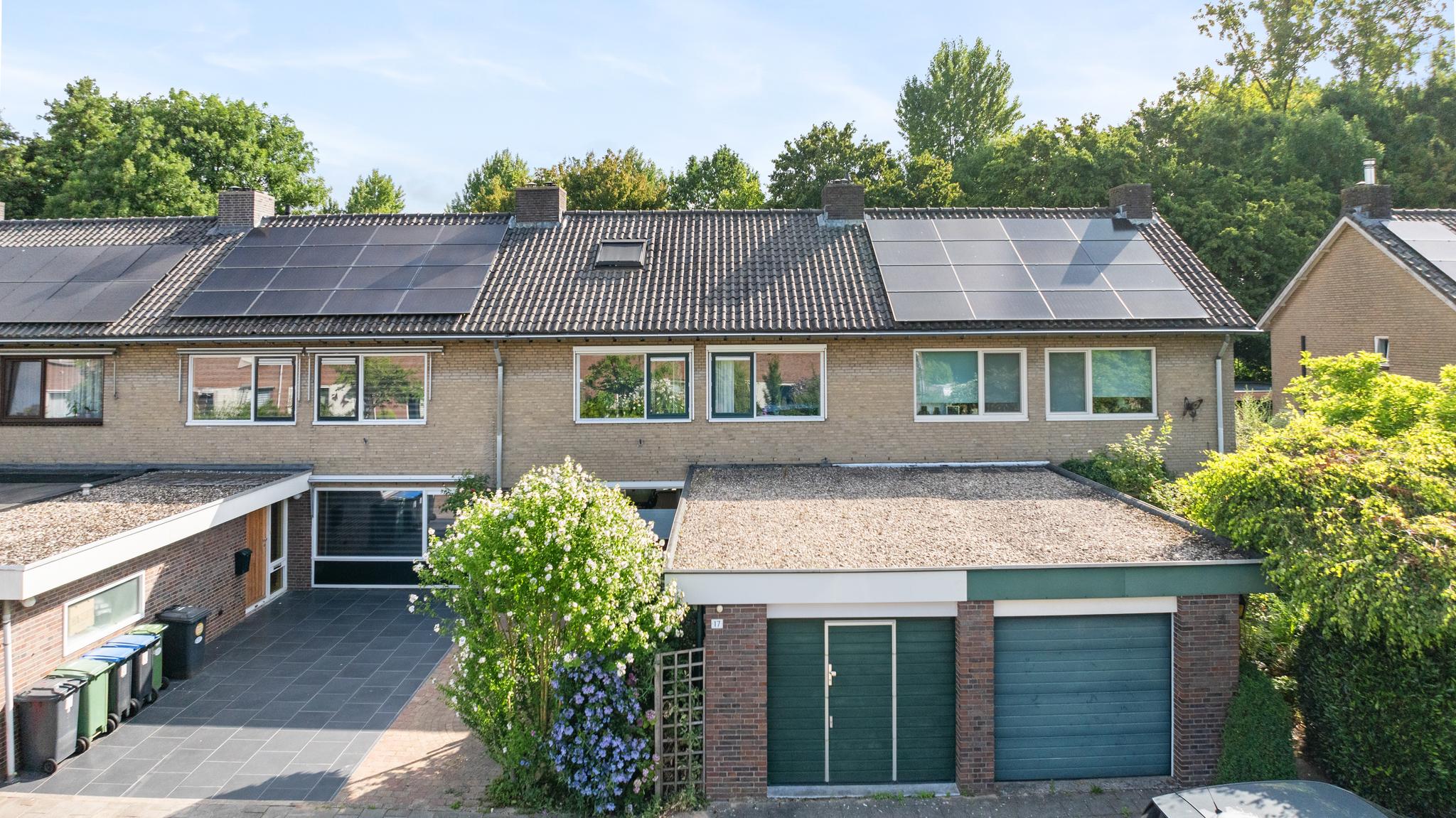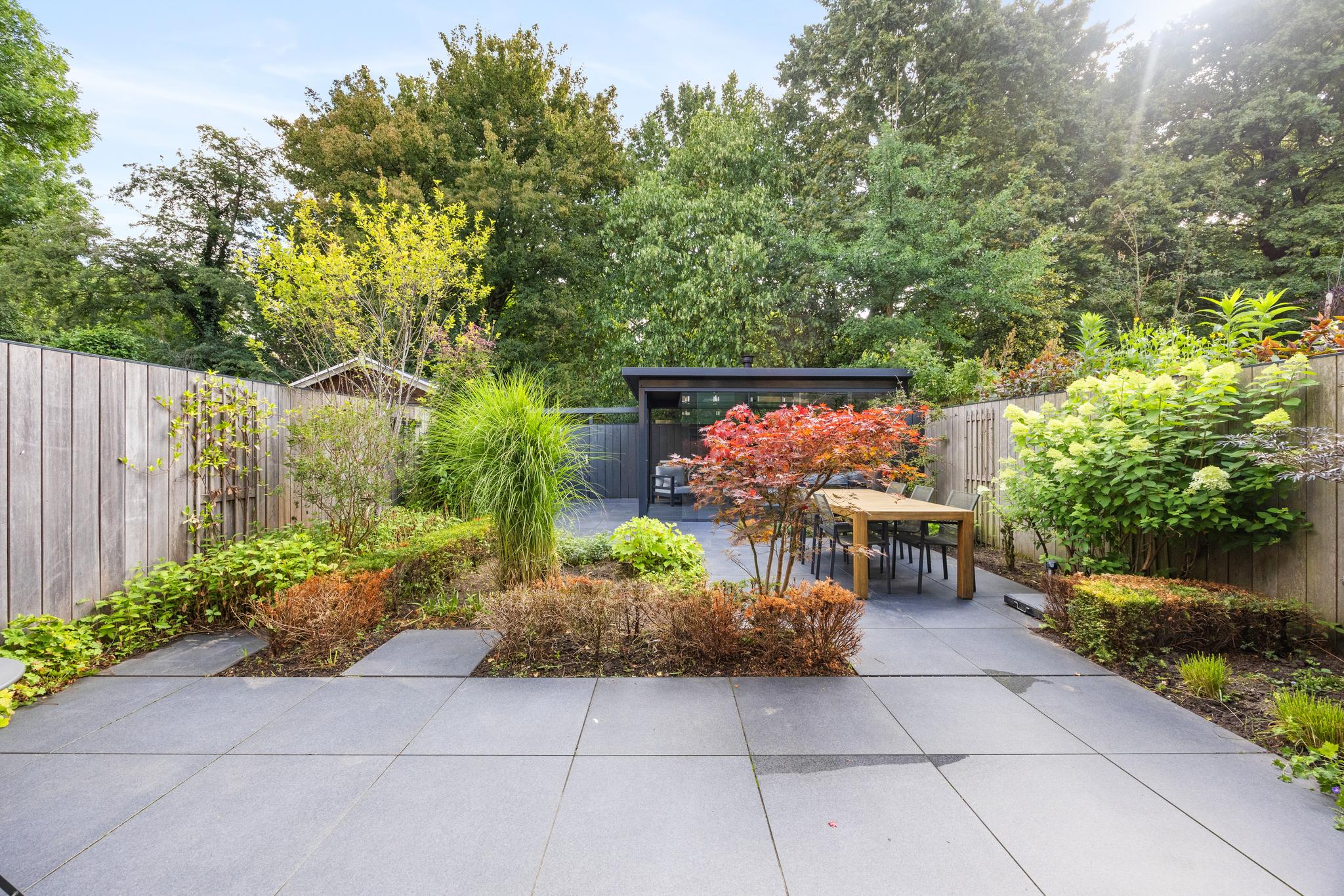 De voortuin is gelegen op het zuidwesten en geeft tevens toegang tot de garage. De geïsoleerde garage wordt door de huidige bewoners gebruikt als hobbyruimte. De fraai aangelegde achtertuin op het noordoosten is ruim en biedt veel mogelijkheden. De tuinkamer is een waar verlengstuk van de woonkamer met hout en electrische kachels, waar het zelfs in de winter gezellig vertoeven is. Door de glazen wanden is deze ruimte jaarrond te gebruiken.