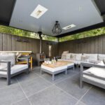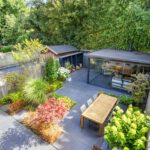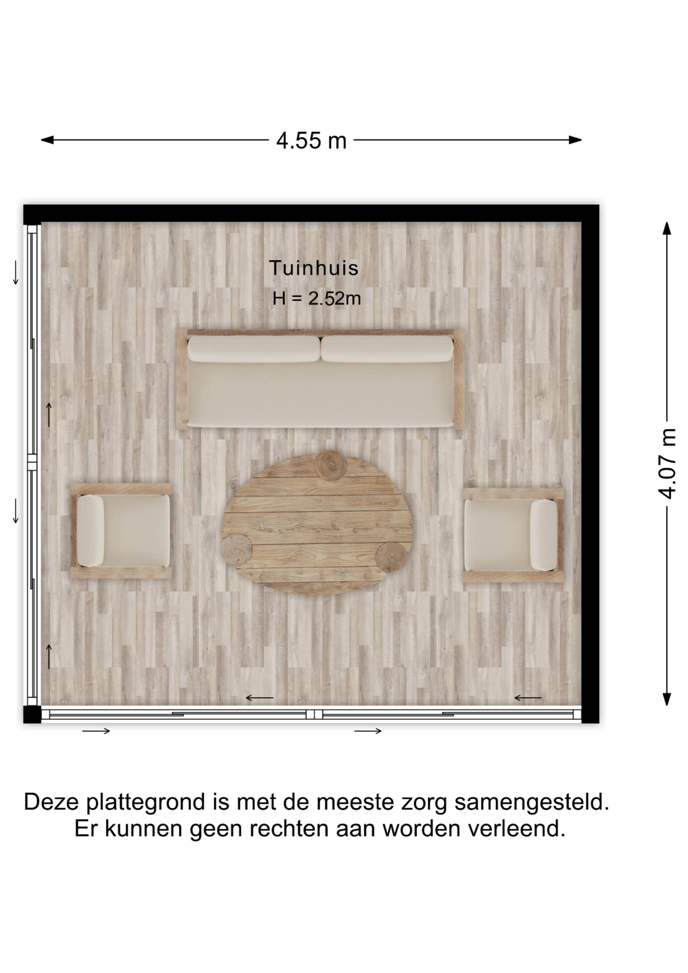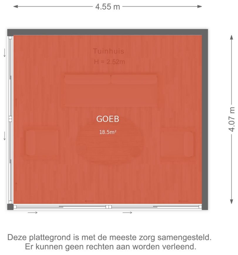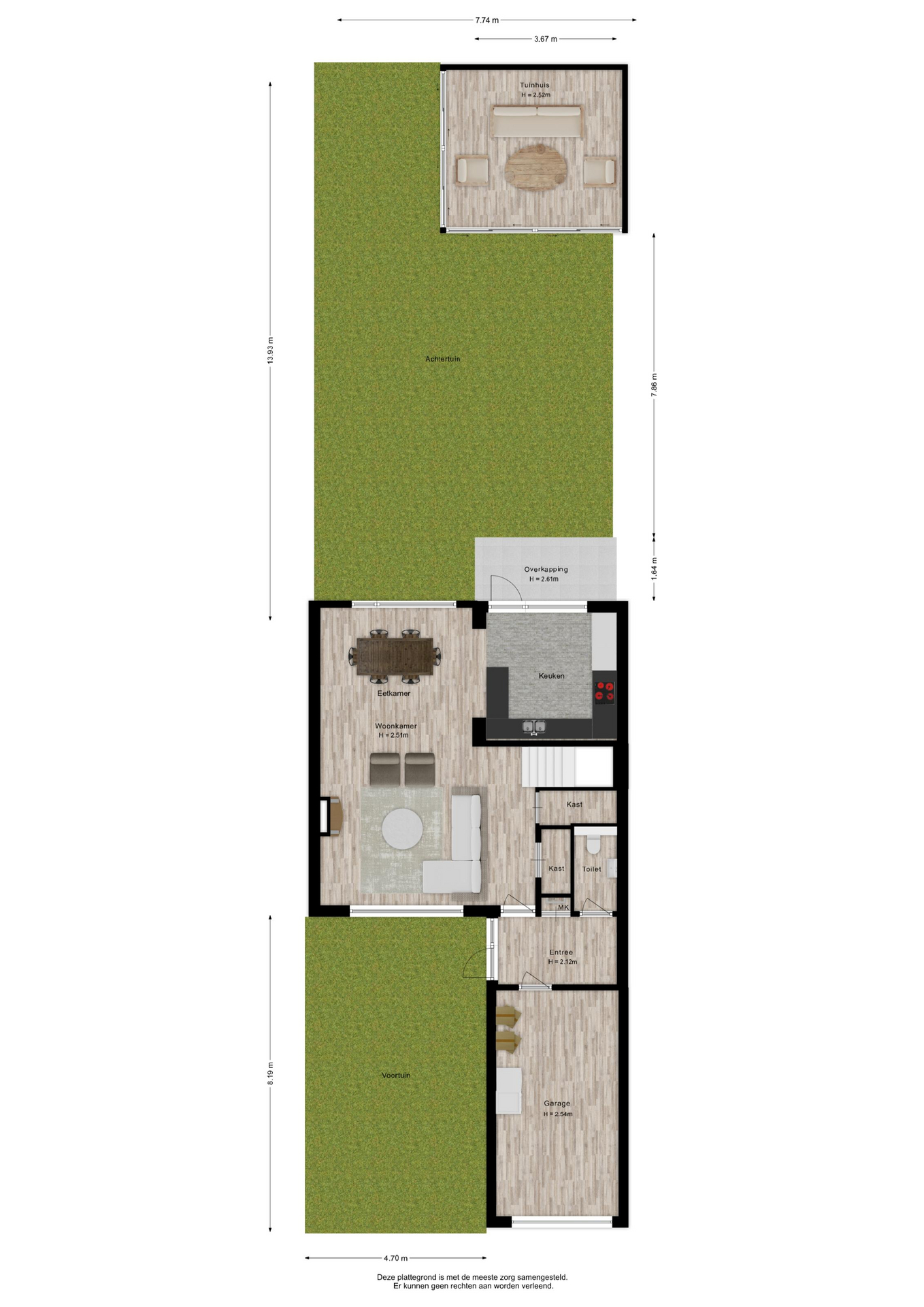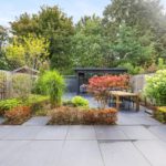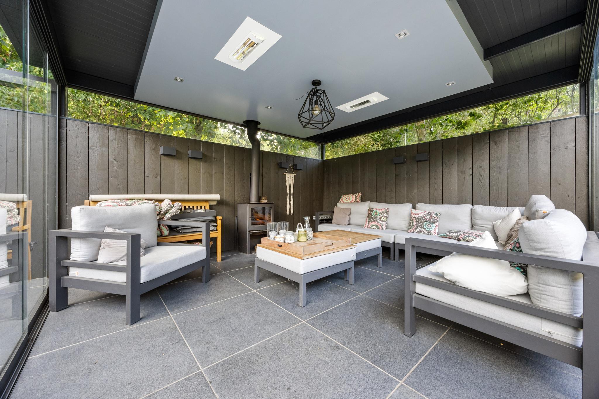 De voortuin is gelegen op het zuidwesten en geeft tevens toegang tot de garage. De geïsoleerde garage wordt door de huidige bewoners gebruikt als hobbyruimte. De fraai aangelegde achtertuin op het noordoosten is ruim en biedt veel mogelijkheden. De tuinkamer is een waar verlengstuk van de woonkamer met hout en electrische kachels, waar het zelfs in de winter gezellig vertoeven is. Door de glazen wanden is deze ruimte jaarrond te gebruiken.