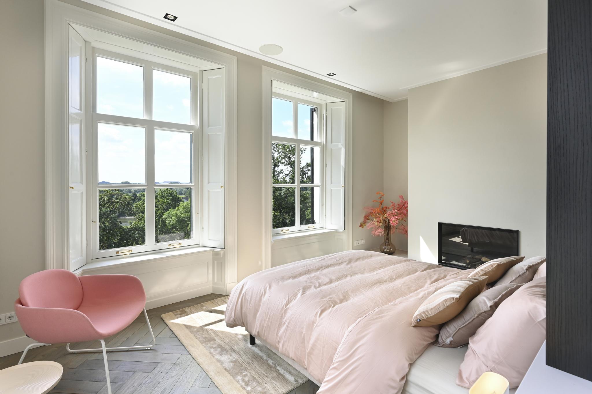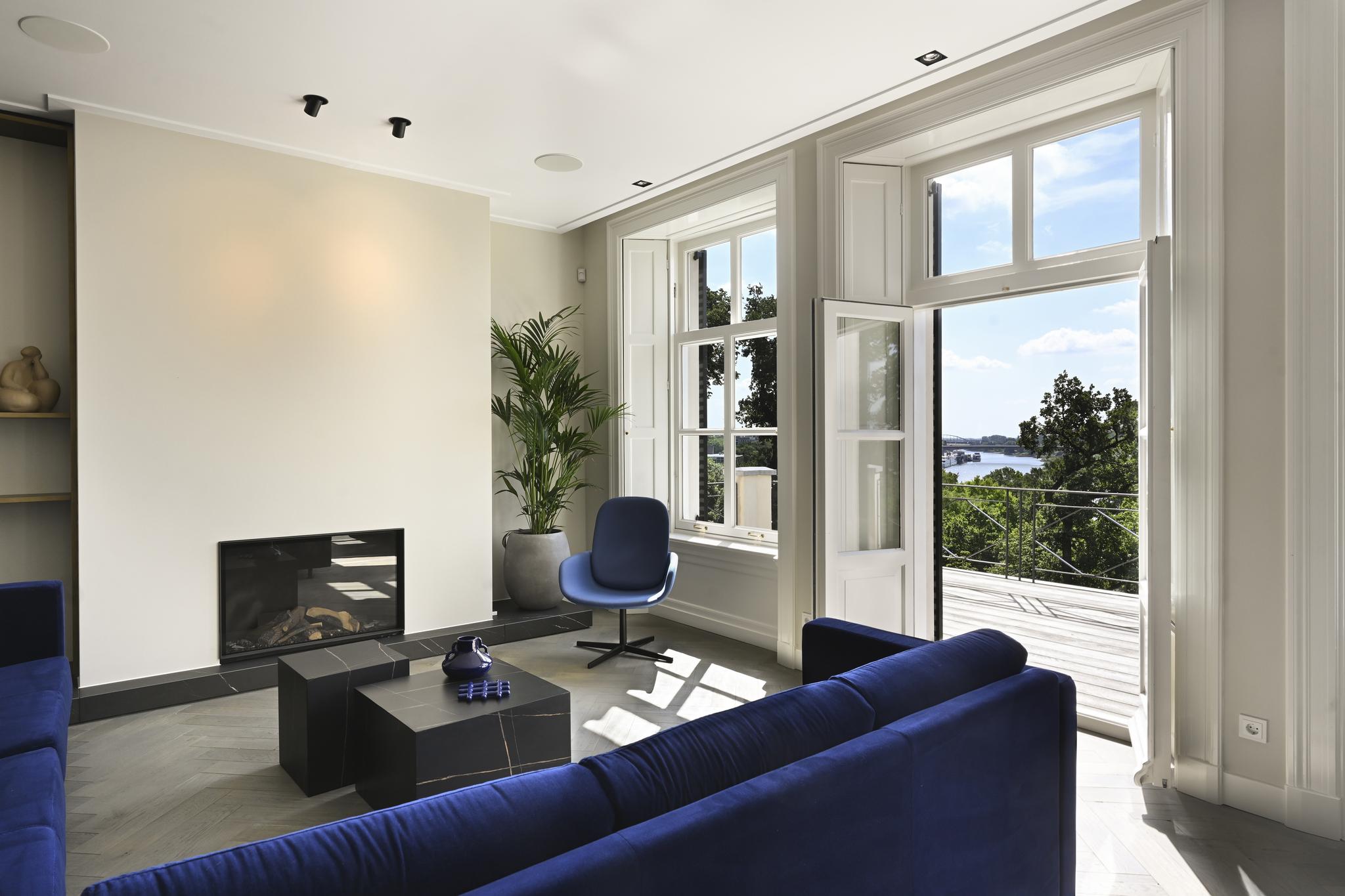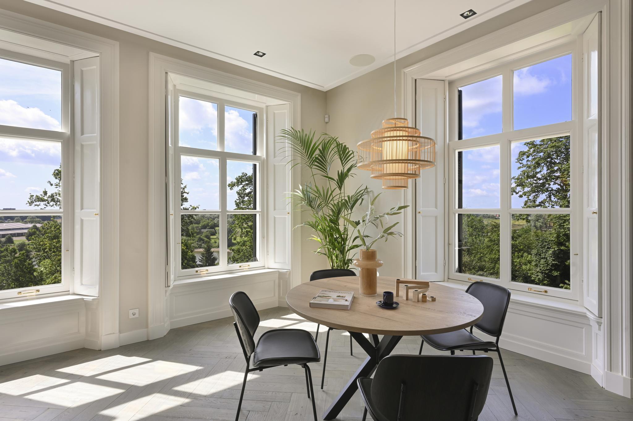 In de statige entree staat u even stil bij de imposante eikenhouten trappartij die fraai wordt uitgelicht door de imposante kroonluchters. Of pakt u toch liever de lift waarmee alleen u naar uw appartement op de eerste etage kunt? Eenmaal thuis geniet u van volop licht en ruimte. Door de grote raampartijen op het zuiden ontvouwt zich een geweldig panorama over de Neder-Rijn en het uiterwaardenpark van Meinerswijk. Op zonnige dagen zit u uiteraard op het royale terras met een goed glas gekoelde wijn. Uw appartement is uiteraard voorzien van alle denkbare technologische gemakken. En van twee ruime slaapkamers, twee badkamers en een aparte werkkamer. Hoge plafonds en een hoogwaardige afwerking maken uw Rijnappartement helemaal compleet. Een ideaal thuis voor wie wil genieten van rust, ruimte en luxe, met de Arnhemse binnenstad vlakbij.