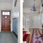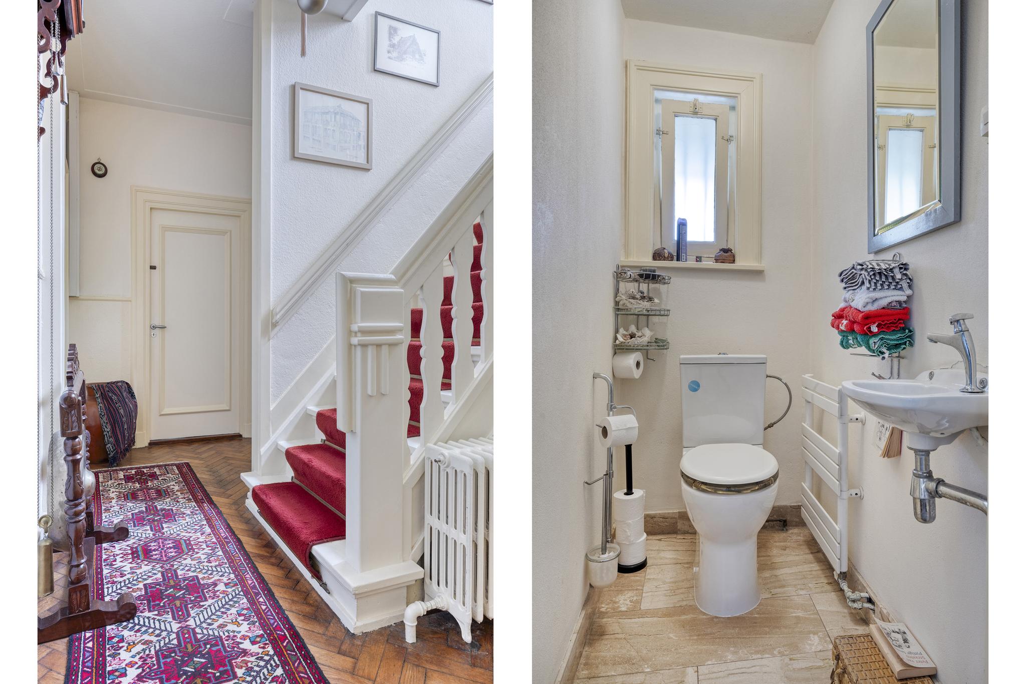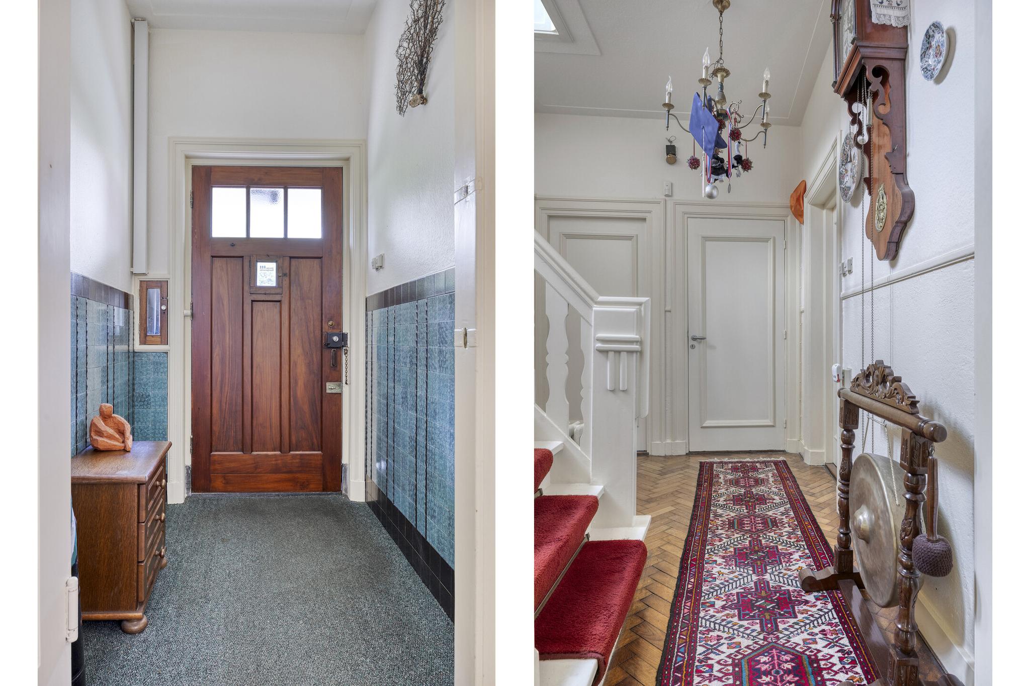 Vestibule met 30en jaren wandtegels en een granito vloer, royale hal met eiken visgraat parketvloer, toilet met fontein voorzien van een marmeren vloer, garderobe kast, entree naar de wijn- provisie- en hobbykelder met granito vloeren.