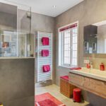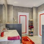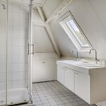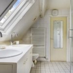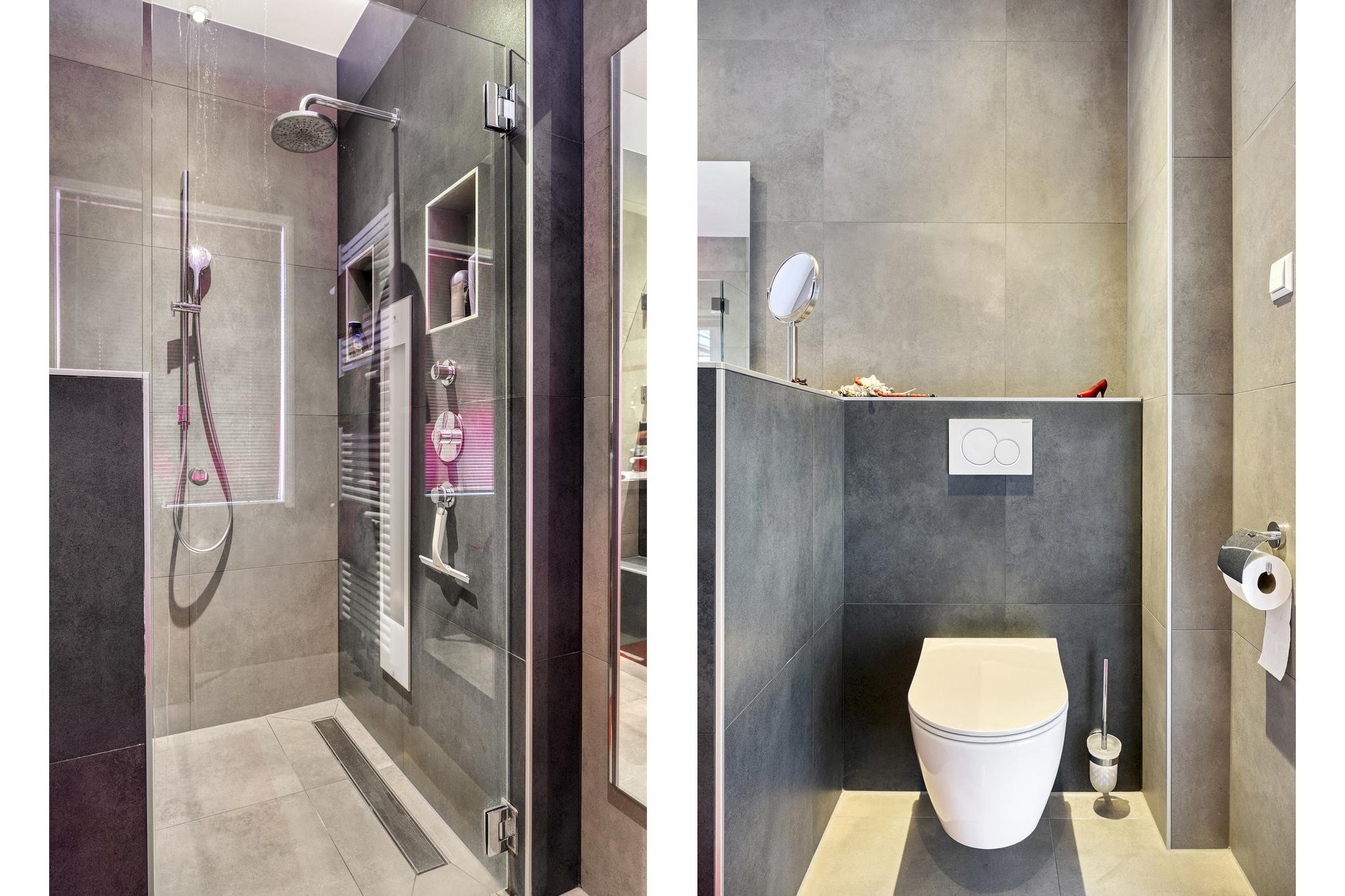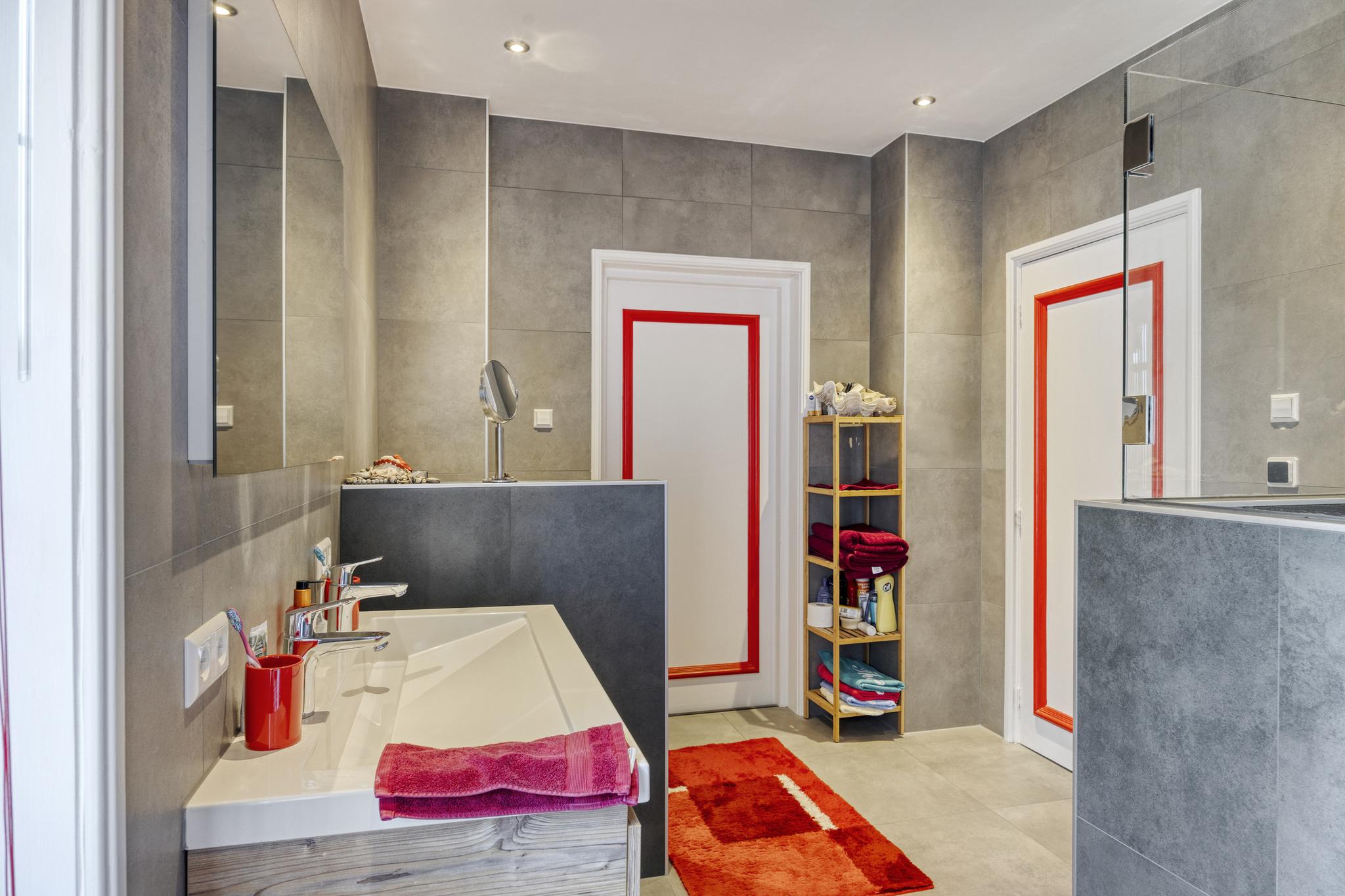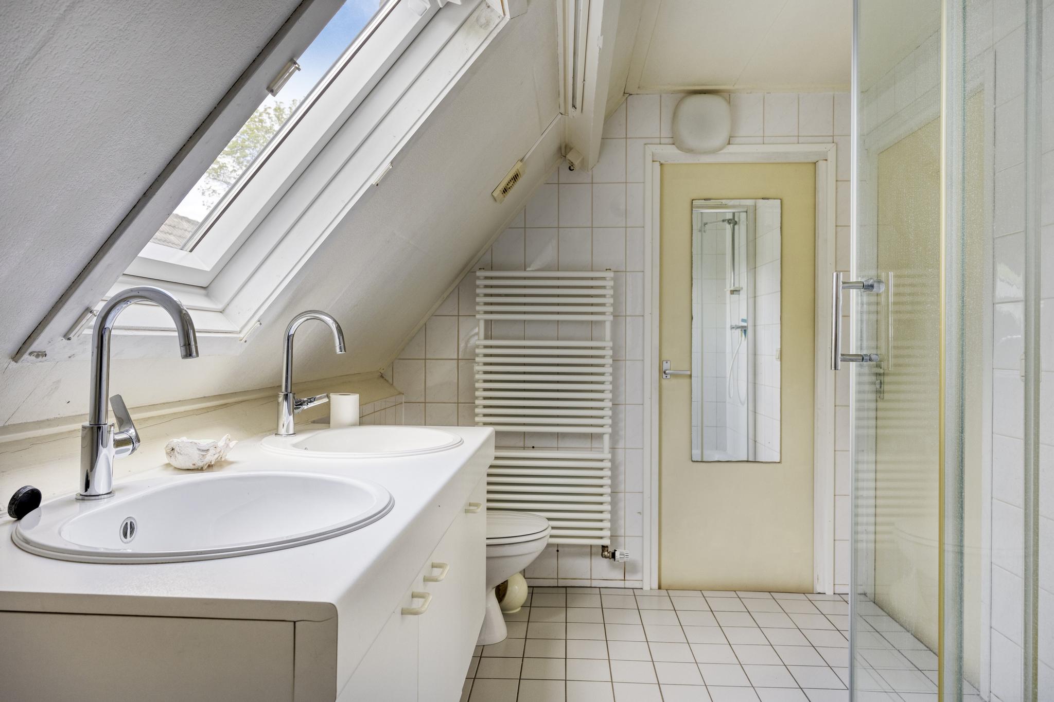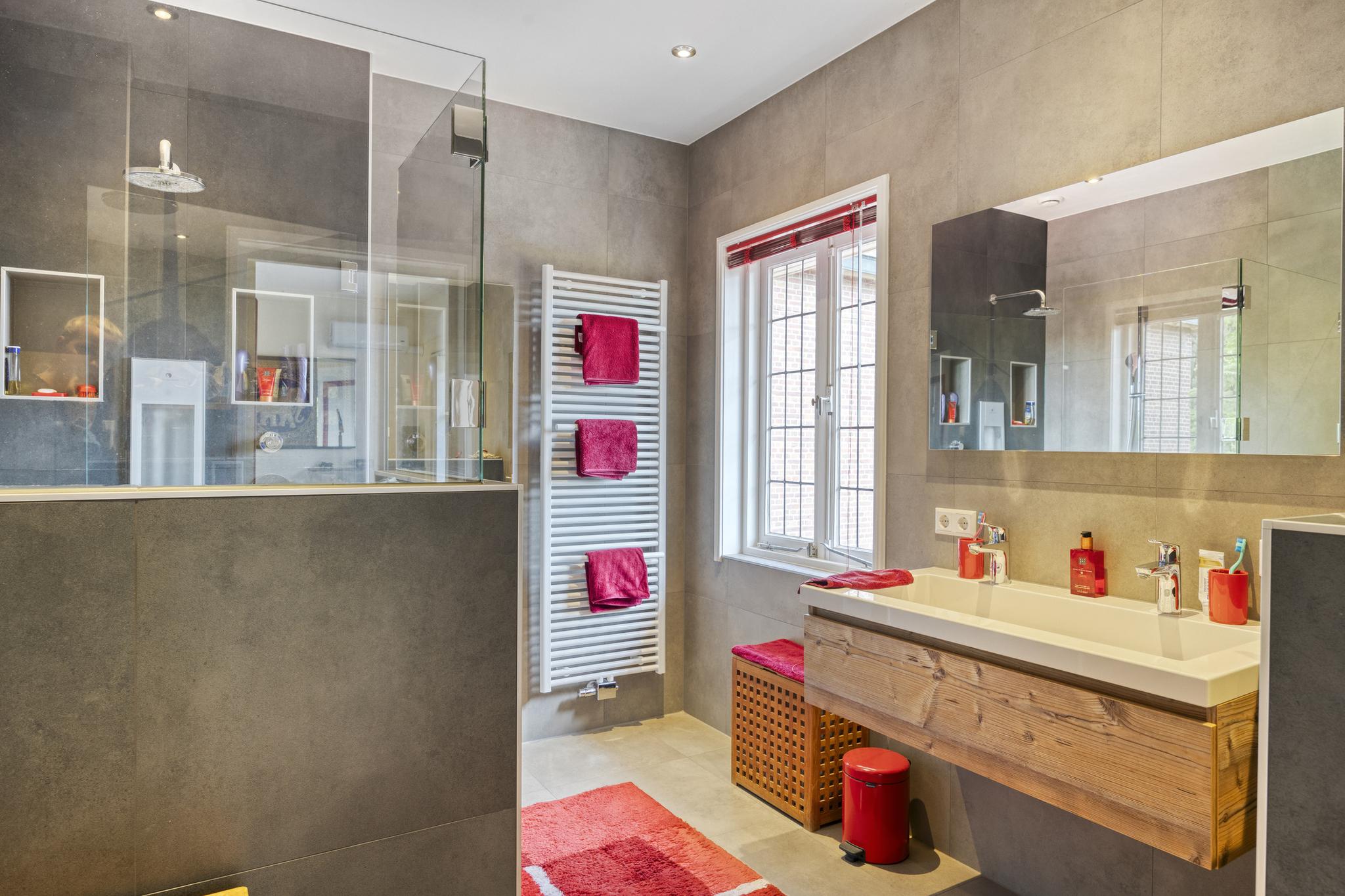 1e verdieping: overloop met laminaatvloer, c.v. kast, recent aangelegde moderne badkamer voorzien van een dubbel vaste wastafel meubel, toilet en een royale inloopdouche. (vloerverwarming)