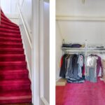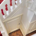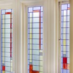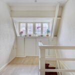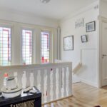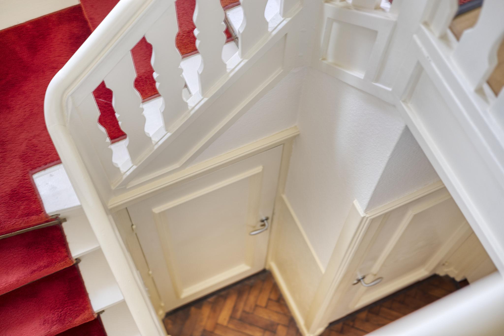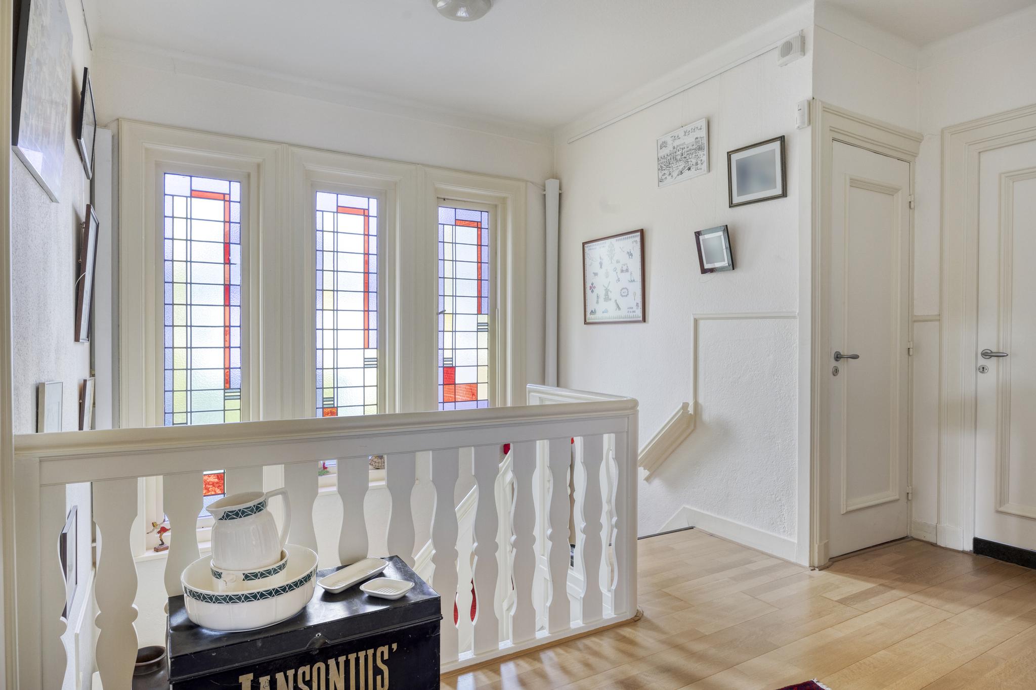 Fraai 30 jaren trappenhuis met bordes verlicht door kleurrijk glas in lood.