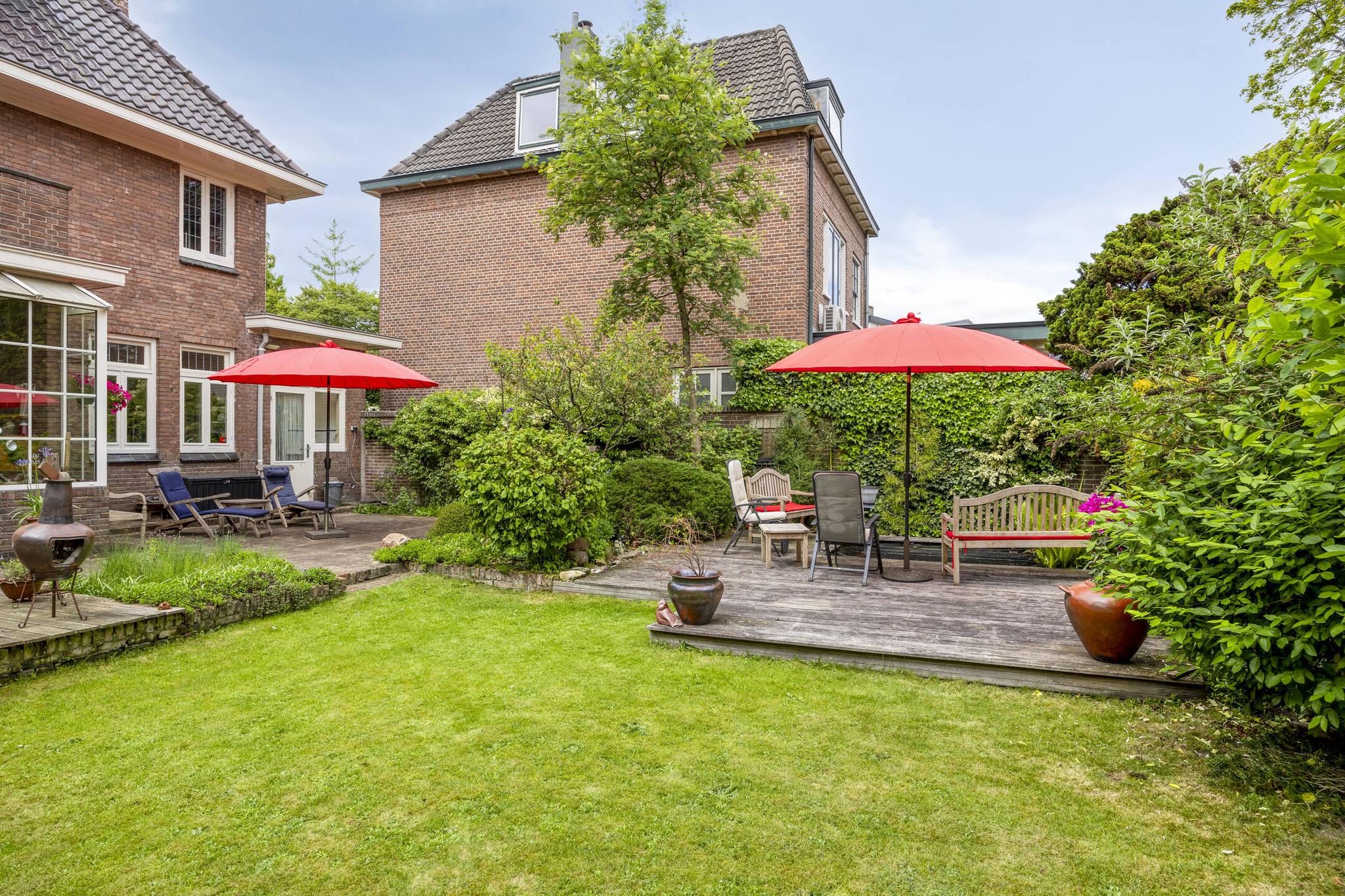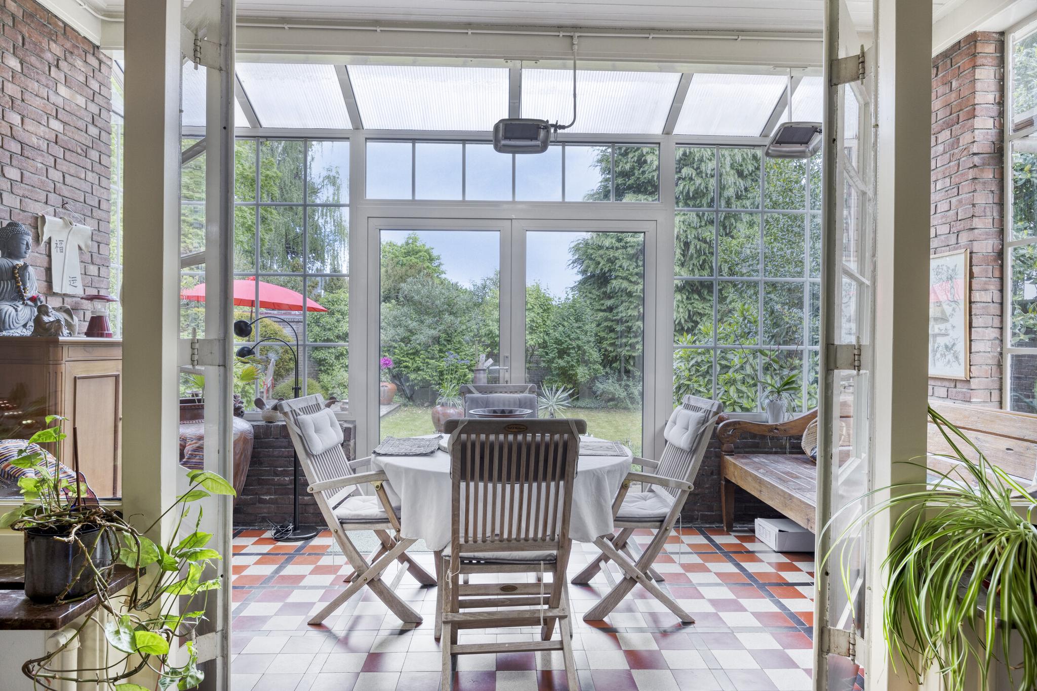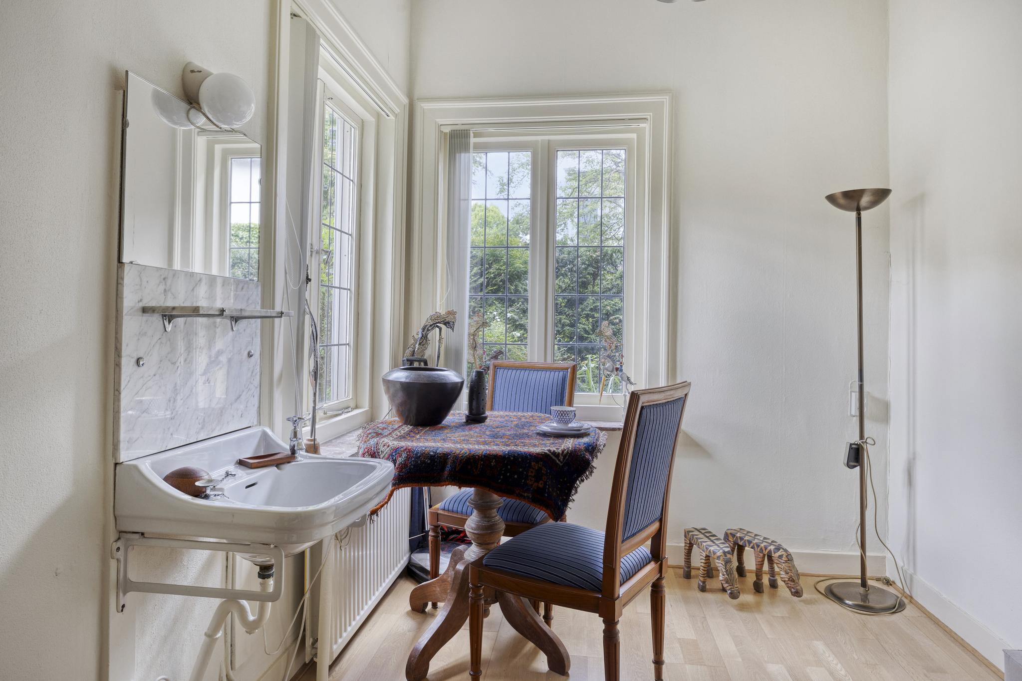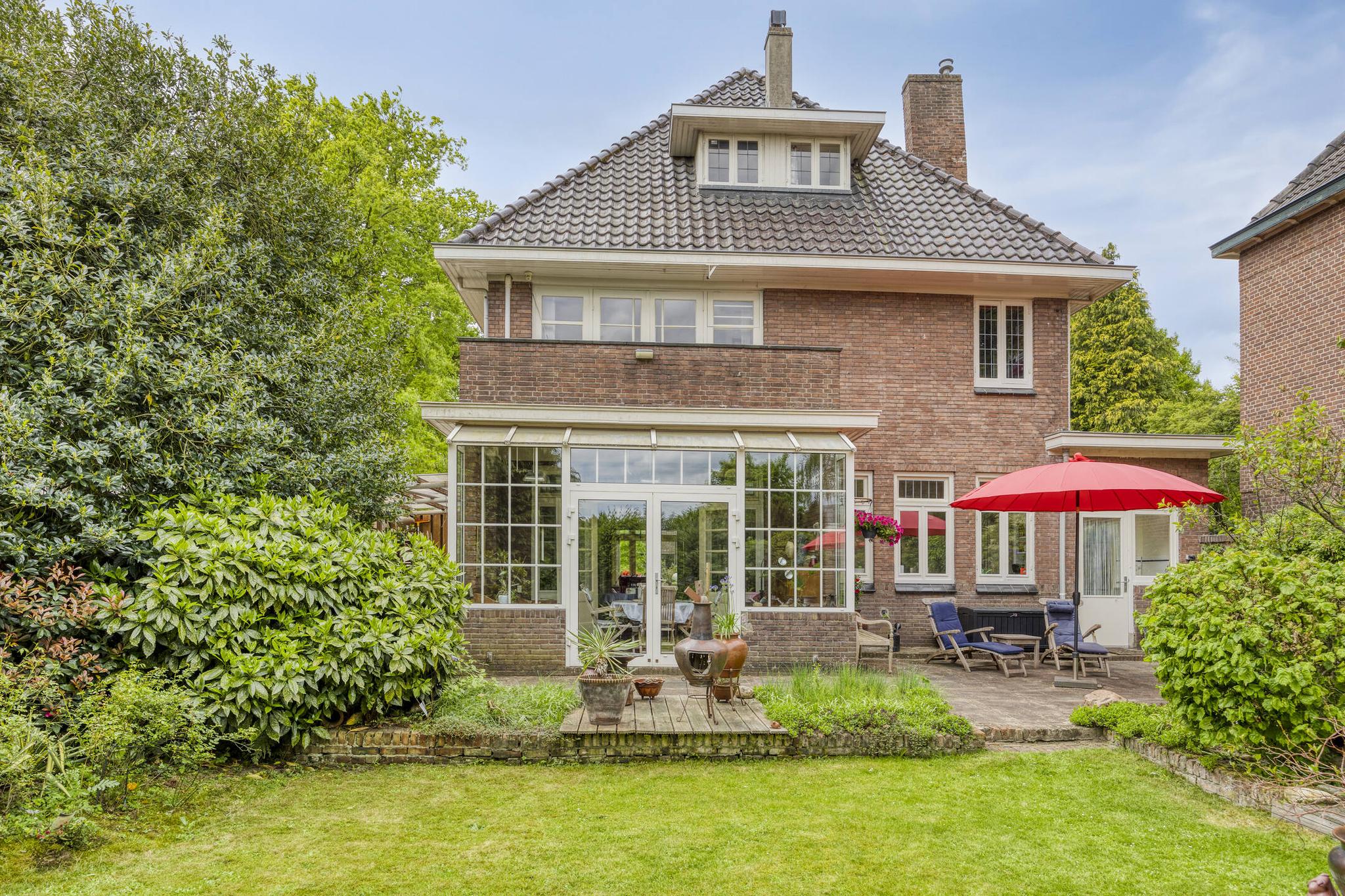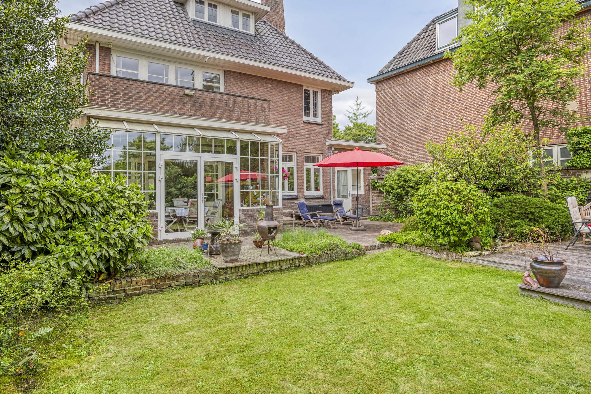 Bijkeuken met granito vloer, wastafel, wasmachine en droger plaats. De losse kasten blijven achter, voormalige toilet ruimte (nu berging), sfeervolle royale kamer- en suite met halfronde erker, marmeren schouw met inbouw gashaard en eiken visgraat parketvloer. Grenzend aan de kamer en suite bevindt zich een sfeervolle tuinkamer met open slaande deuren naar een goed aangelegde achtertuin met diverse terrassen waar u menig uur kunt doorbrengen.