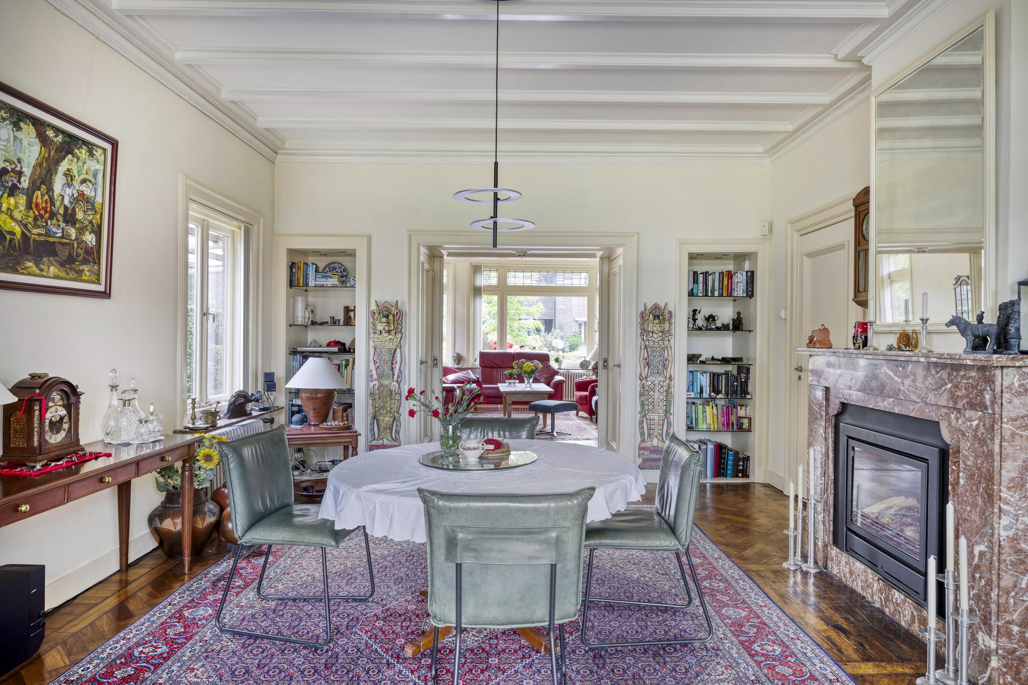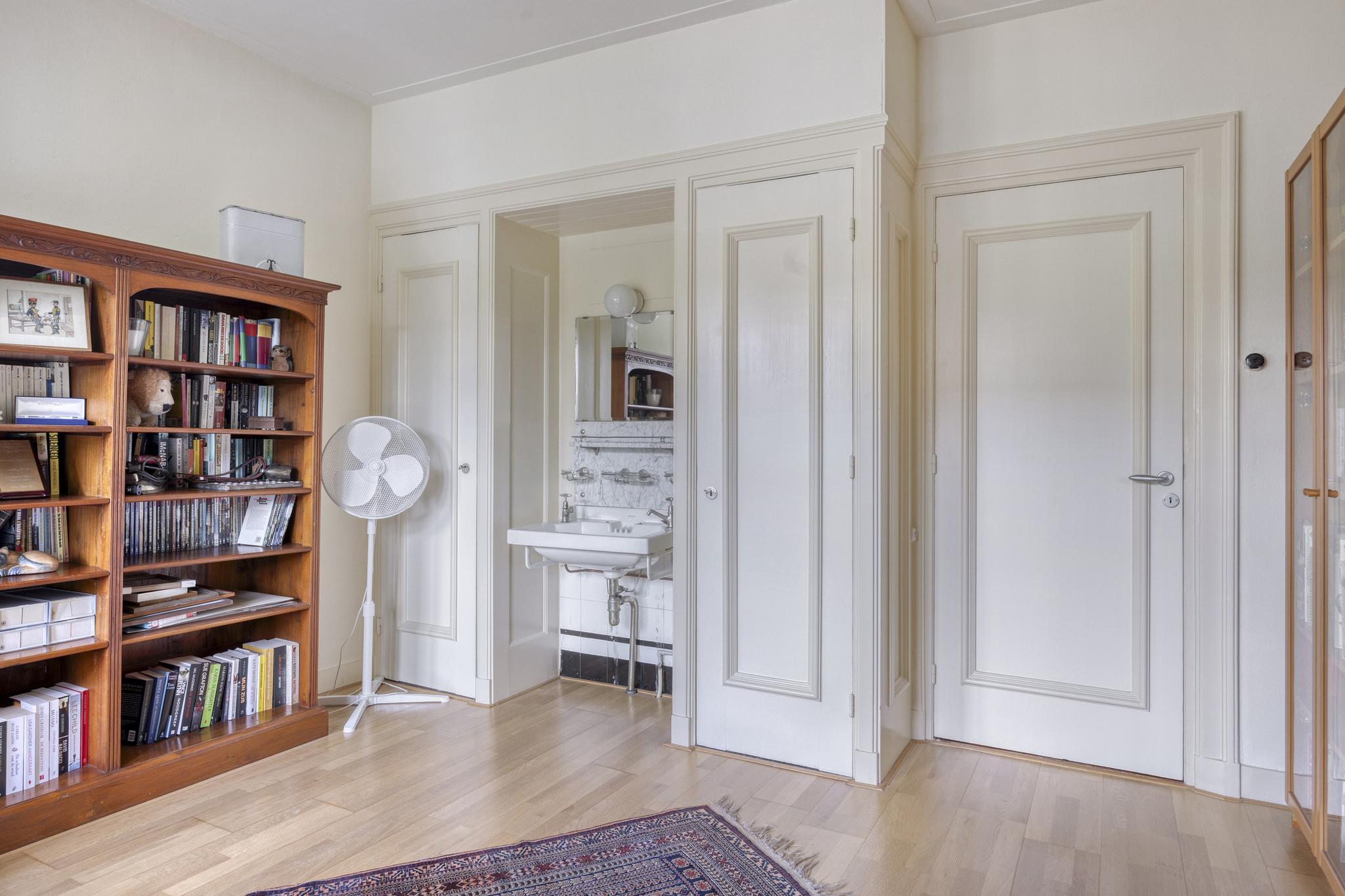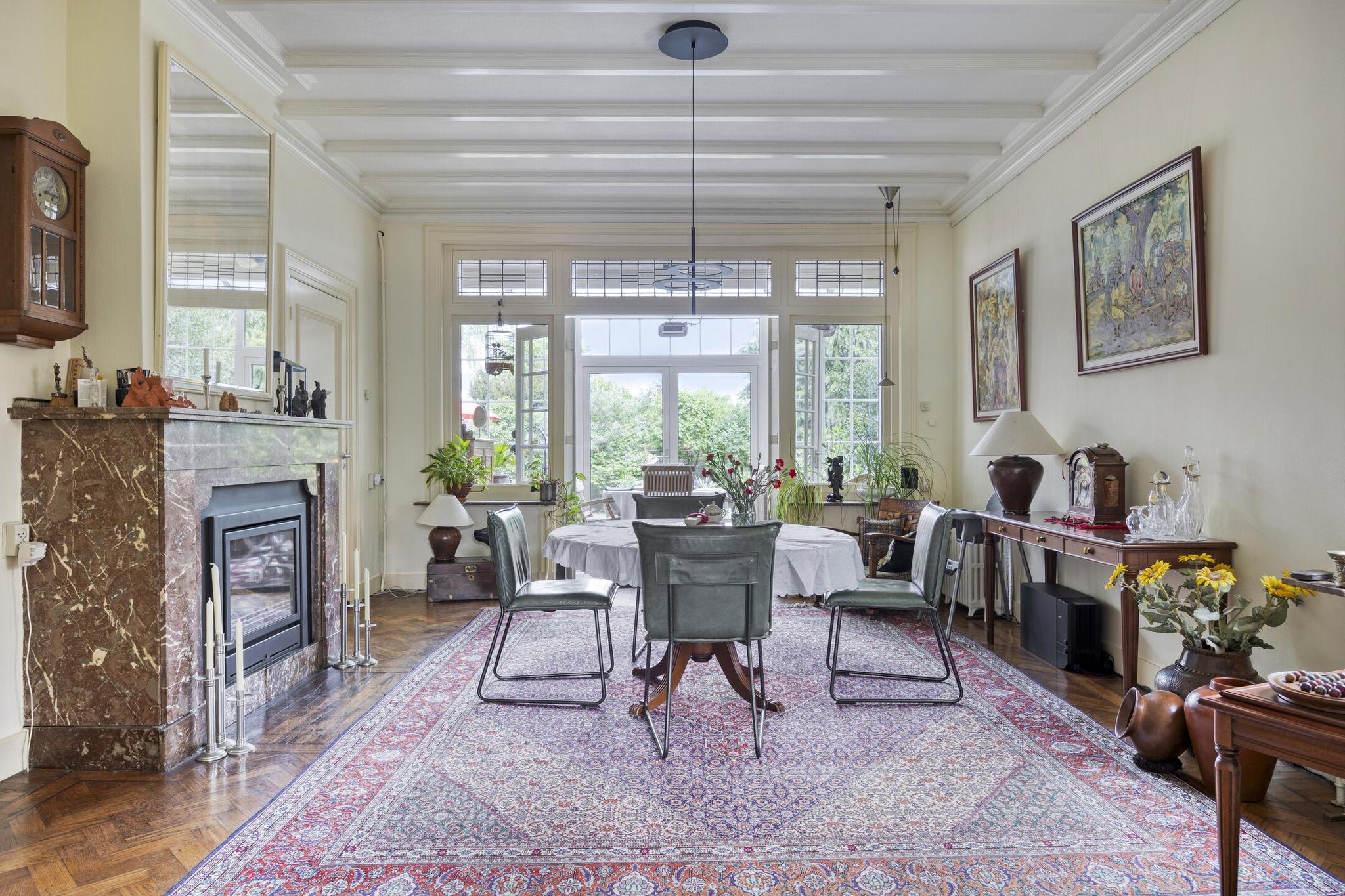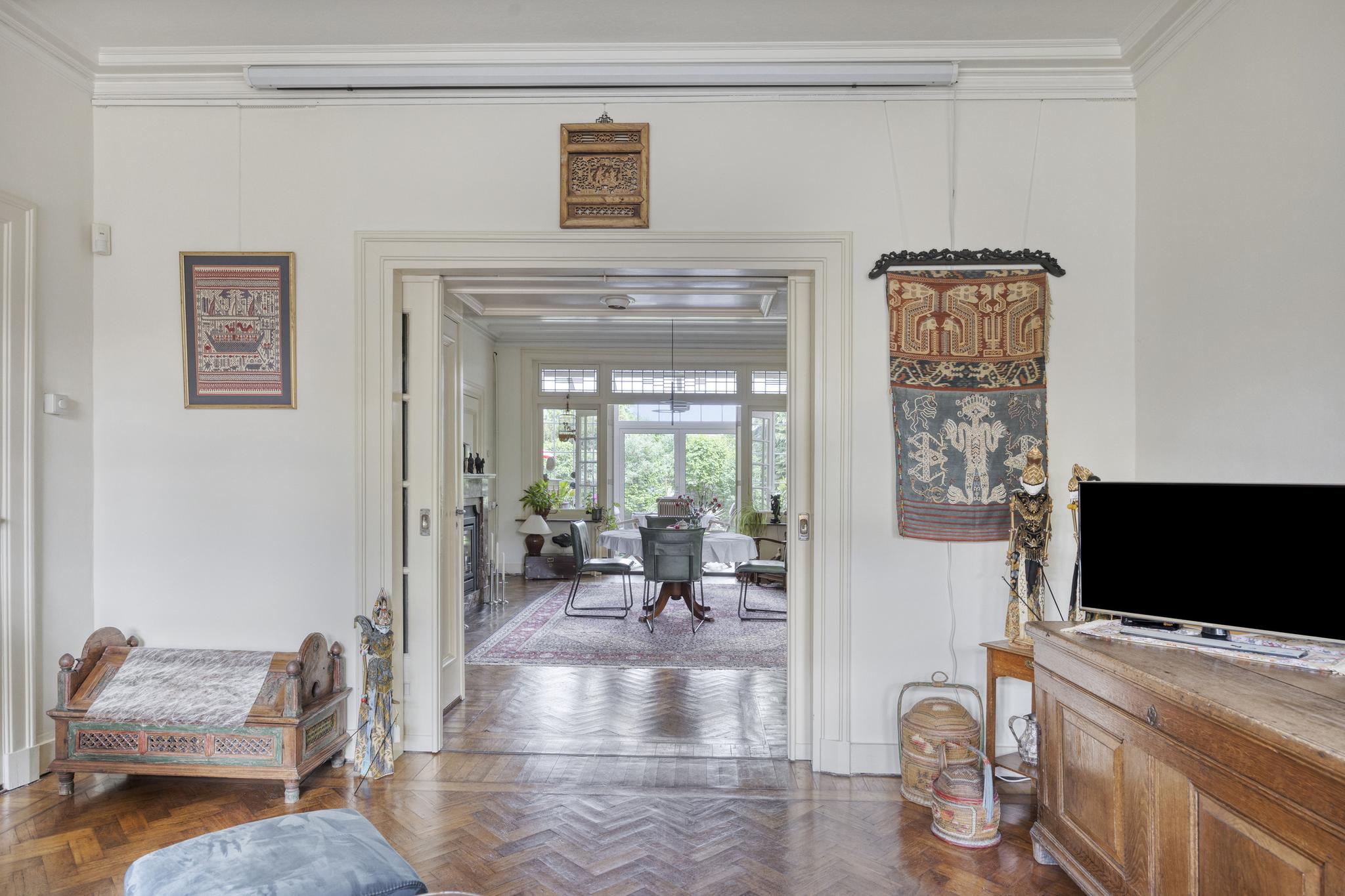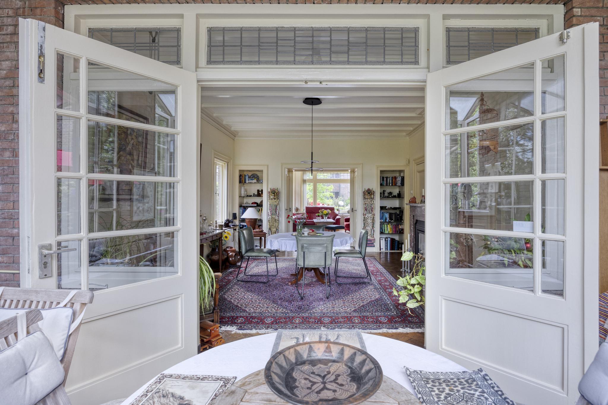 Bijkeuken met granito vloer, wastafel, wasmachine en droger plaats. De losse kasten blijven achter, voormalige toilet ruimte (nu berging), sfeervolle royale kamer- en suite met halfronde erker, marmeren schouw met inbouw gashaard en eiken visgraat parketvloer. Grenzend aan de kamer en suite bevindt zich een sfeervolle tuinkamer met open slaande deuren naar een goed aangelegde achtertuin met diverse terrassen waar u menig uur kunt doorbrengen.
