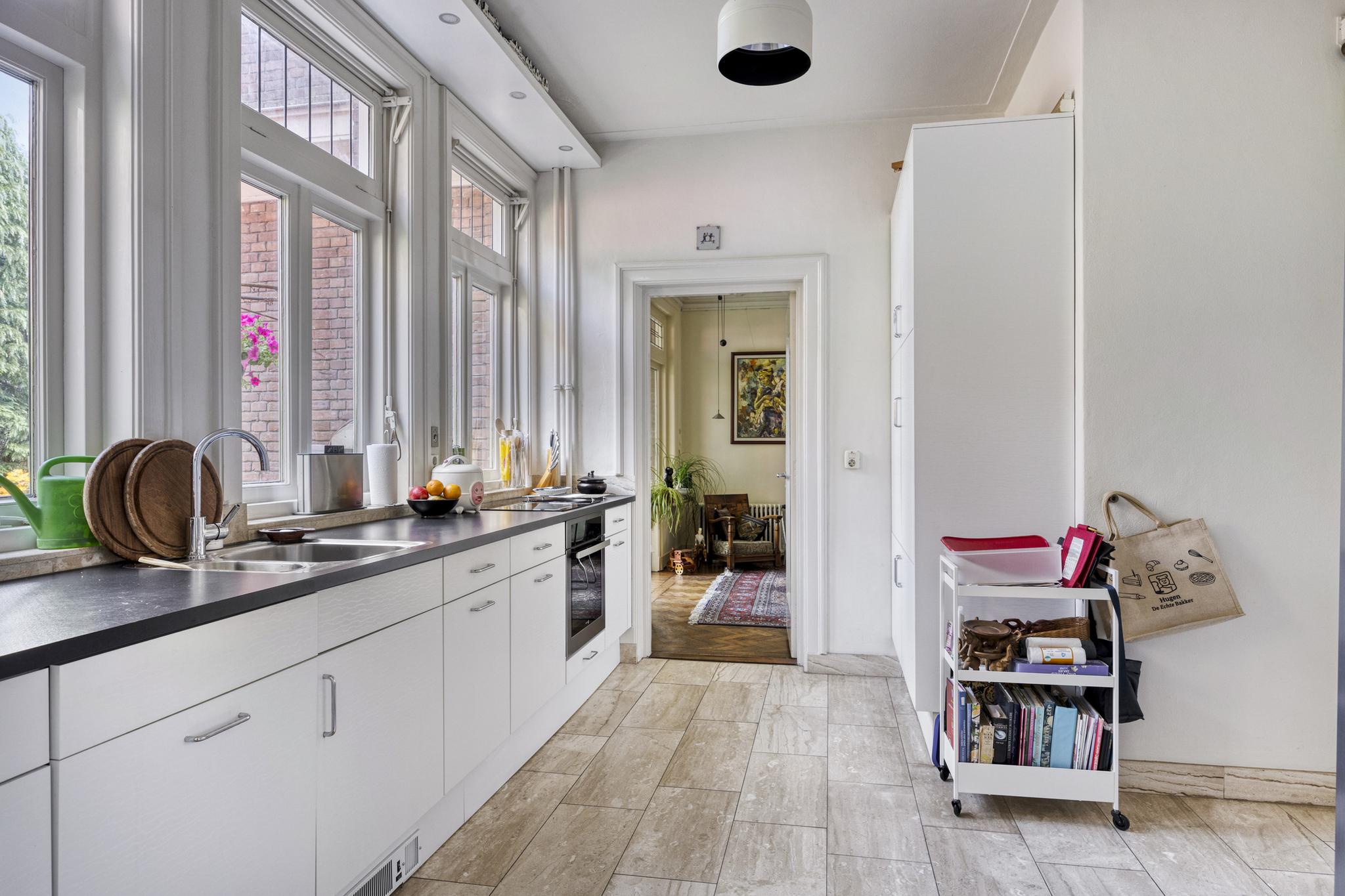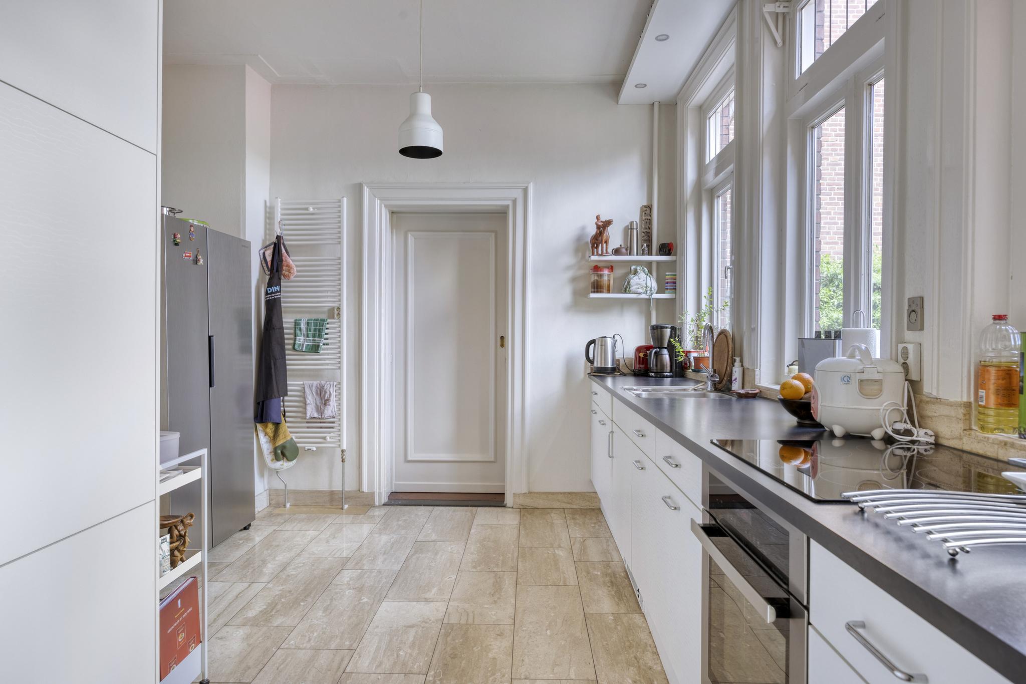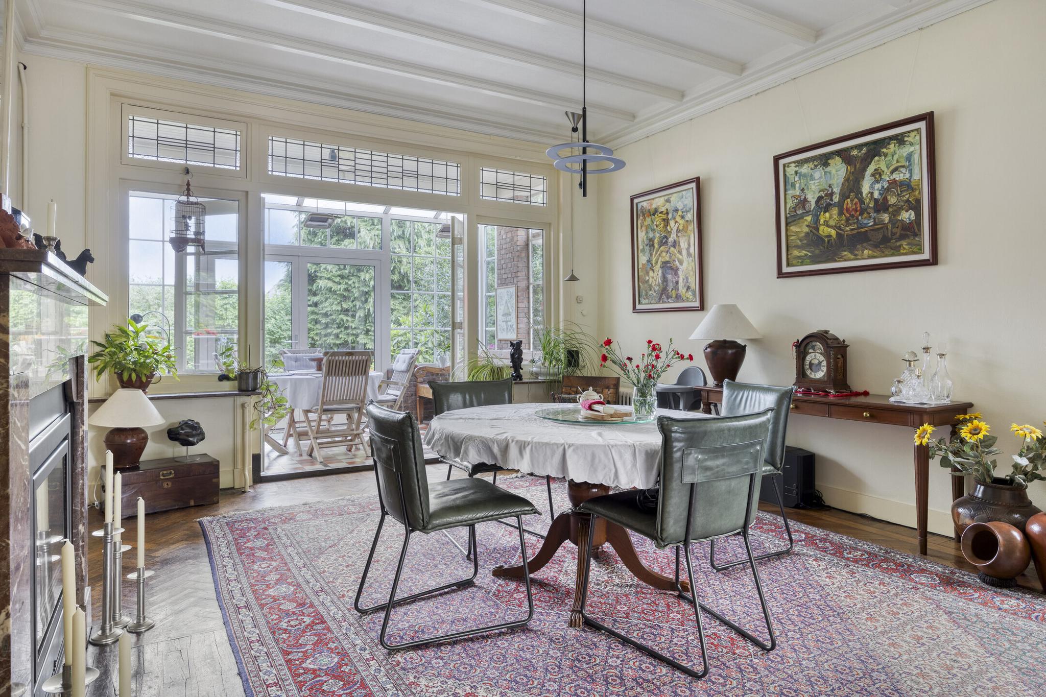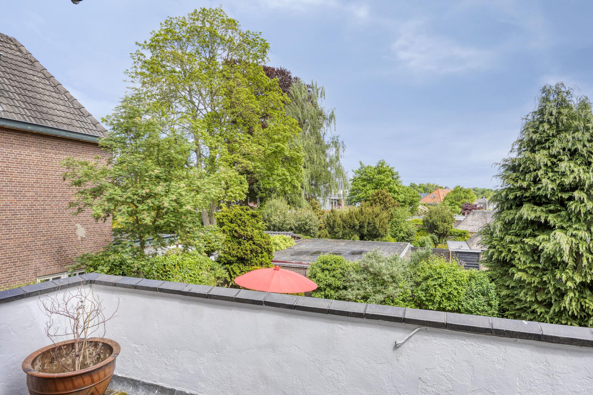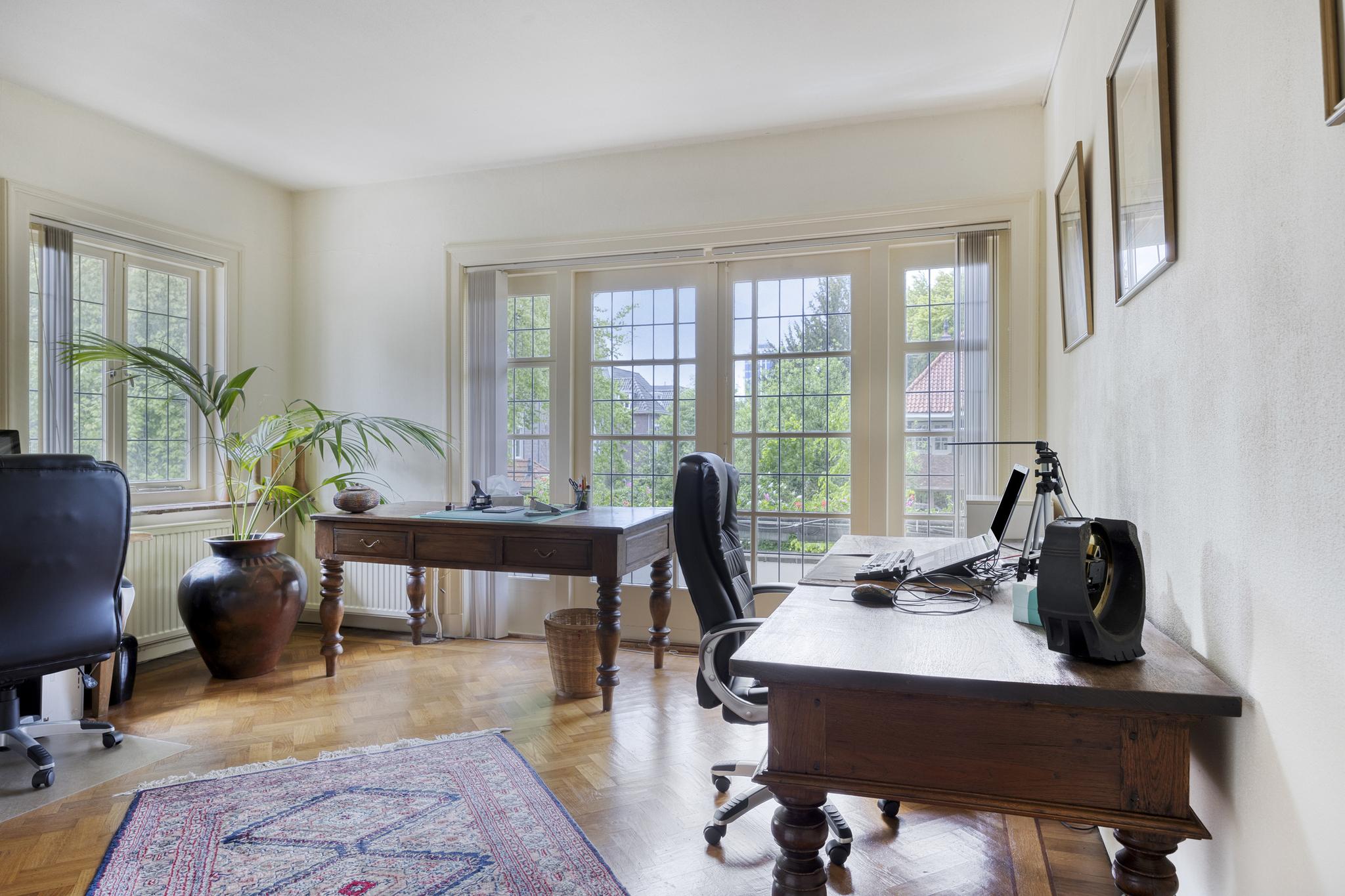 Bijkeuken met granito vloer, wastafel, wasmachine en droger plaats. De losse kasten blijven achter, voormalige toilet ruimte (nu berging), sfeervolle royale kamer- en suite met halfronde erker, marmeren schouw met inbouw gashaard en eiken visgraat parketvloer. Grenzend aan de kamer en suite bevindt zich een sfeervolle tuinkamer met open slaande deuren naar een goed aangelegde achtertuin met diverse terrassen waar u menig uur kunt doorbrengen.