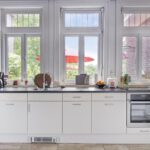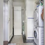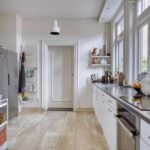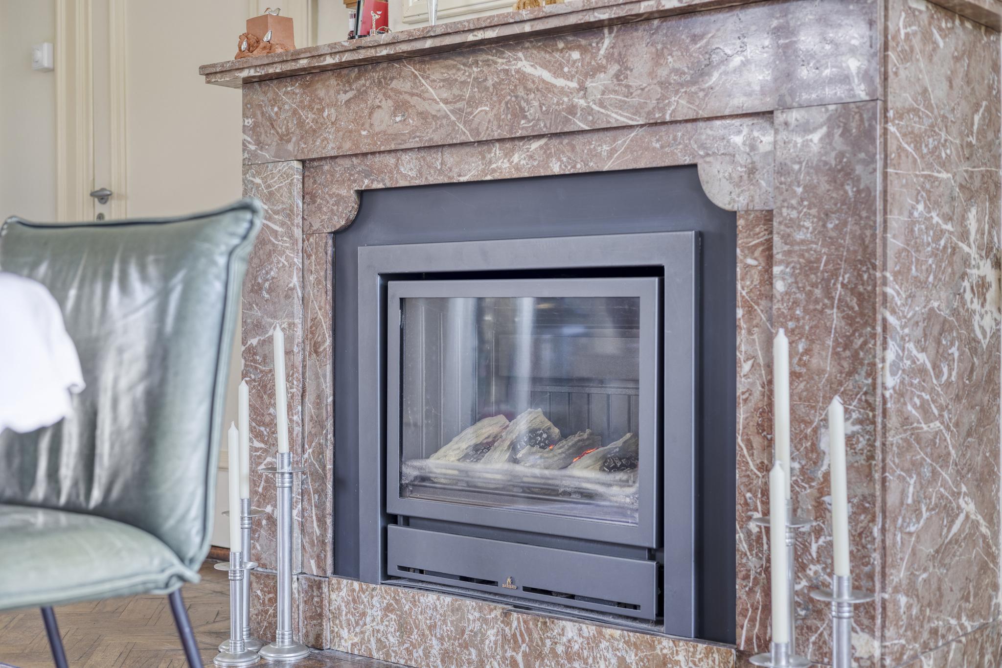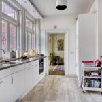 Begane grond voorzijde, slaapkamer met wastafel en eikenlaminaatvloer, volledig in gerichte keuken met apparatuur uit 2016. Inductie 4 pits kookplaat, vaatwasser, elektrische oven en een grote losse koel- vrieskast, elektrische boiler en een marmeren keuken vloer.