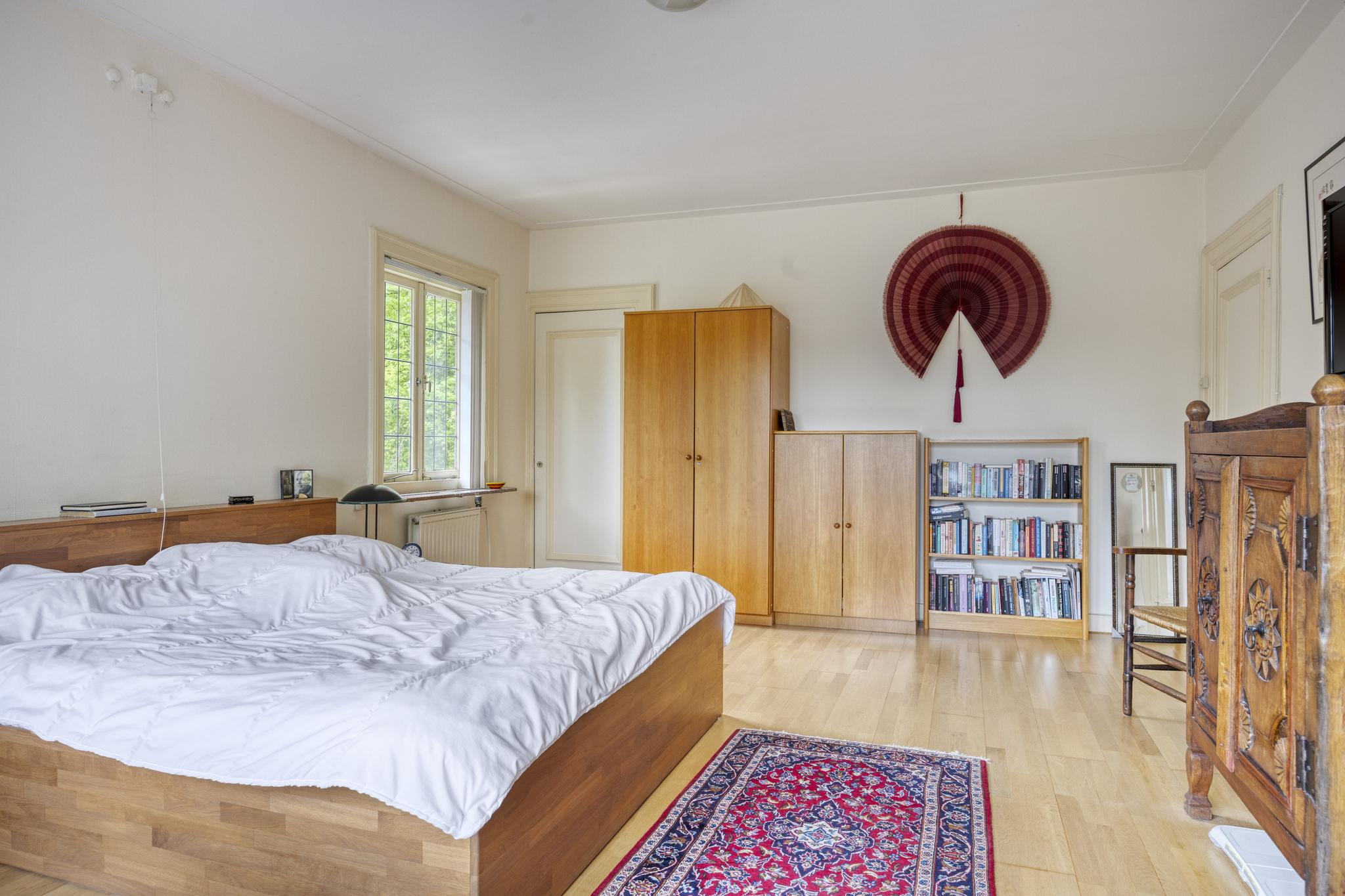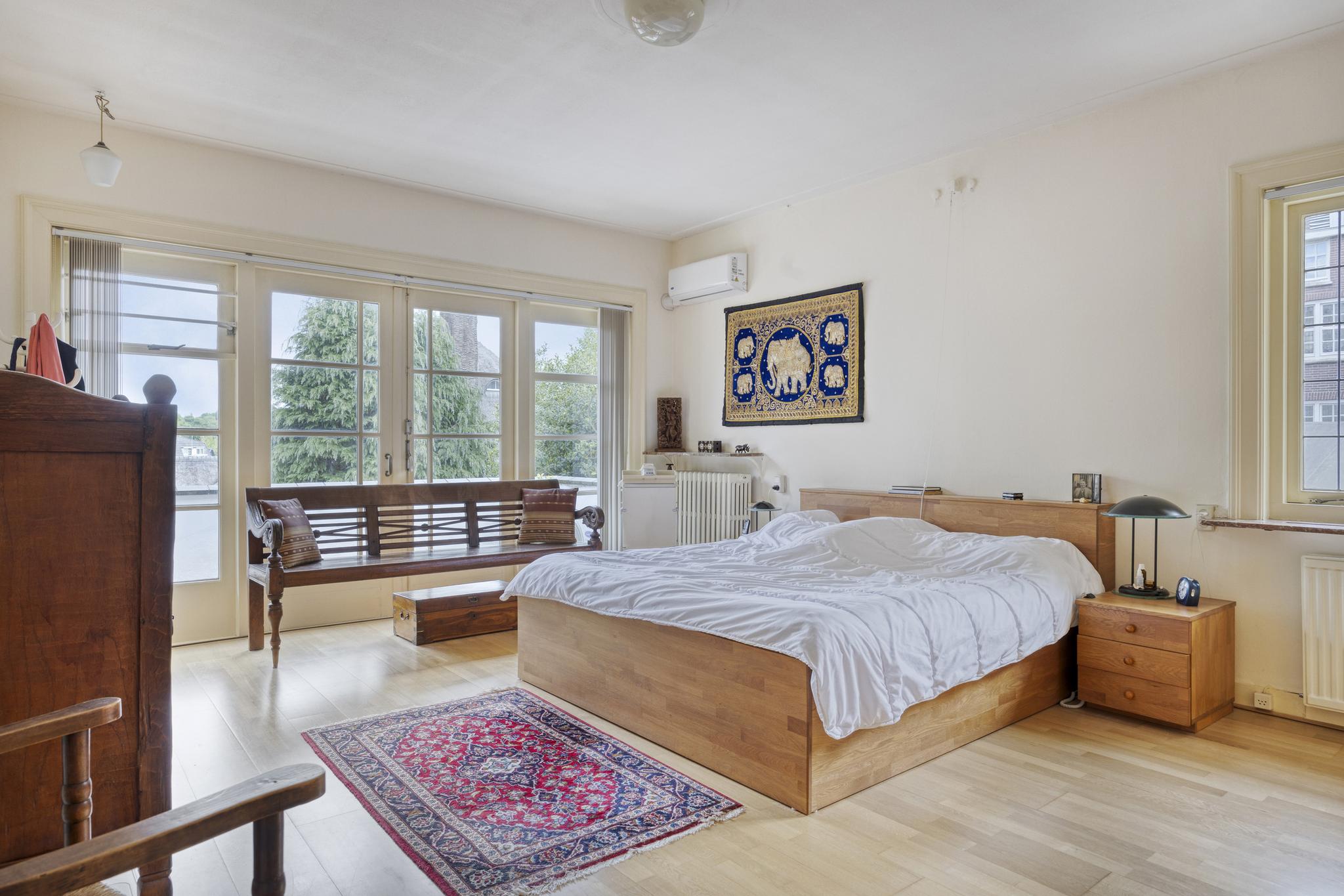 Royale ouderslaapkamer met balkon, deze kamer is voorzien van airco, een inbouwkast en een doorloop naar de badkamer, grote voorkamer met balkon, bereikbaar via open slaande deuren, mooie eiken visgraat parketvloer en een inbouwkast.