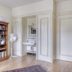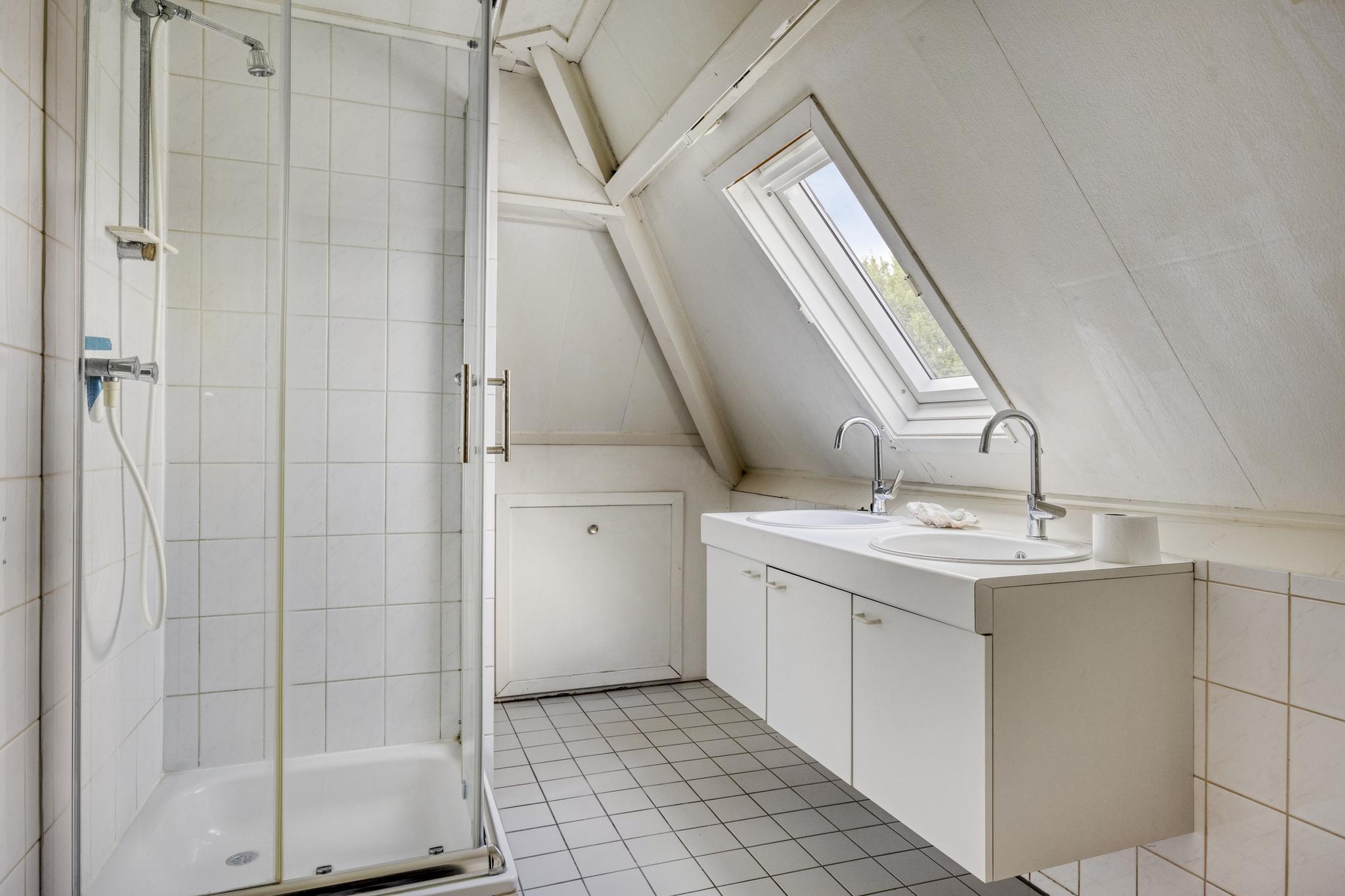 2e verdieping: Overloop met inbouwkasten. 3 slaapkamers met kastruimte. Witte badkamer met een douche, dubbele vaste wastafel en een linnen-kleedkast.