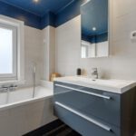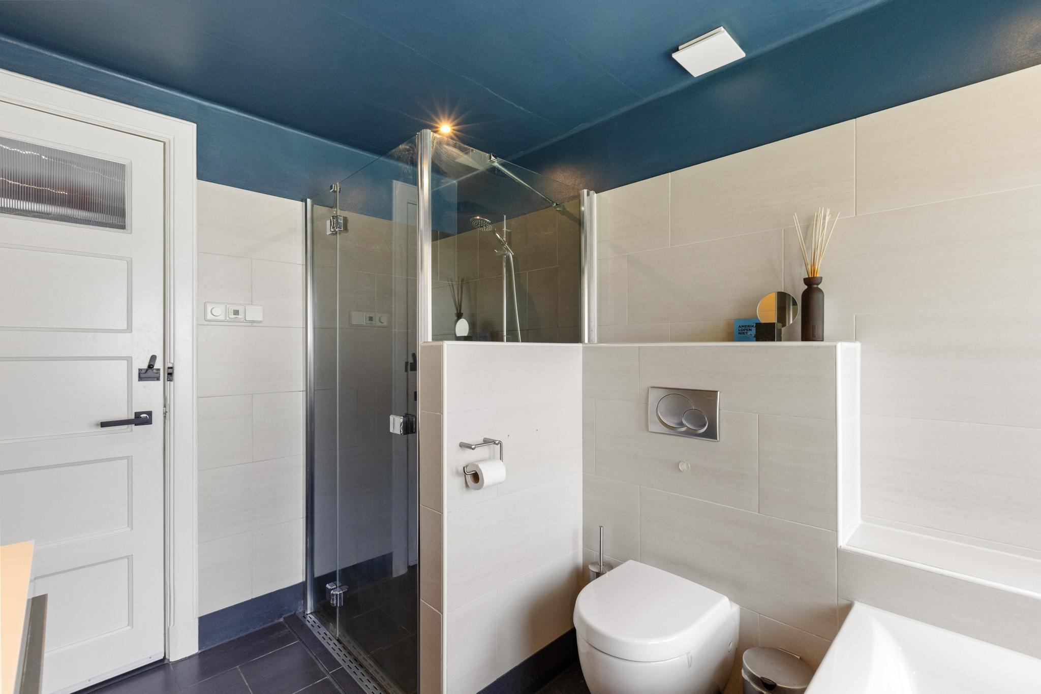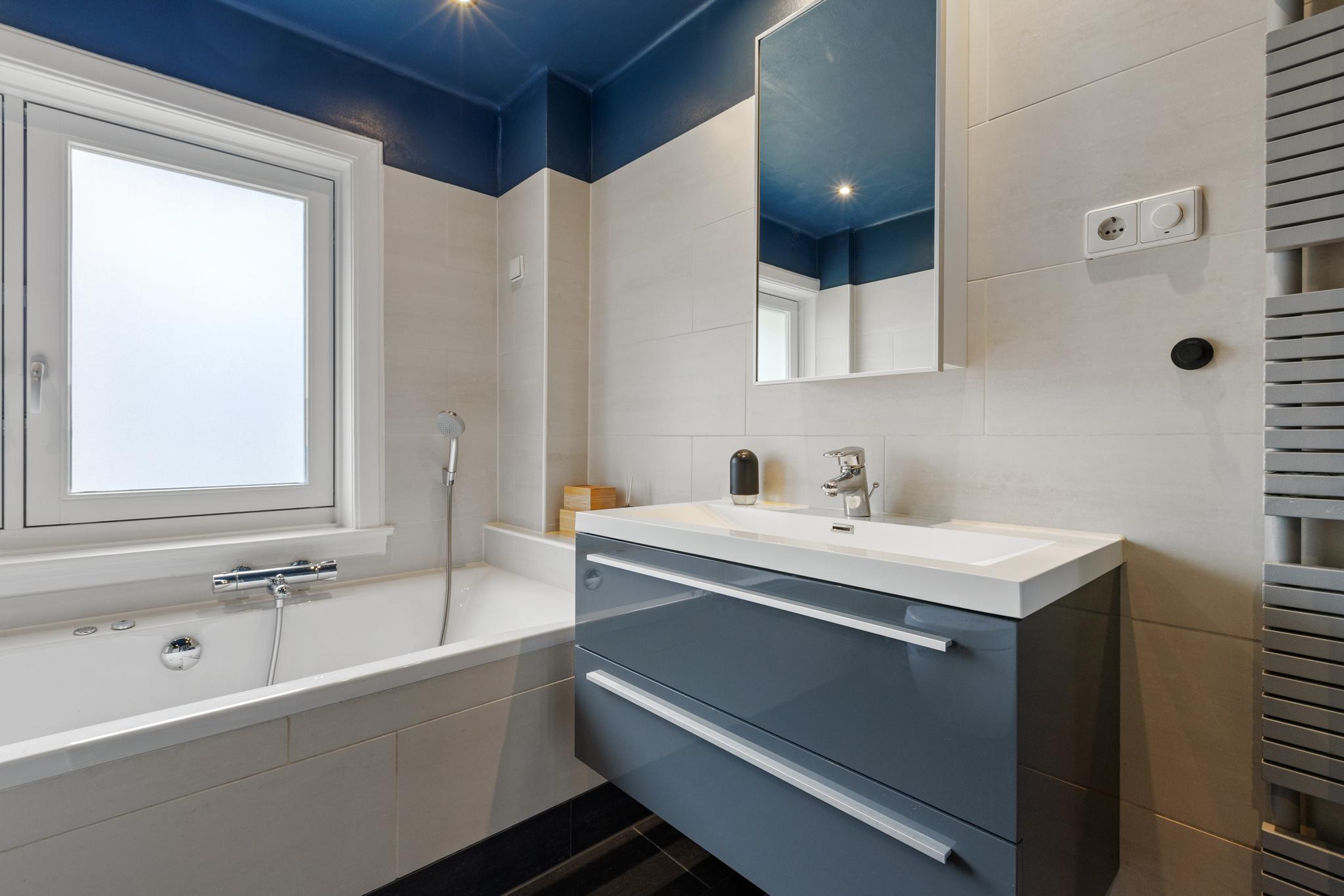 Aansluitend aan de eetkamer vindt u de moderne keuken, uitgevoerd in een stijlvolle donkerblauwe kleurstelling met een licht, keramisch aanrechtblad. De keuken is voorzien van diverse inbouwapparatuur en biedt voldoende werk- en opbergruimte. Een praktische deur geeft vanuit de keuken direct toegang tot de achtertuin.