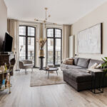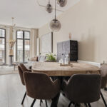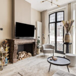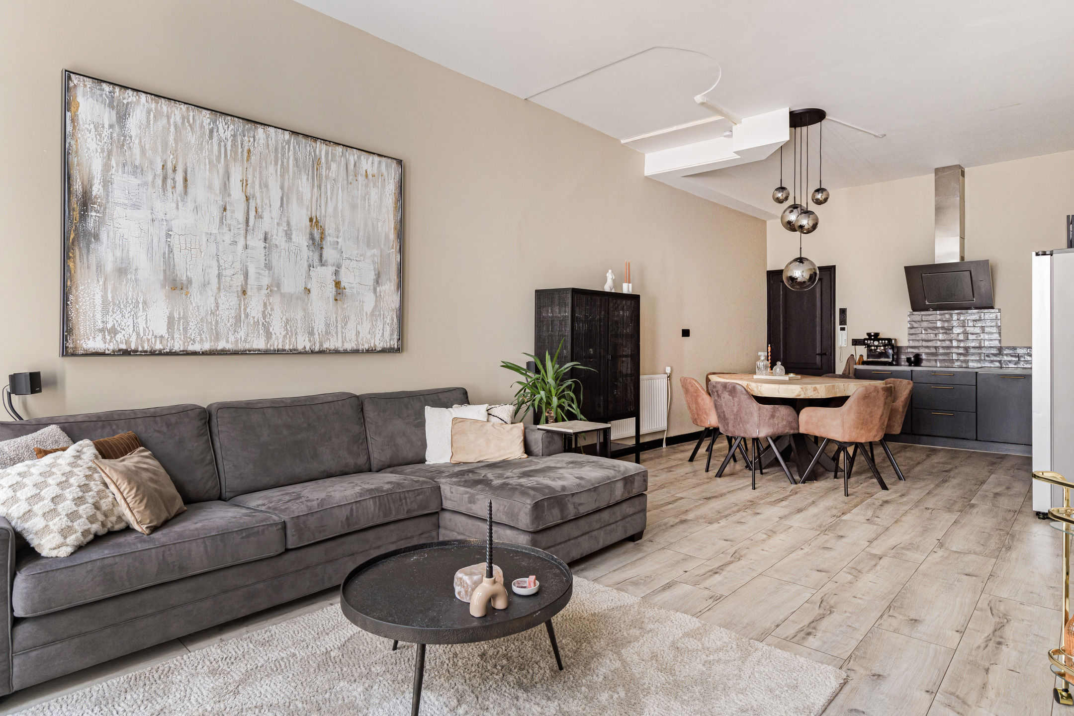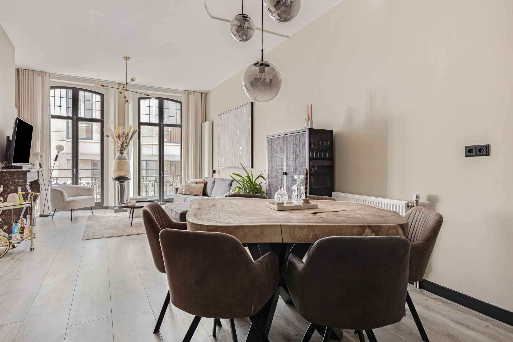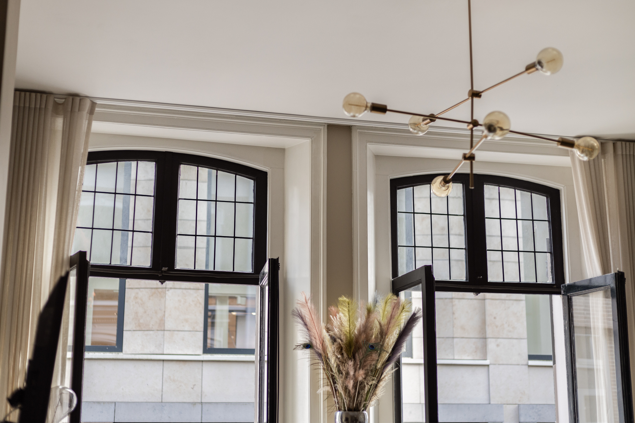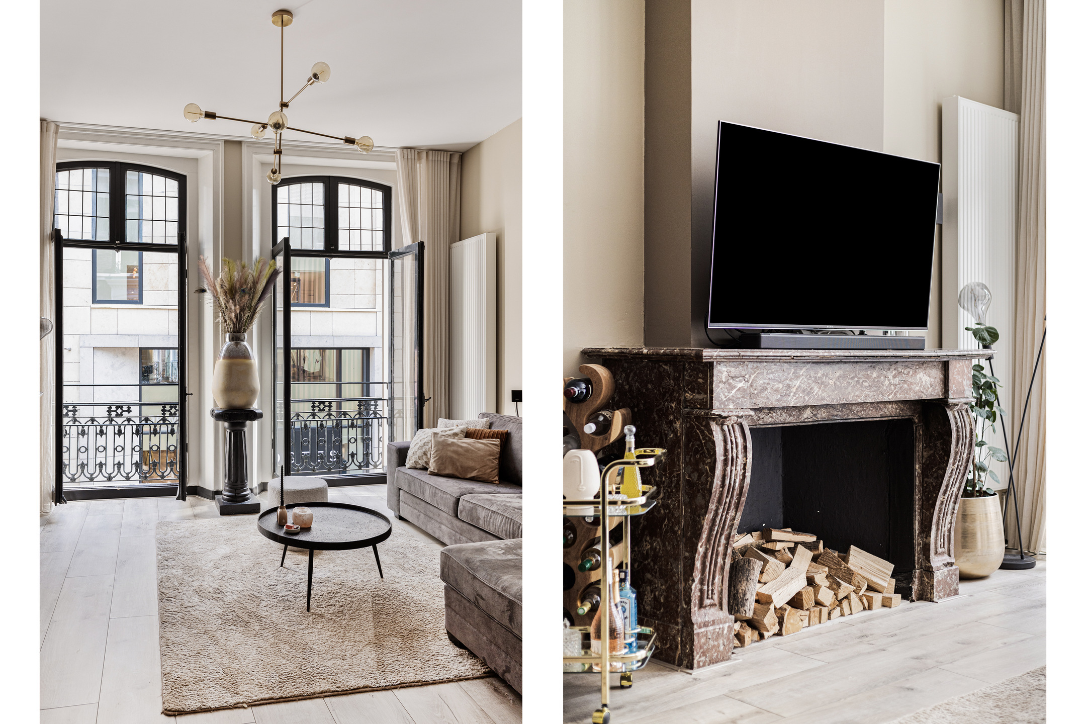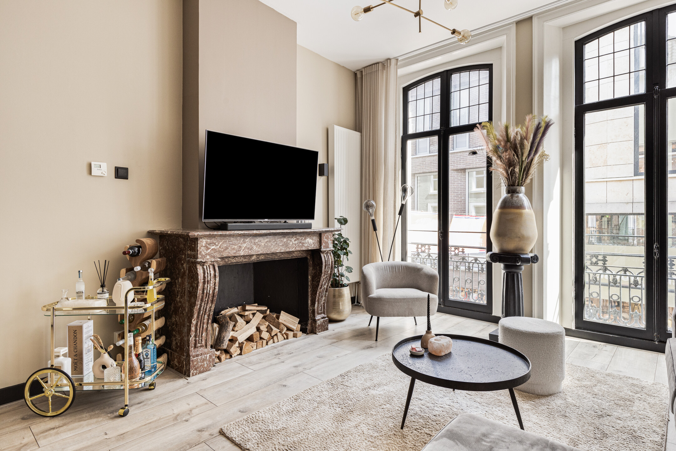 Loop je de gang helemaal door, dan kom je bij de woonkamer met open keuken. Dit is een op en top sfeervolle ruimte met twee prachtige dubbele hoge ramen die uitkijken op de Roggestraat. De ramen zijn voorzien van zijn gietijzeren Franse balkons, dus je kunt ze helemaal openzetten en zo buiten naar binnen halen. De ramen en de balkons zijn nog origineel, net als de marmeren schouw.