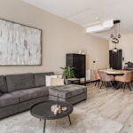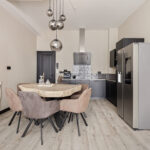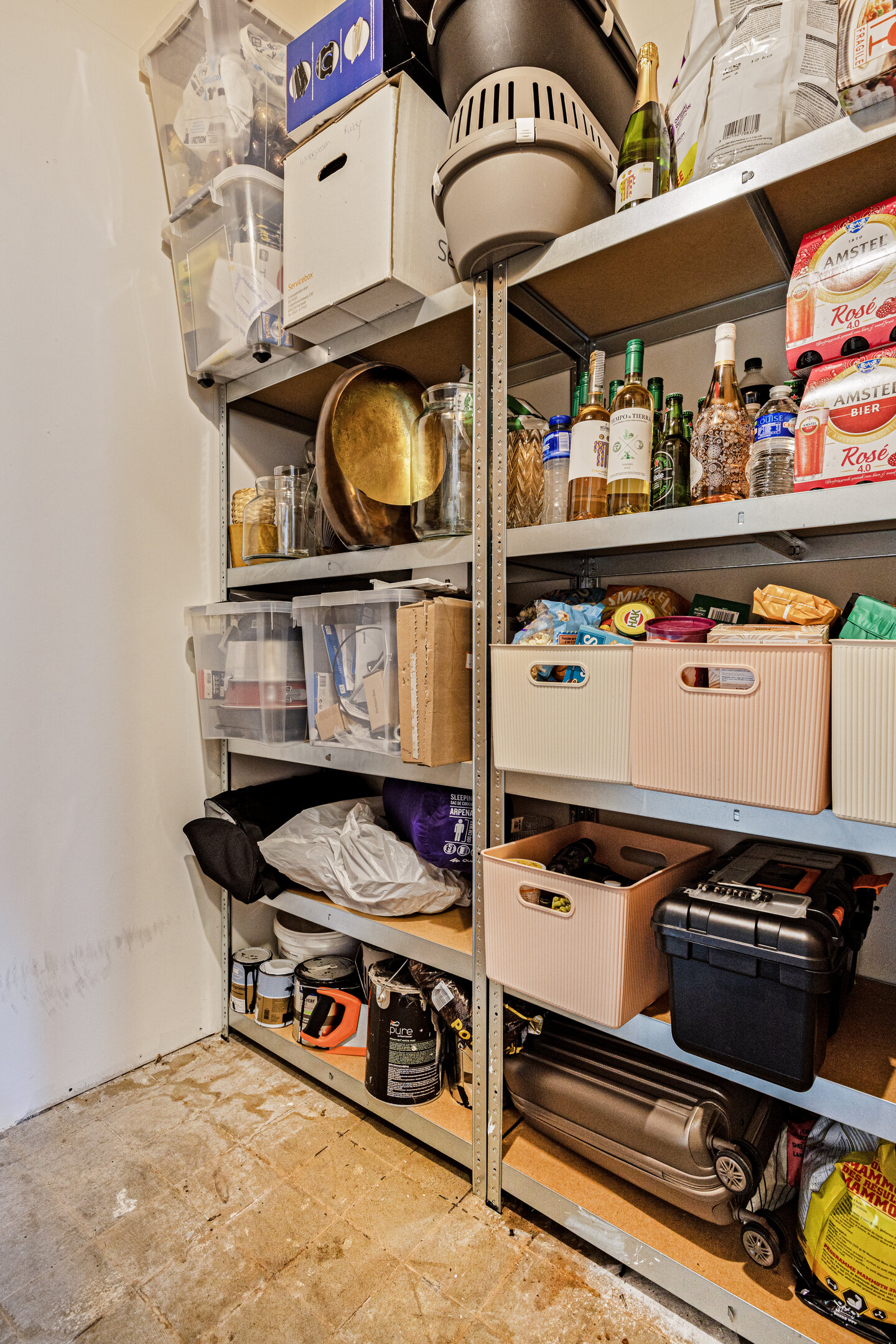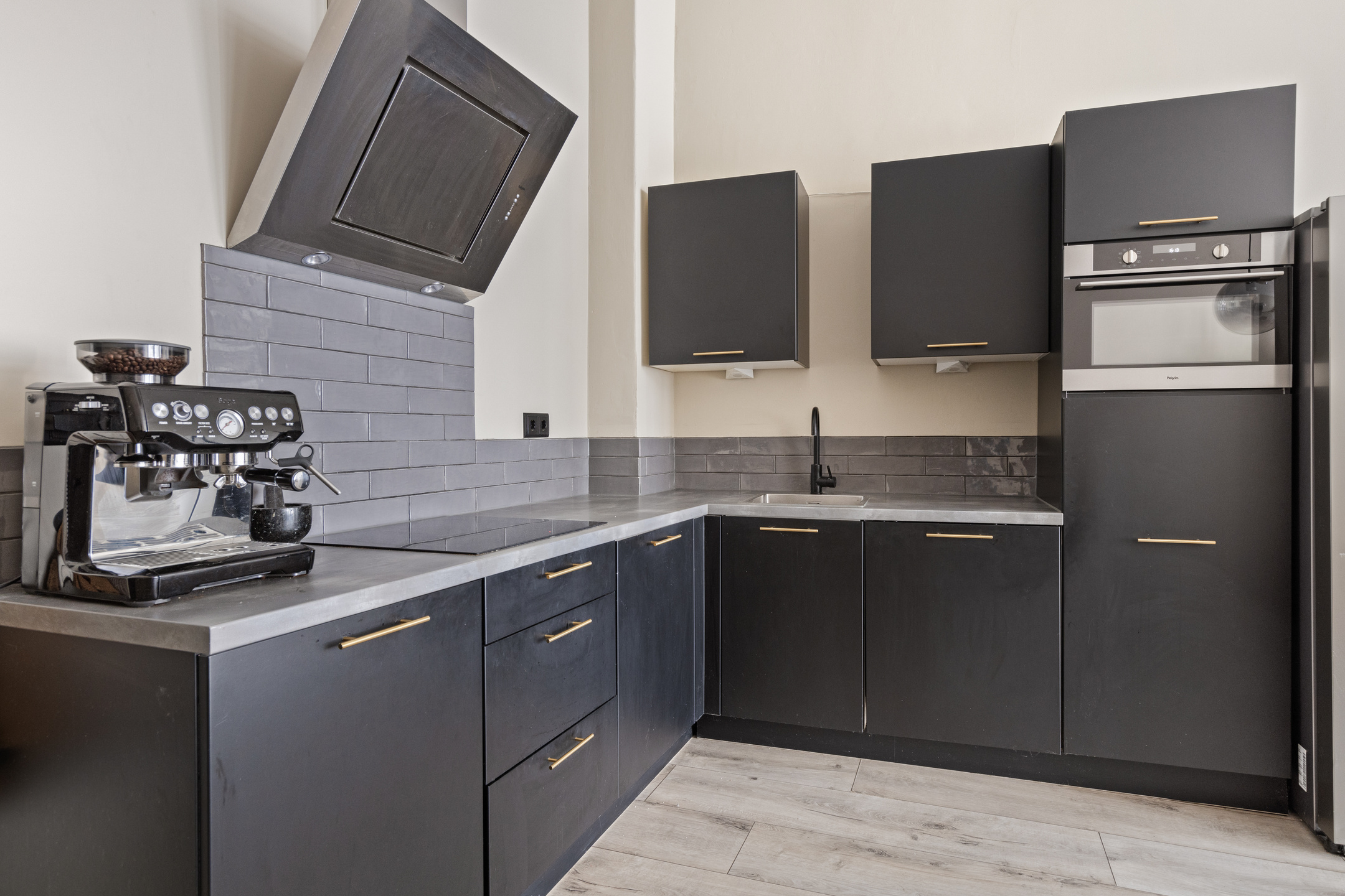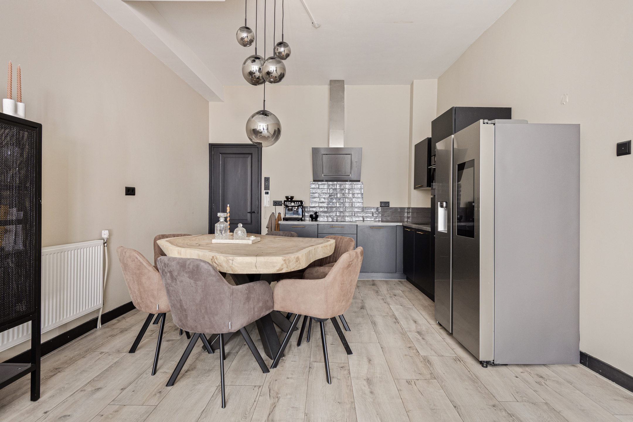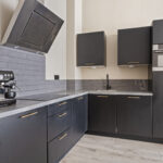De keuken is modern en is opgesteld in een L-vorm waardoor je veel berg- en werkruimte hebt. Hij is voorzien van een ingebouwde elektrische kookplaat, afzuigkap, combi-oven en vaatwasser.