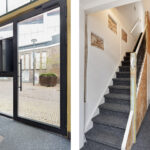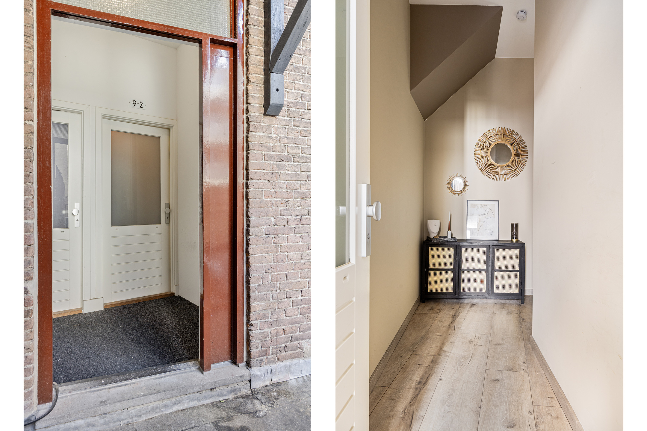 In de gezamenlijke entree op de begane grond heeft elk appartement zijn eigen berging. De trap leidt naar de 1e verdieping. Daar kom je in de hal van nummer 9-2. Aan de hal grenzen alle vertrekken in de woning. Er is nog een kleiner halletje, met de deur naar een van de twee terrassen. Dit terras is L-vormig en ongeveer 10 m2 groot.