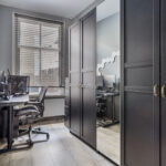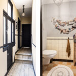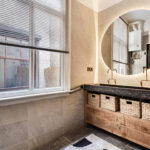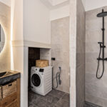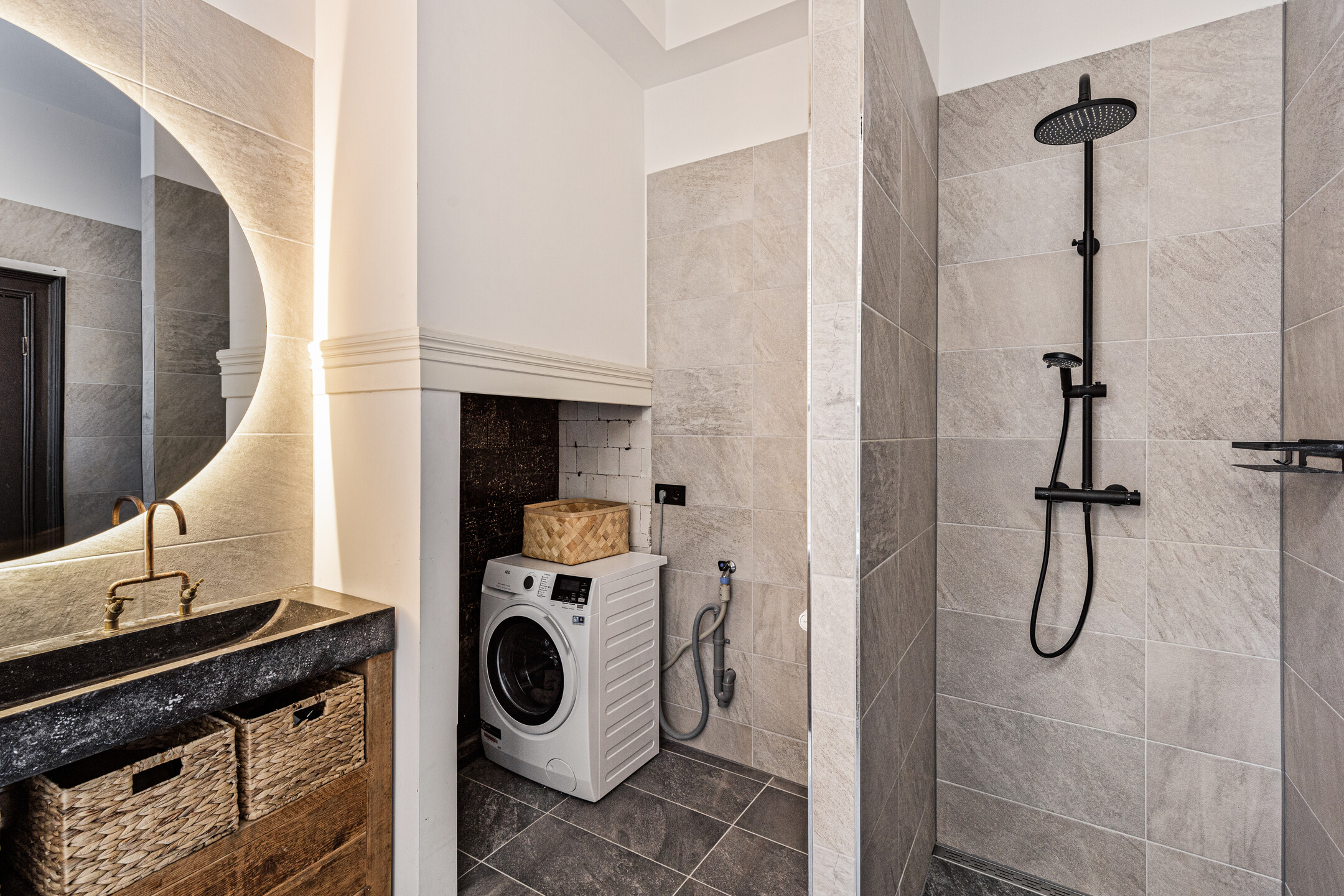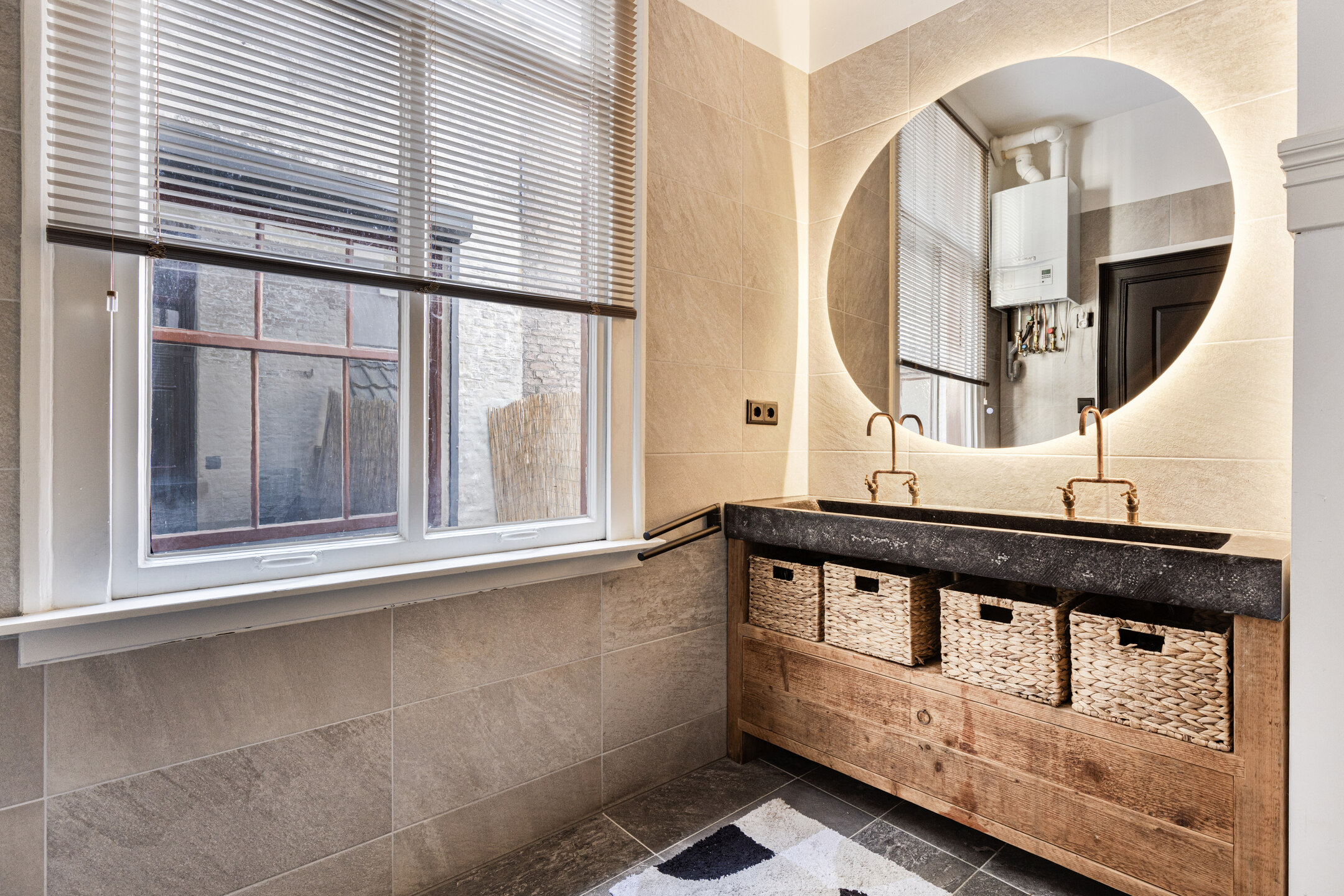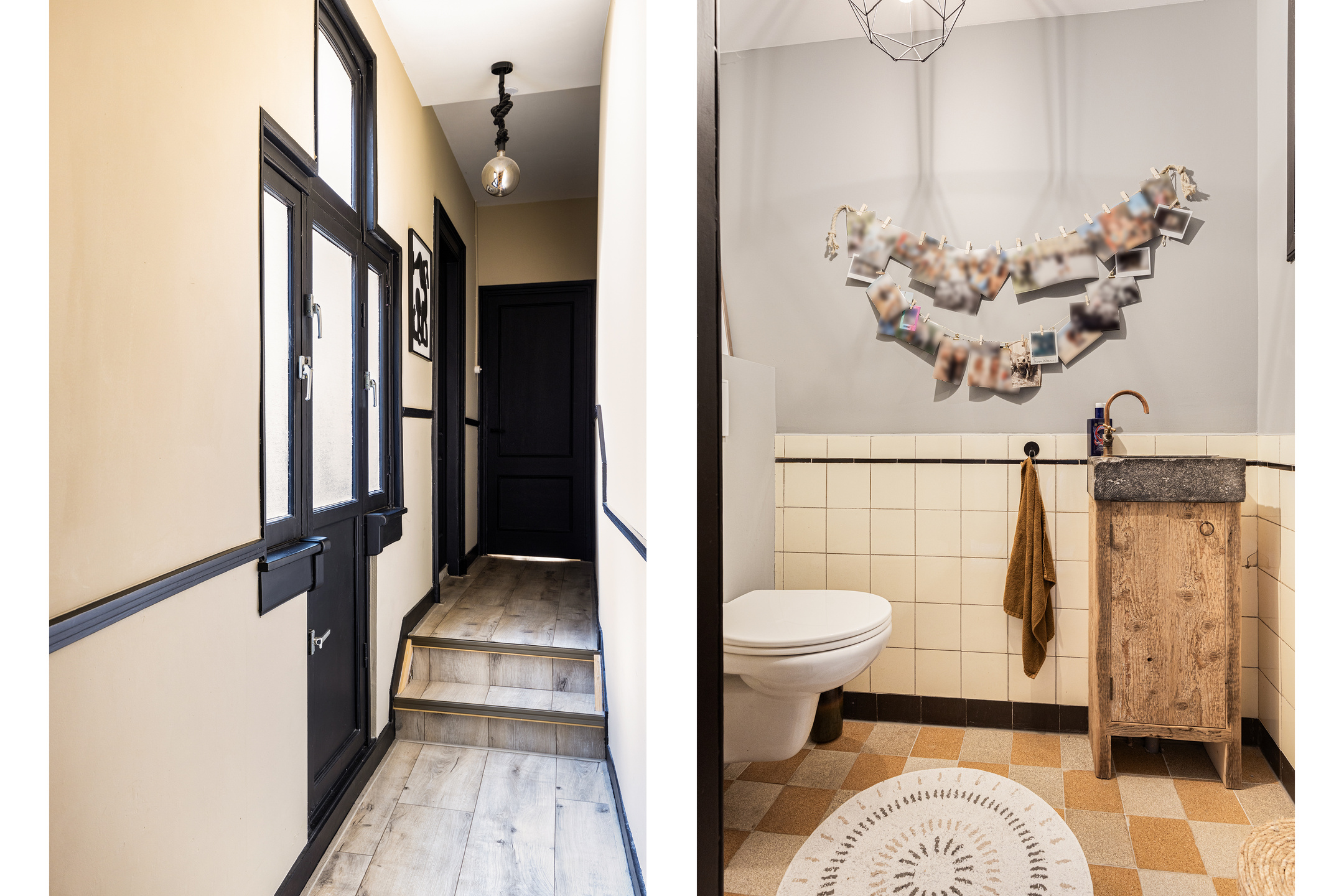 Terug in de hal, ligt rechts de badkamer. Hij is luxe en modern ingericht met klassieke, stoere elementen. Er is een inloopdouche en een dubbele wastafel met koperen kranen. De ruimte is betegeld in betongrijs. De wc is in een andere ruimte, verderop in de hal.