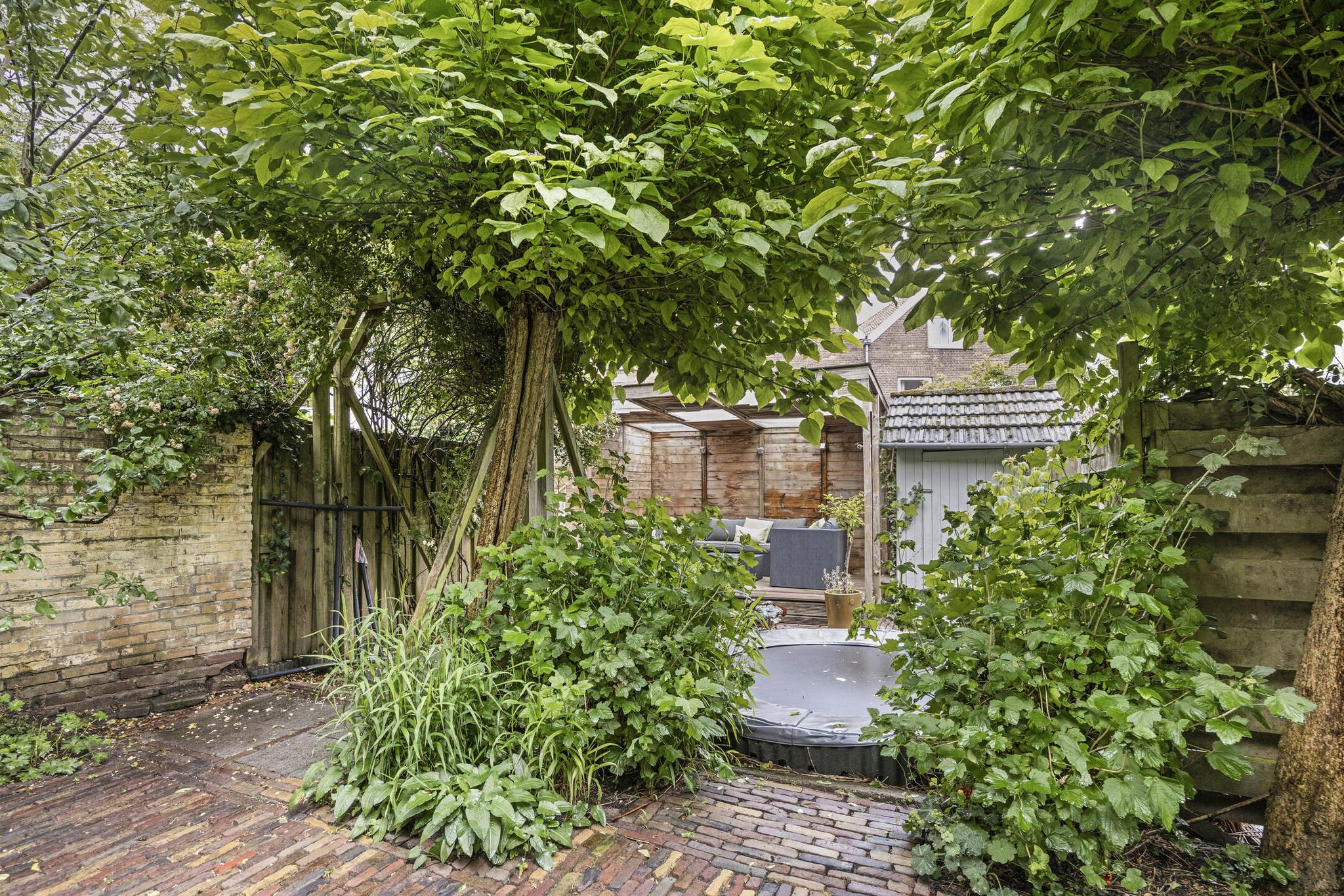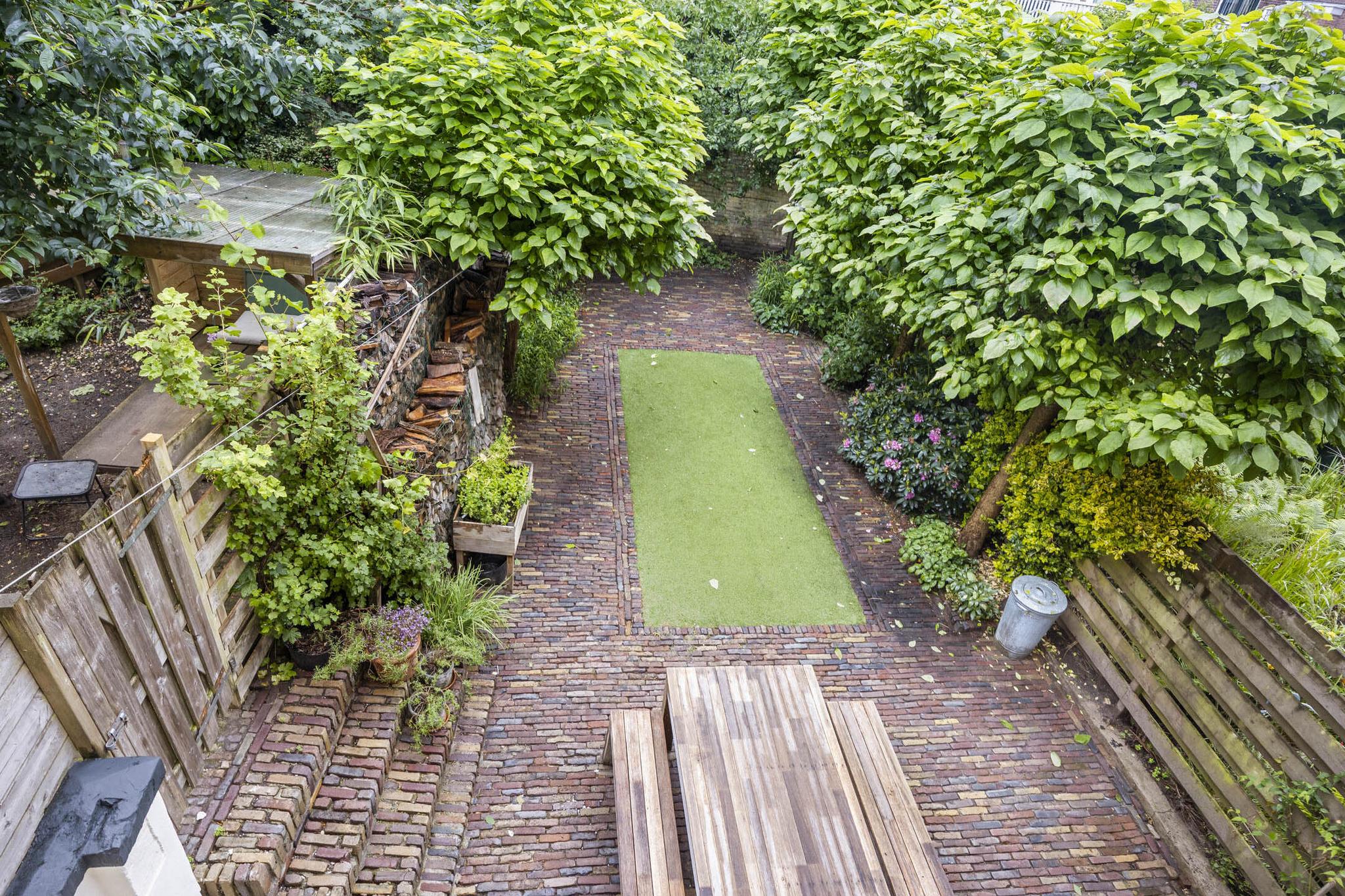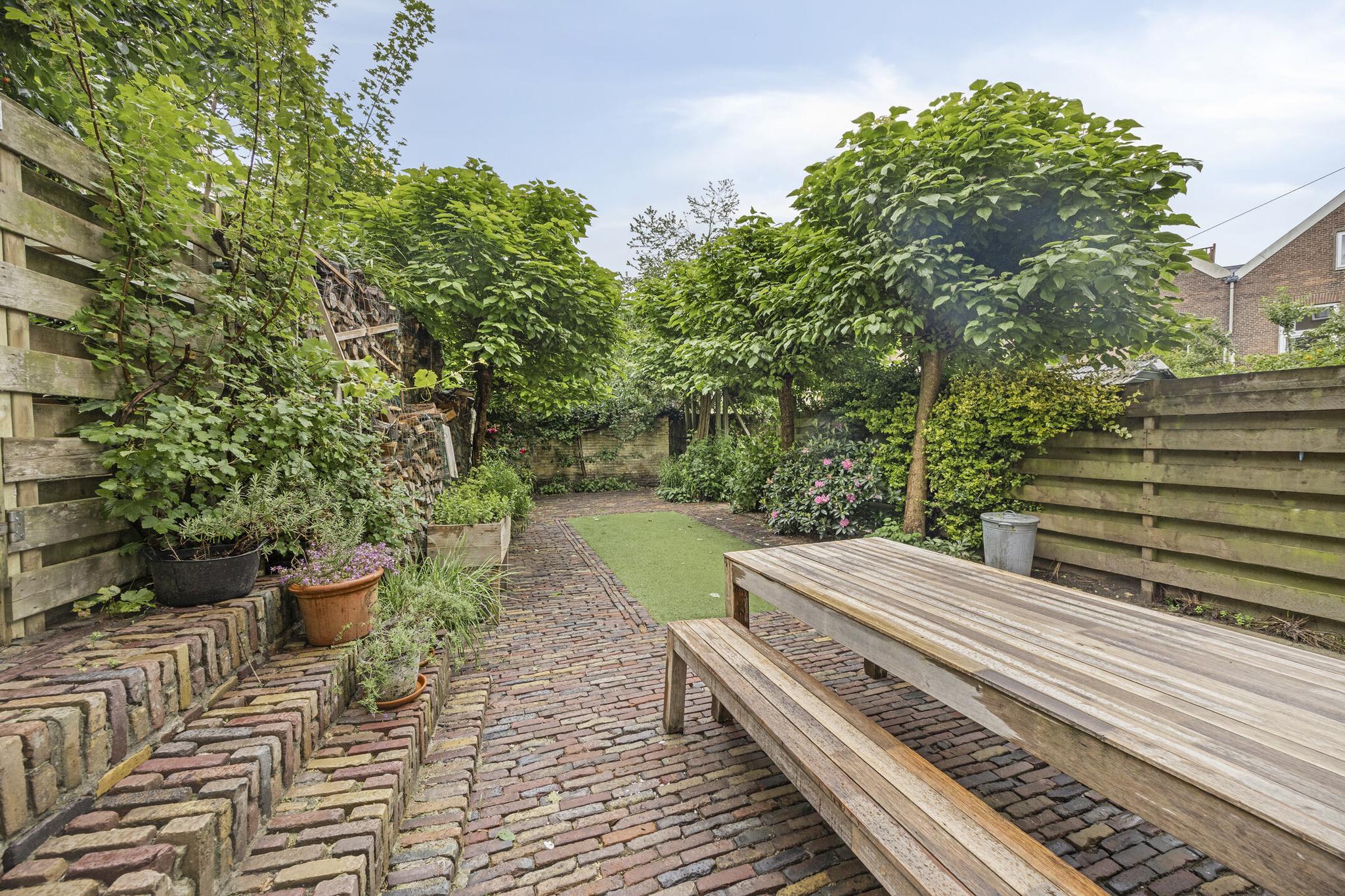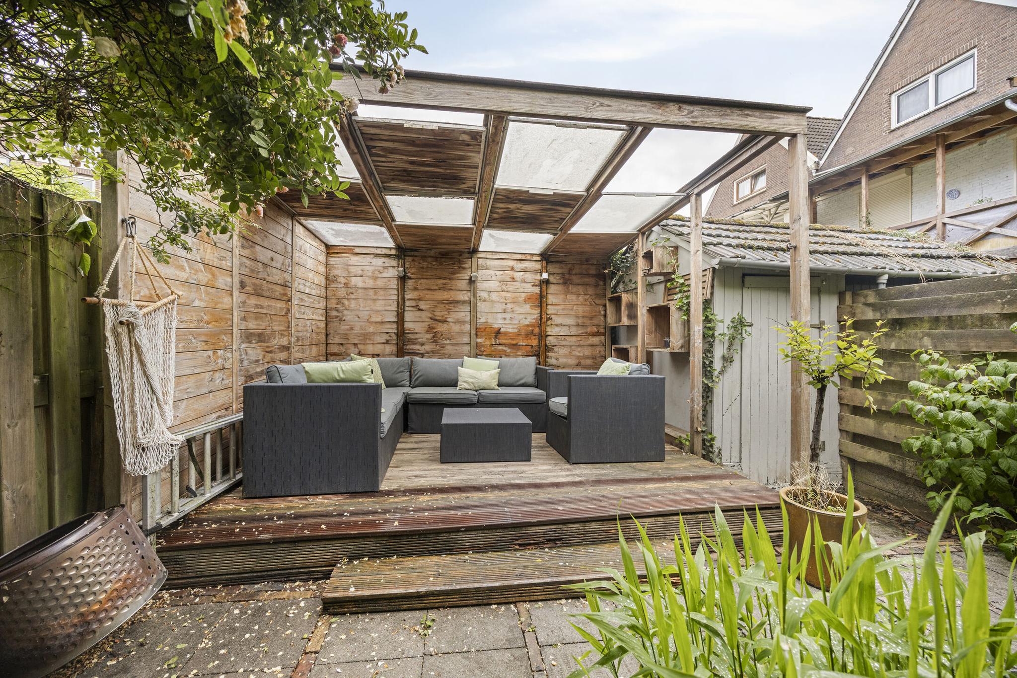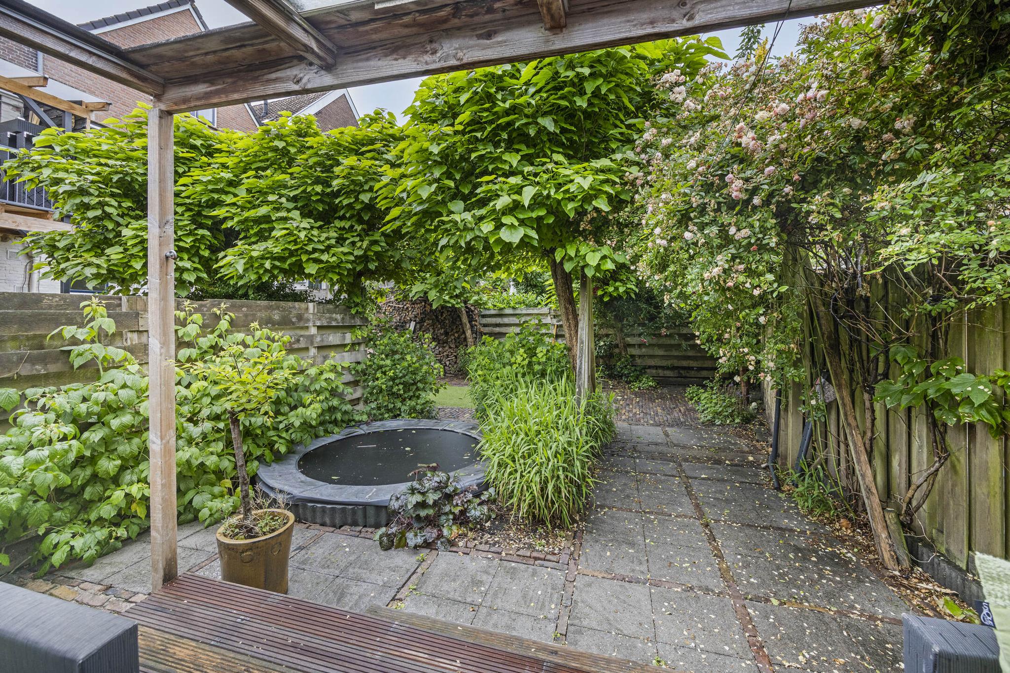 De diepe, L-vormige tuin is een waar verlengstuk van je leefruimte. Dankzij de meerdere zonnige terrassen kun je hier op elk moment van de dag genieten. De tuin beschikt over een praktische berging én een handige achterom.