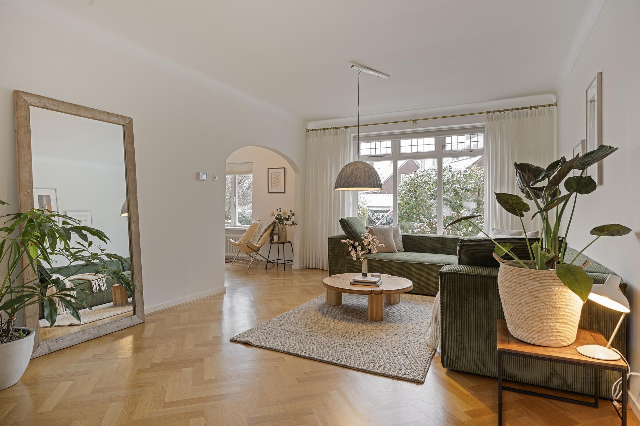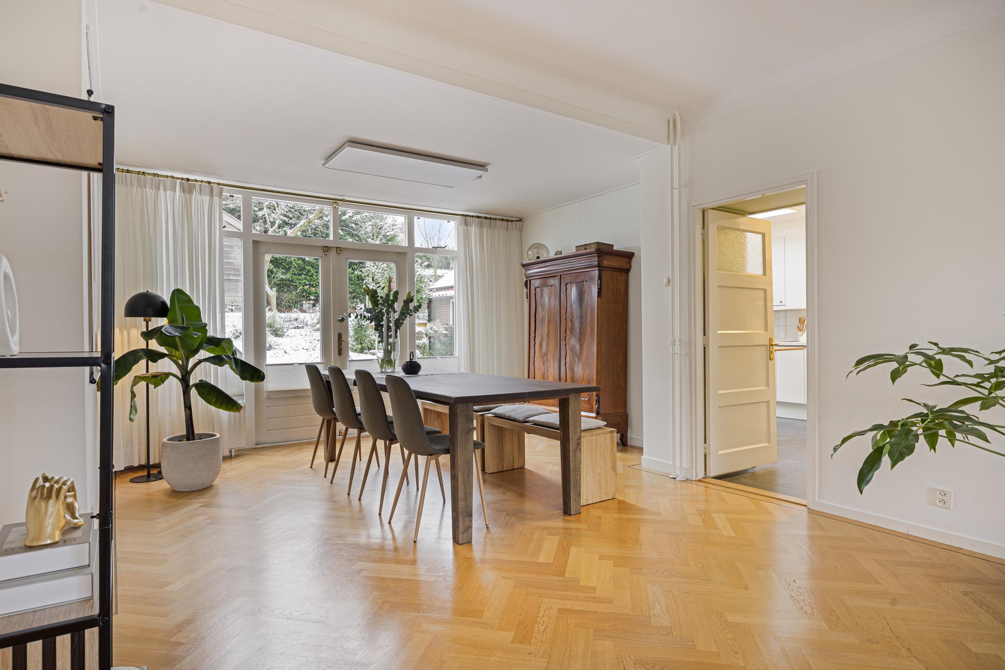 De entree is een plaatje: een statige, ruime hal met eikenhouten trap, toegang naar de nette kelder, een moderne toiletruimte, en deuren naar woonkamer en aparte eetkeuken. De zeer lichte, ruime L-vormige woonkamer heeft een fraaie houten visgraat vloer, en enorme raampartijen met glas in lood details. De goed onderhouden eetkeuken heeft een moderne PVC vloer en is voorzien van inbouwapparatuur waaronder vaatwasser, inductie kookplaat, koelkast en magnetron.