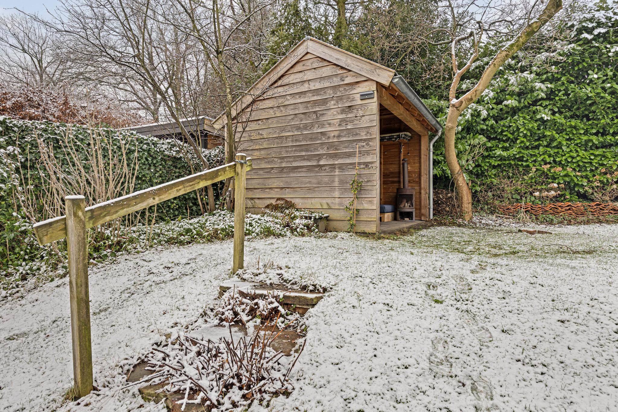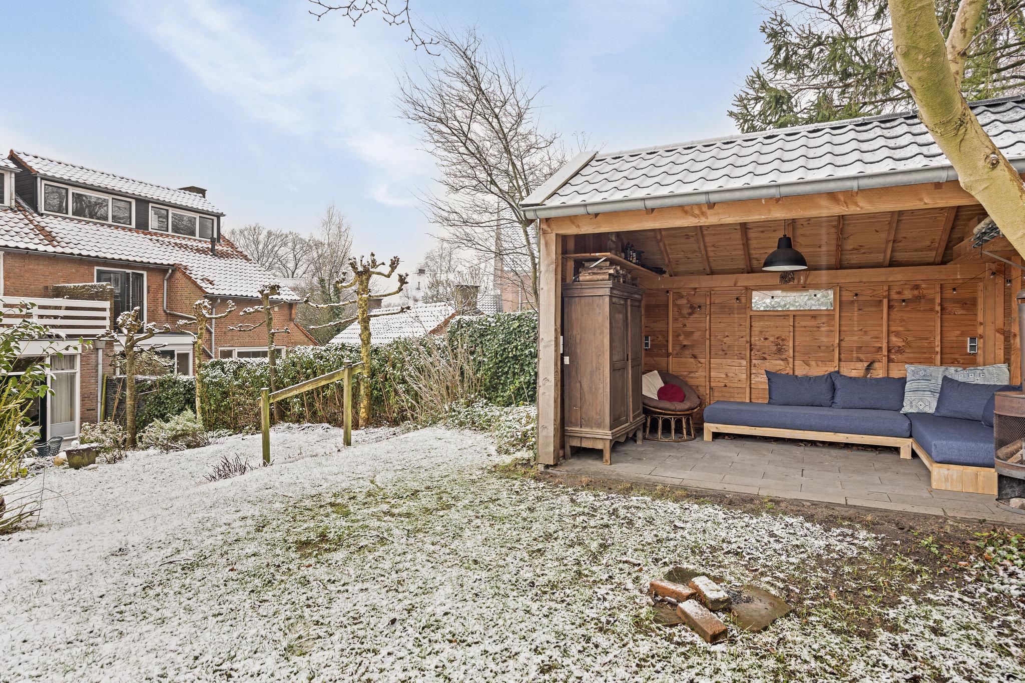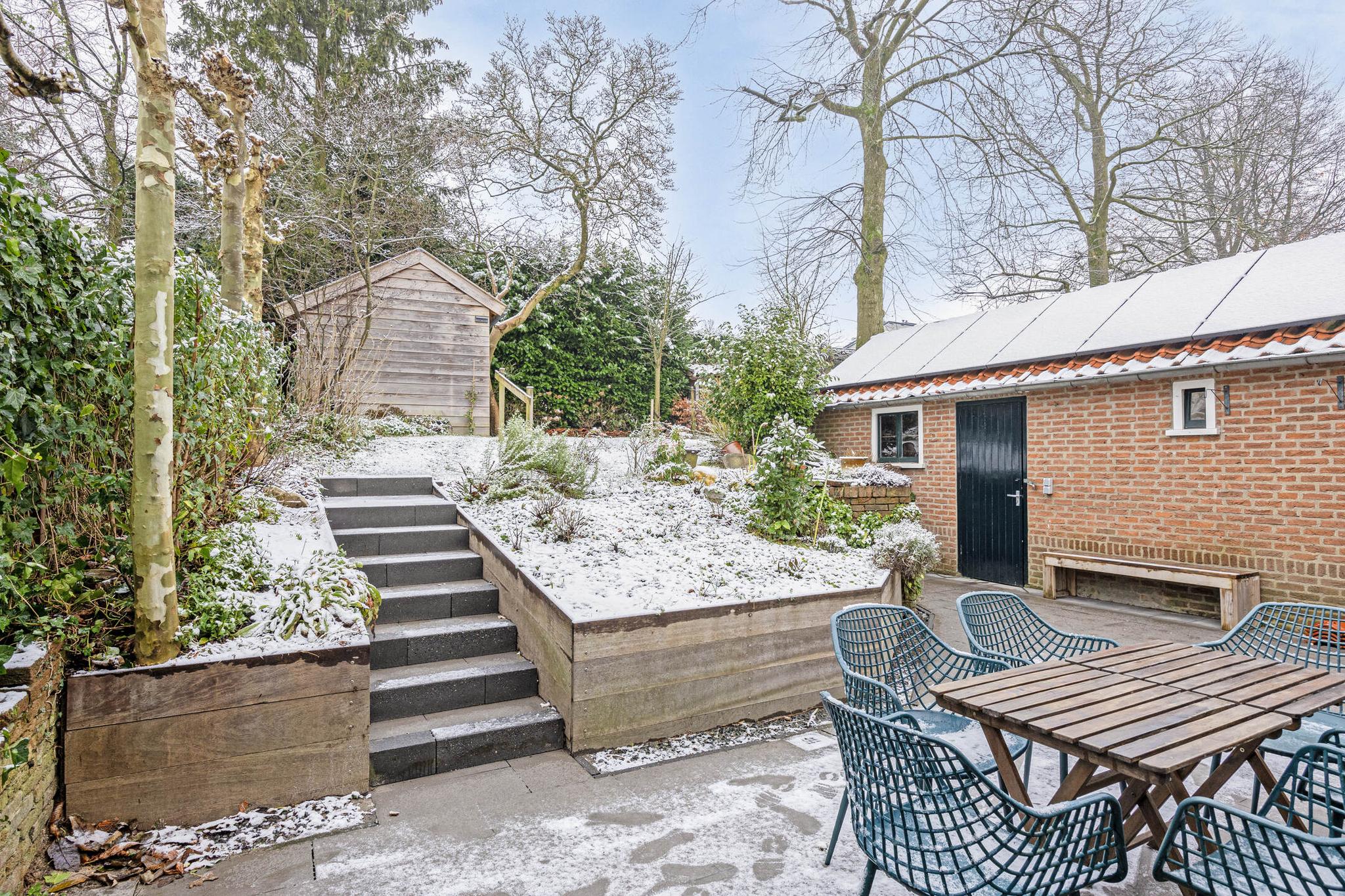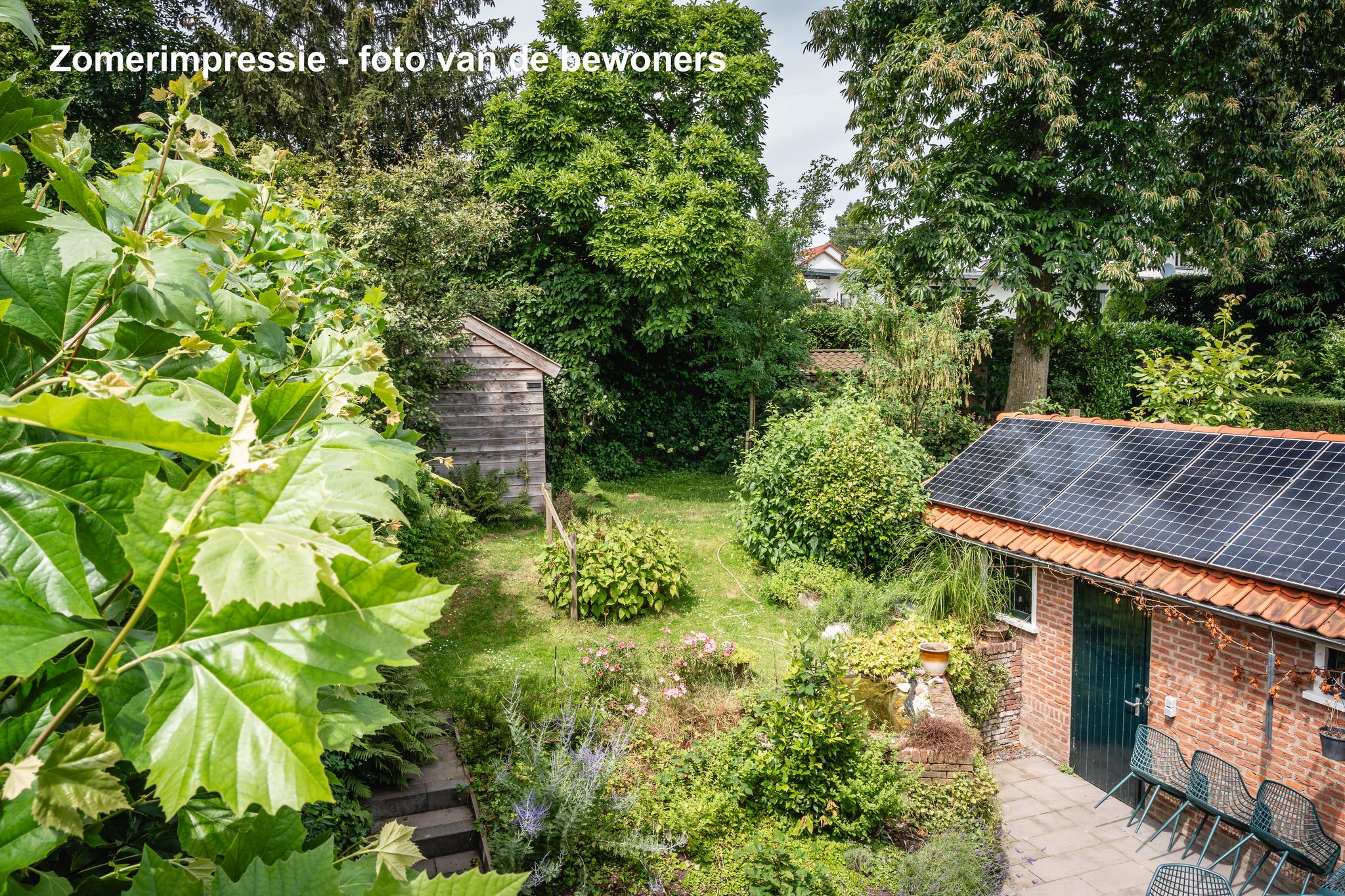 Zowel de keuken als de woonkamer bieden toegang tot buiten: een heerlijk terras met daarachter een fraai aangelegde en goed verzorgde groene oase. Door het hoogteverschil, en de strategisch geplaatste bomen heb je er veel privacy. Achter in de tuin staat een sfeervolle kapschuur met elektriciteit, ideaal om ’s ochtends te genieten van de eerste zonnestralen en een kopje koffie. ’s Avonds steek je het houtkacheltje aan en creëer je een gezellige plek om de dag af te sluiten.