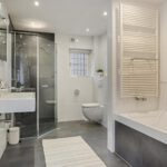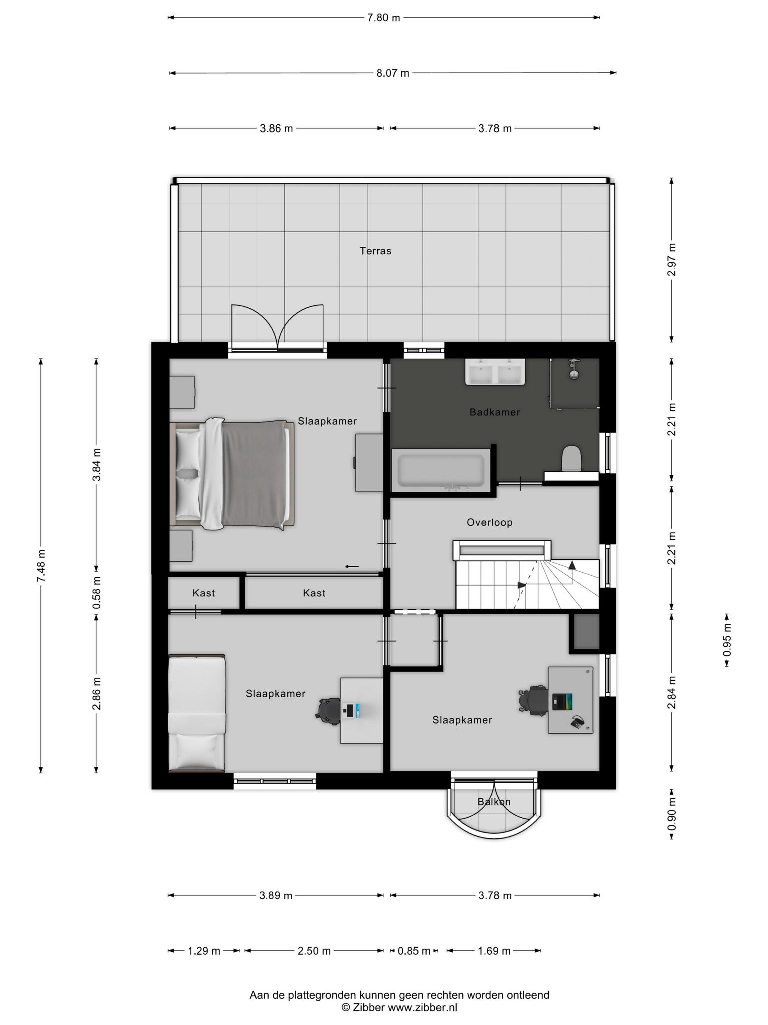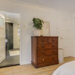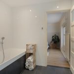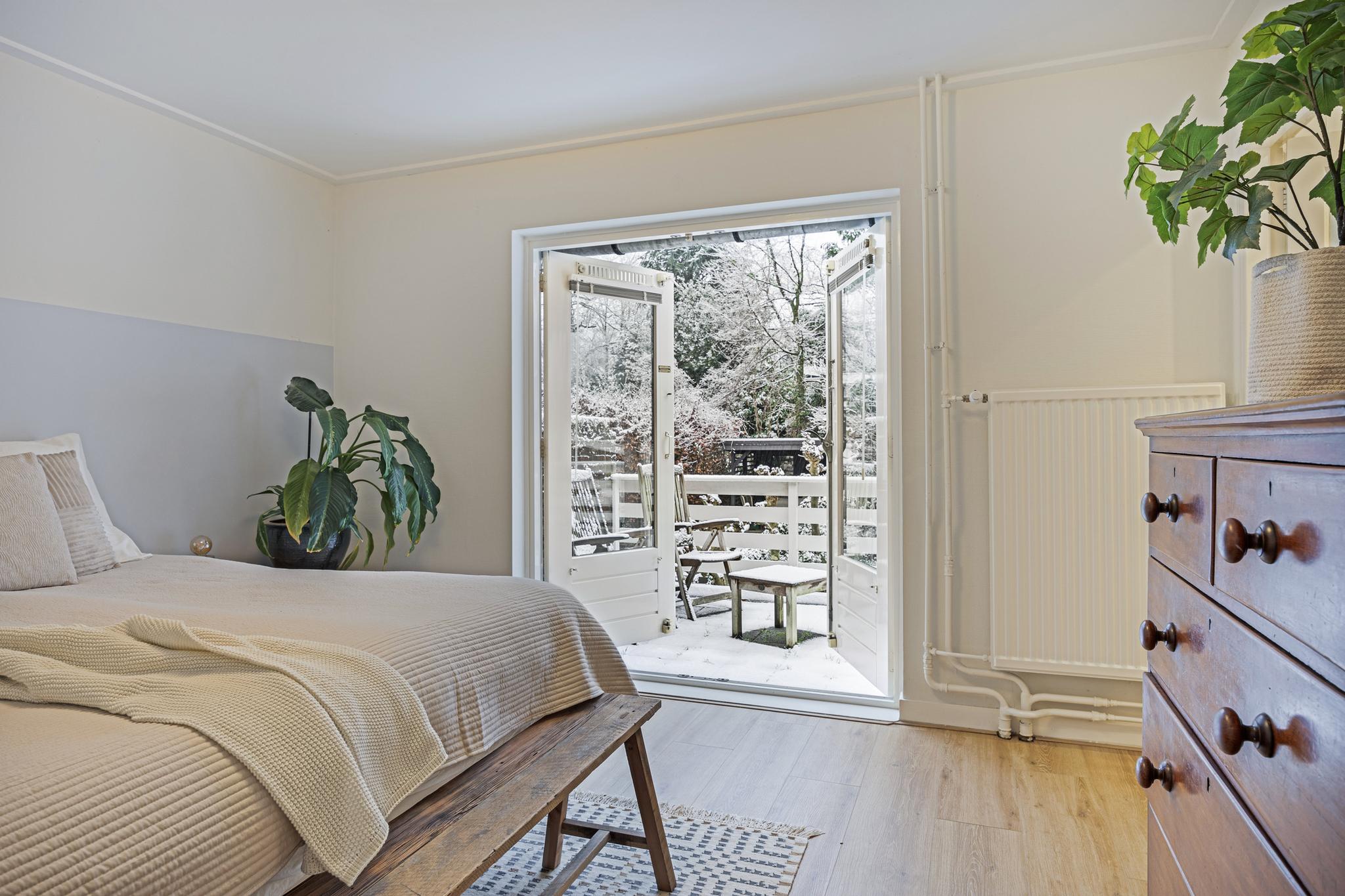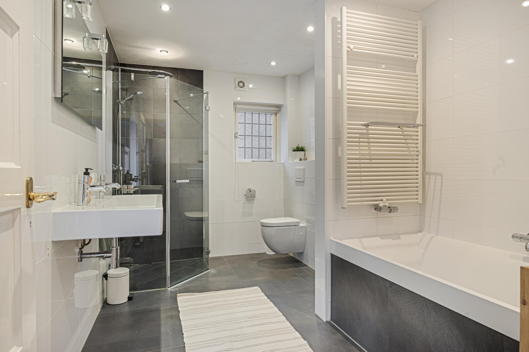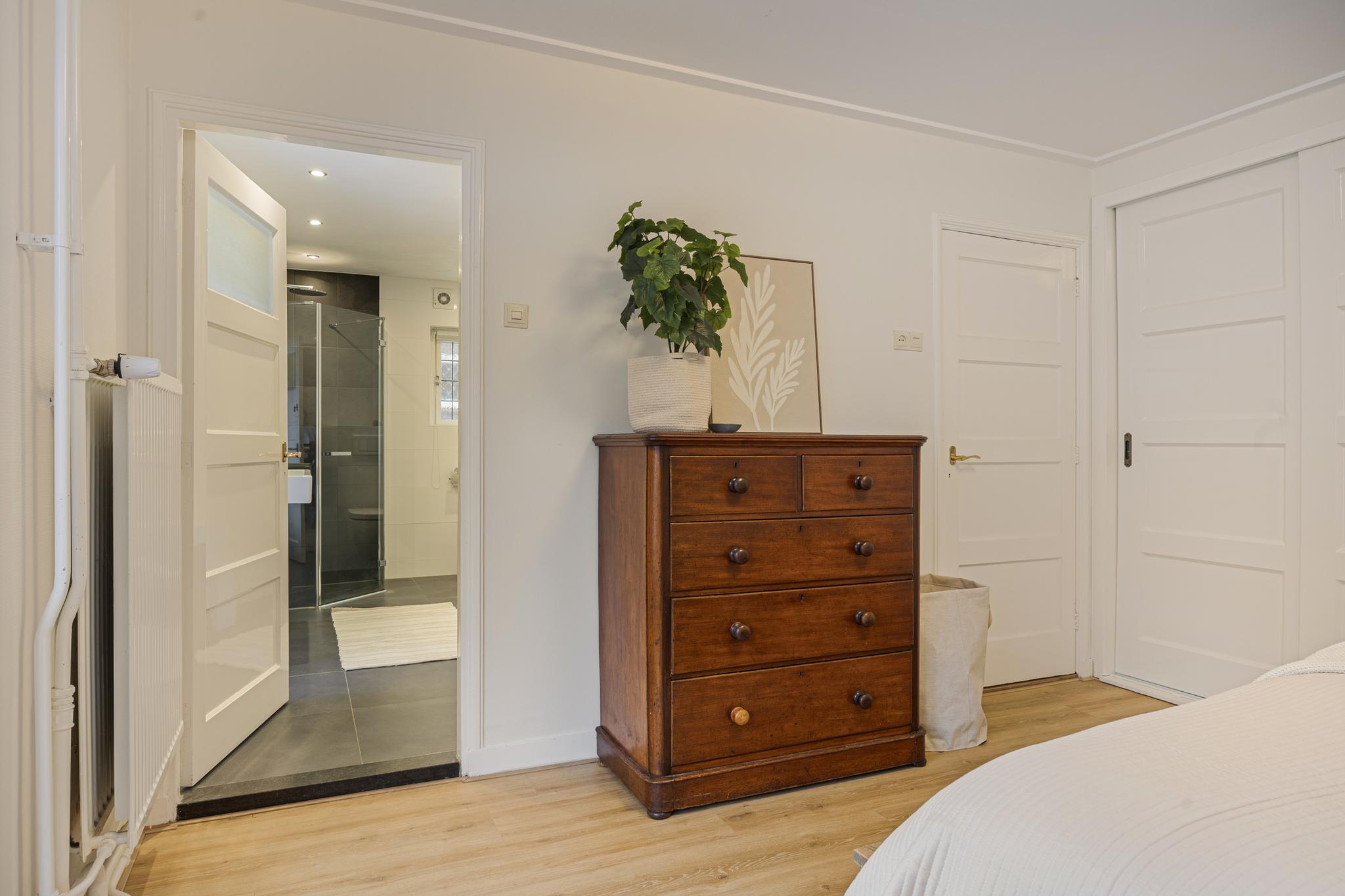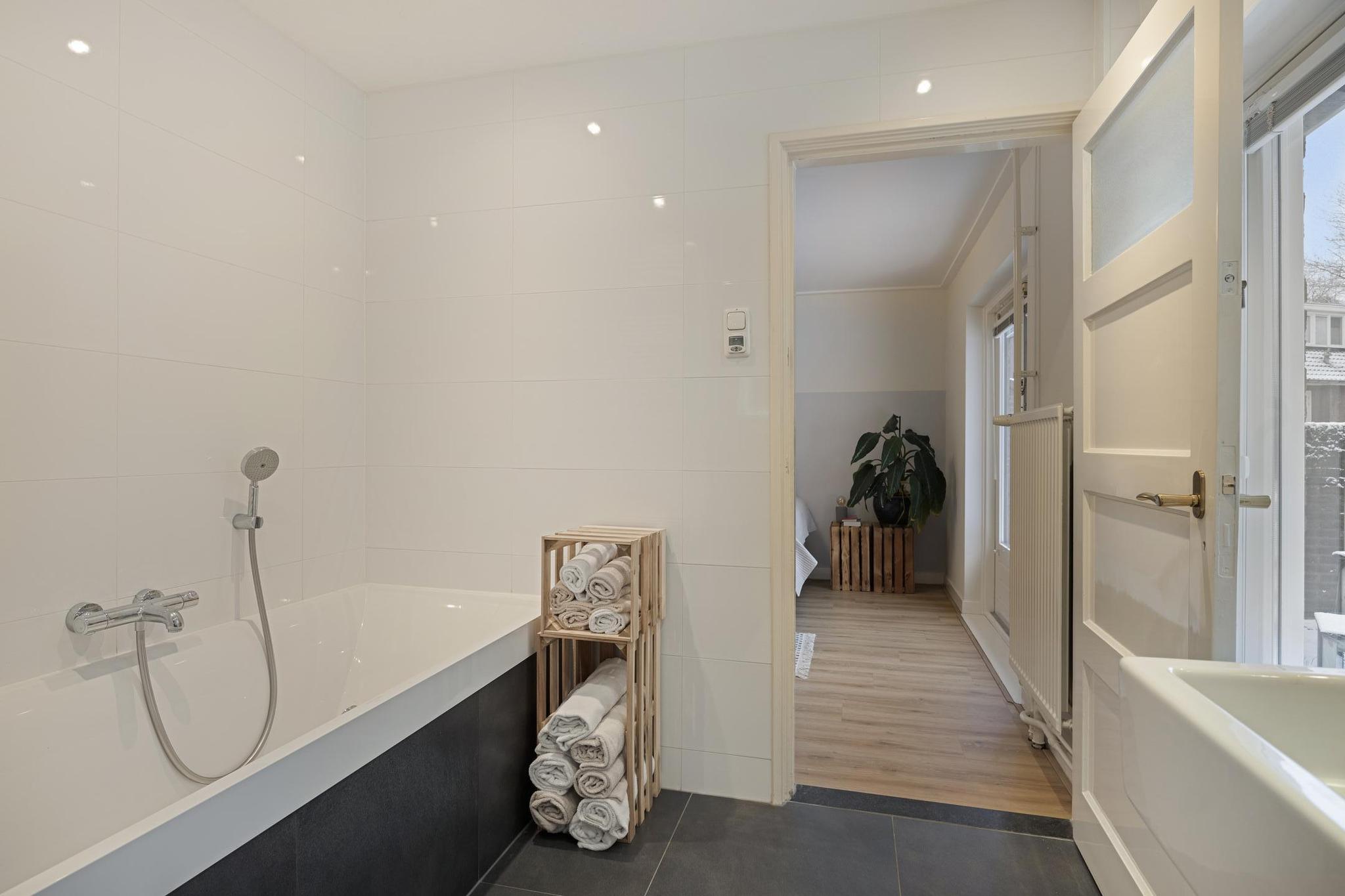 Op de eerste verdieping zijn er een ruime overloop, drie slaapkamers, en een moderne en comfortabele badkamer met een ligbad, een inloopdouche, een wastafelmeubel, een toilet en vloerverwarming. De grootste slaapkamer heeft de badkamer ensuite, fraaie inbouwkasten met schuifdeuren, en openslaande deuren naar een pand-breed dakterras met veel privacy en uitzicht op de tuin. Twee slaapkamers zijn aan de voorzijde gesitueerd. Eén hiervan heeft toegang naar een Frans balkon. Ook deze kamers hebben elk een inbouwkast.
