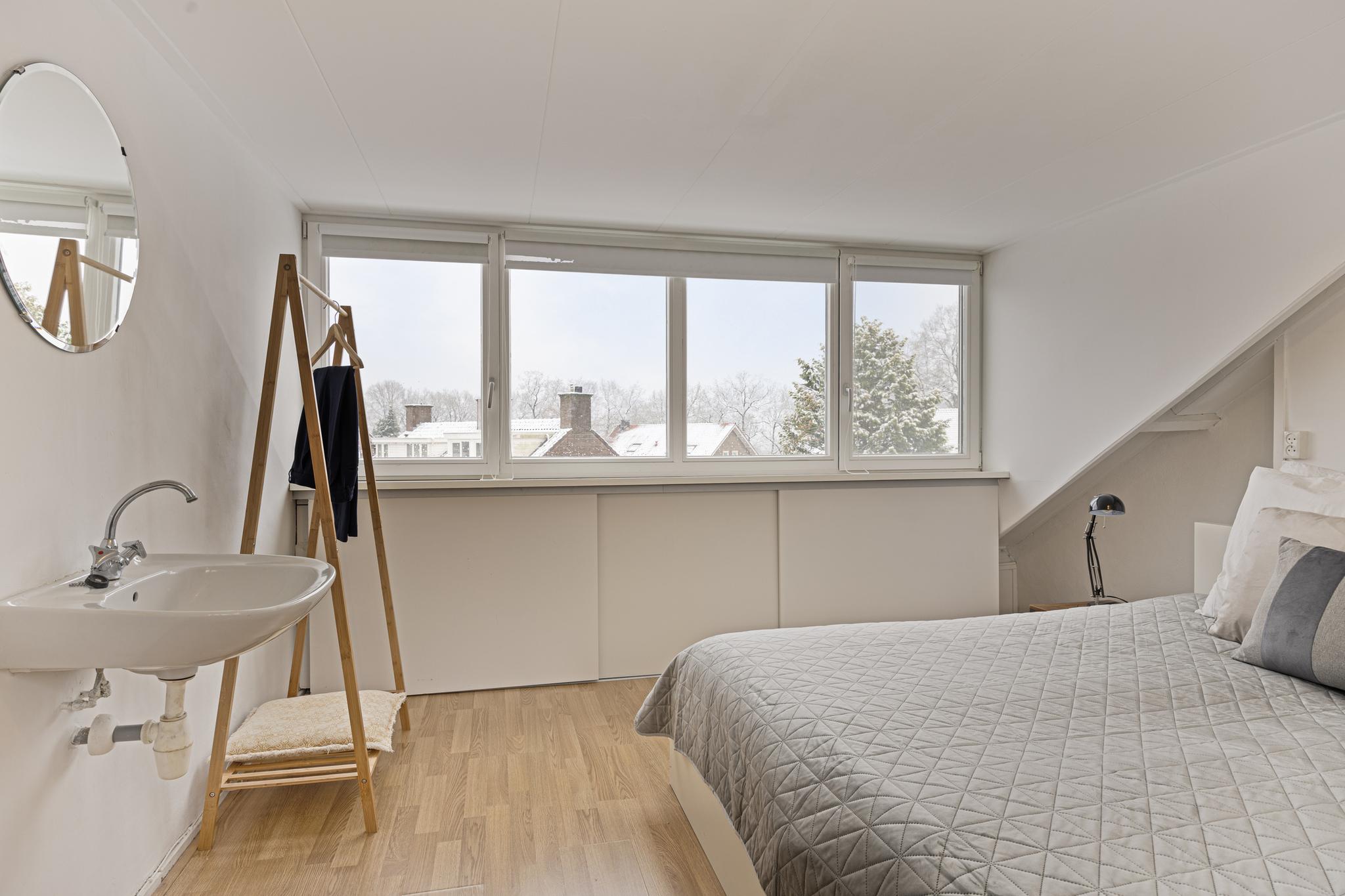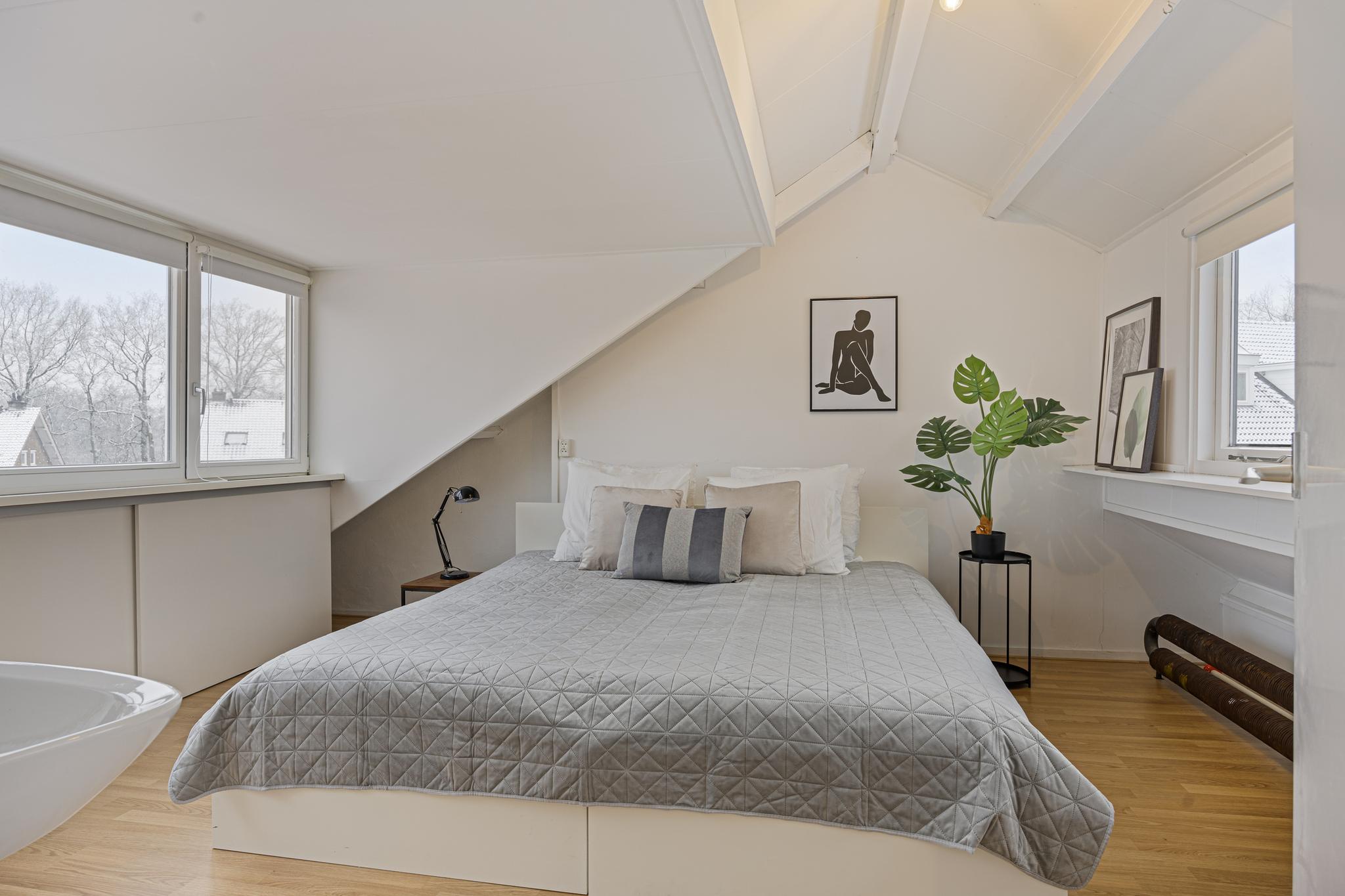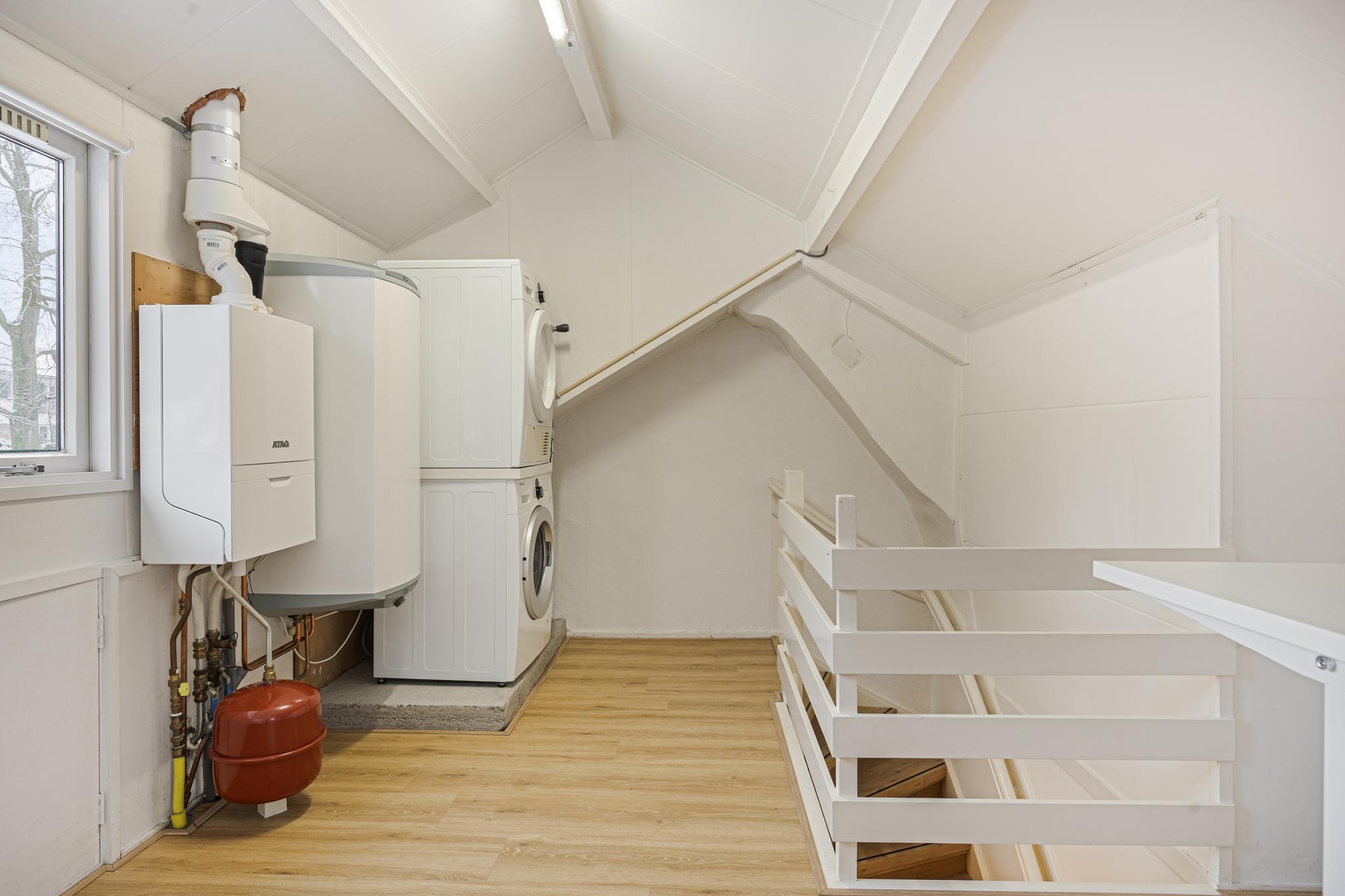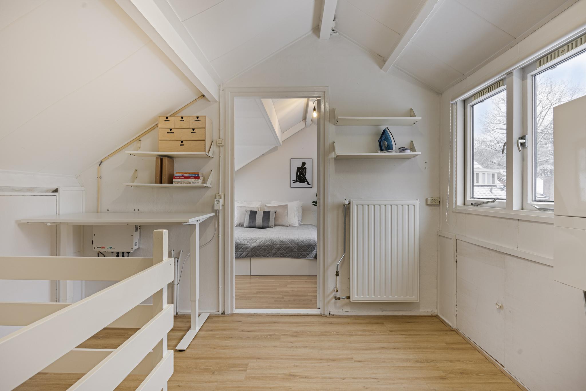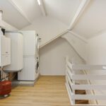Zeer ruime zolderverdieping met een verrassend grote overloop, voorzien van veel bergruimte. Hier vindt u ook de aansluitingen voor de wasmachine en droger, de opstelling van de cv-ketel én een elektrische zonneboiler. Daarnaast is er een vierde slaapkamer met een dakkapel, en geweldig panoramisch uitzicht. Deze kamer is ideaal als gastenverblijf, thuiskantoor of kan dienst doen hobbyruimte.