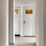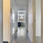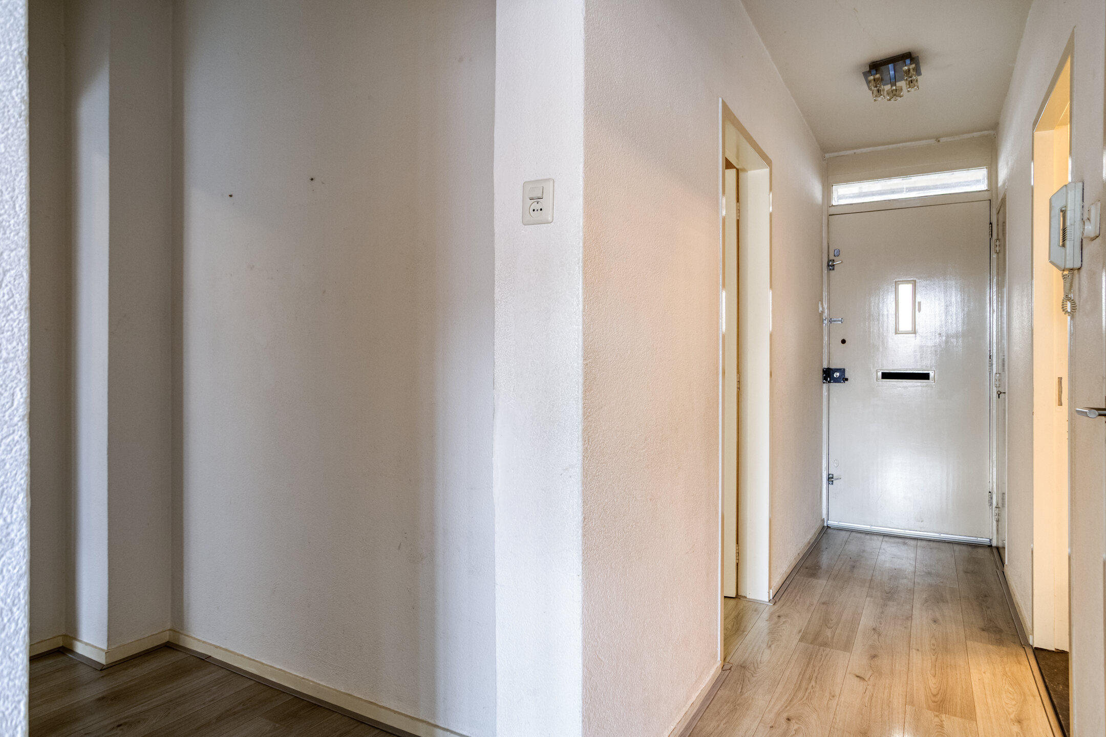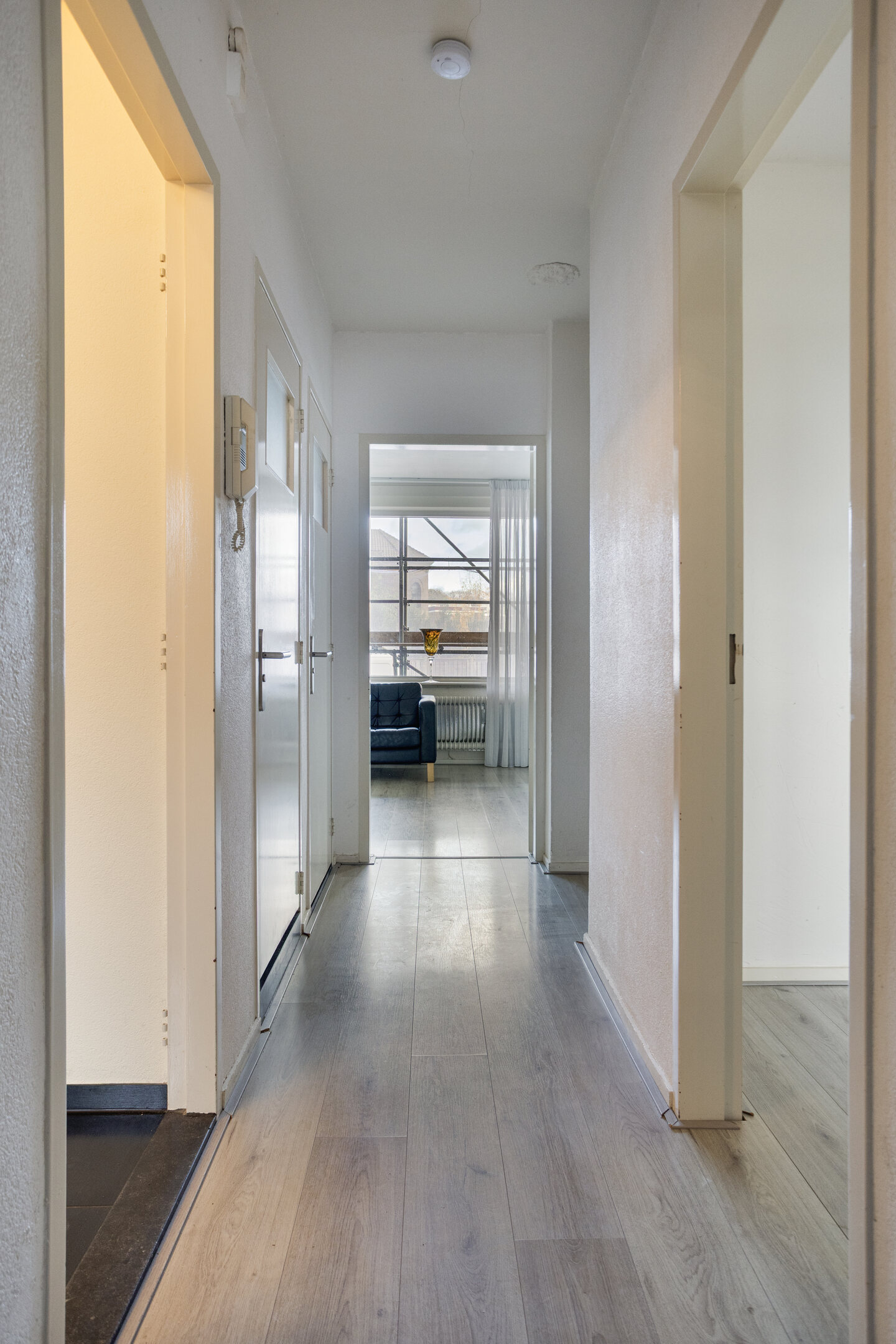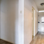 De woning beschikt over een L-vormige hal die toegang biedt tot alle vertrekken: woonkamer, keuken, badkamer, toilet, beide slaapkamers en de berg-/wasruimte.