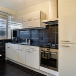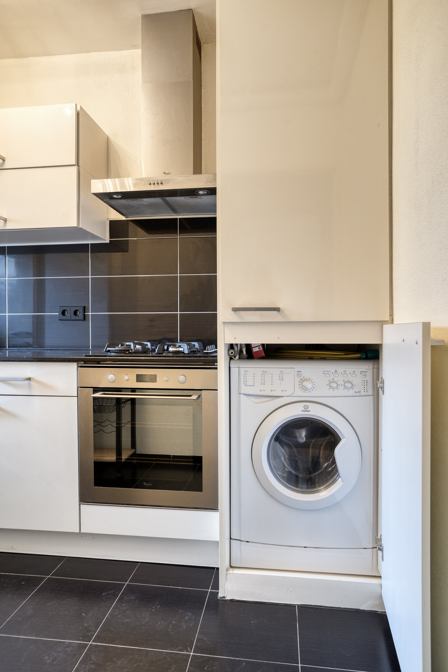 De keuken bevindt zich aan het begin van de hal en is opvallend ruim en efficiënt ingericht. De opstelling biedt veel werk- en opbergruimte, met een gas kookplaat, oven, inbouwkoelkast, aansluiting voor wasmachine en voldoende kastruimte.