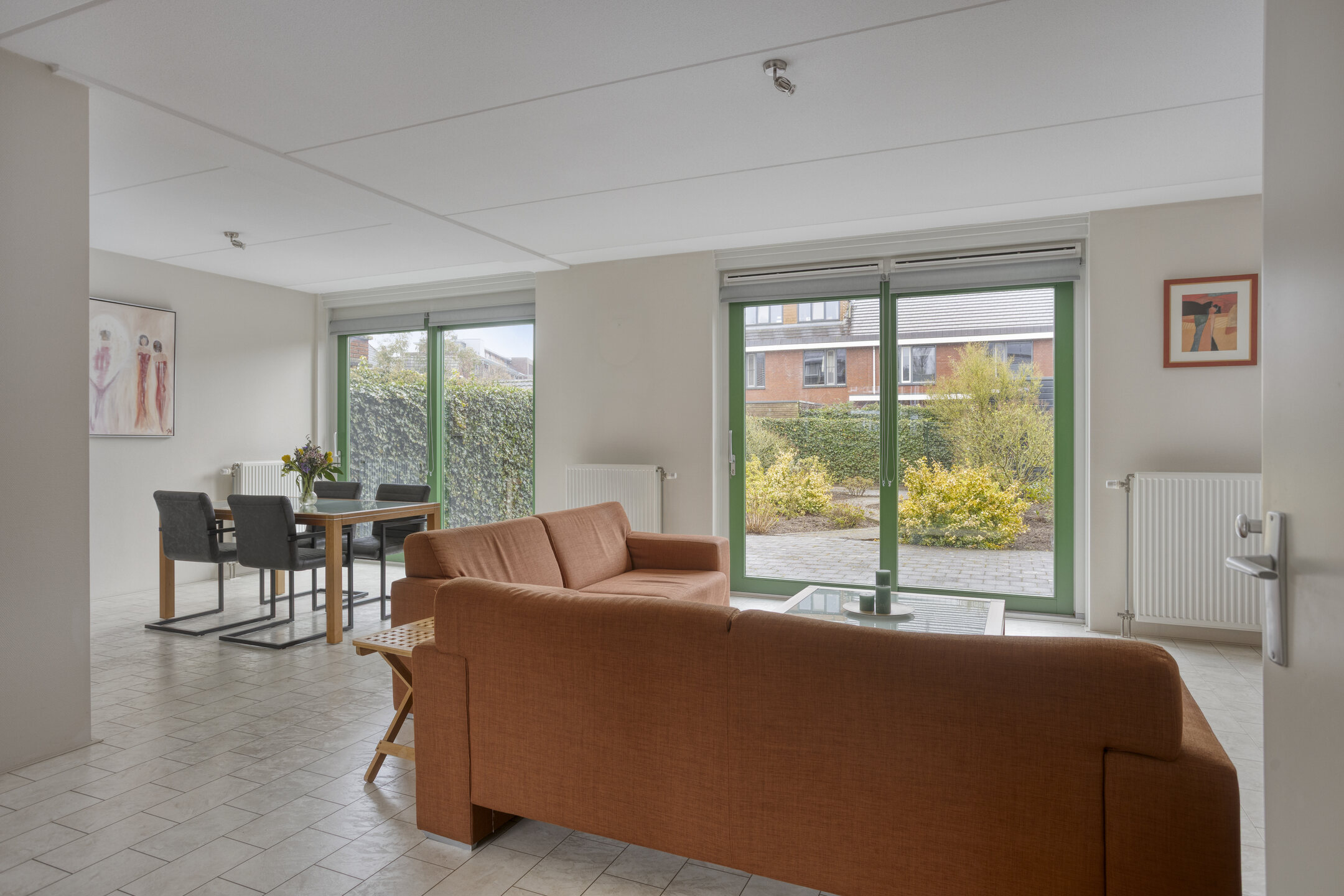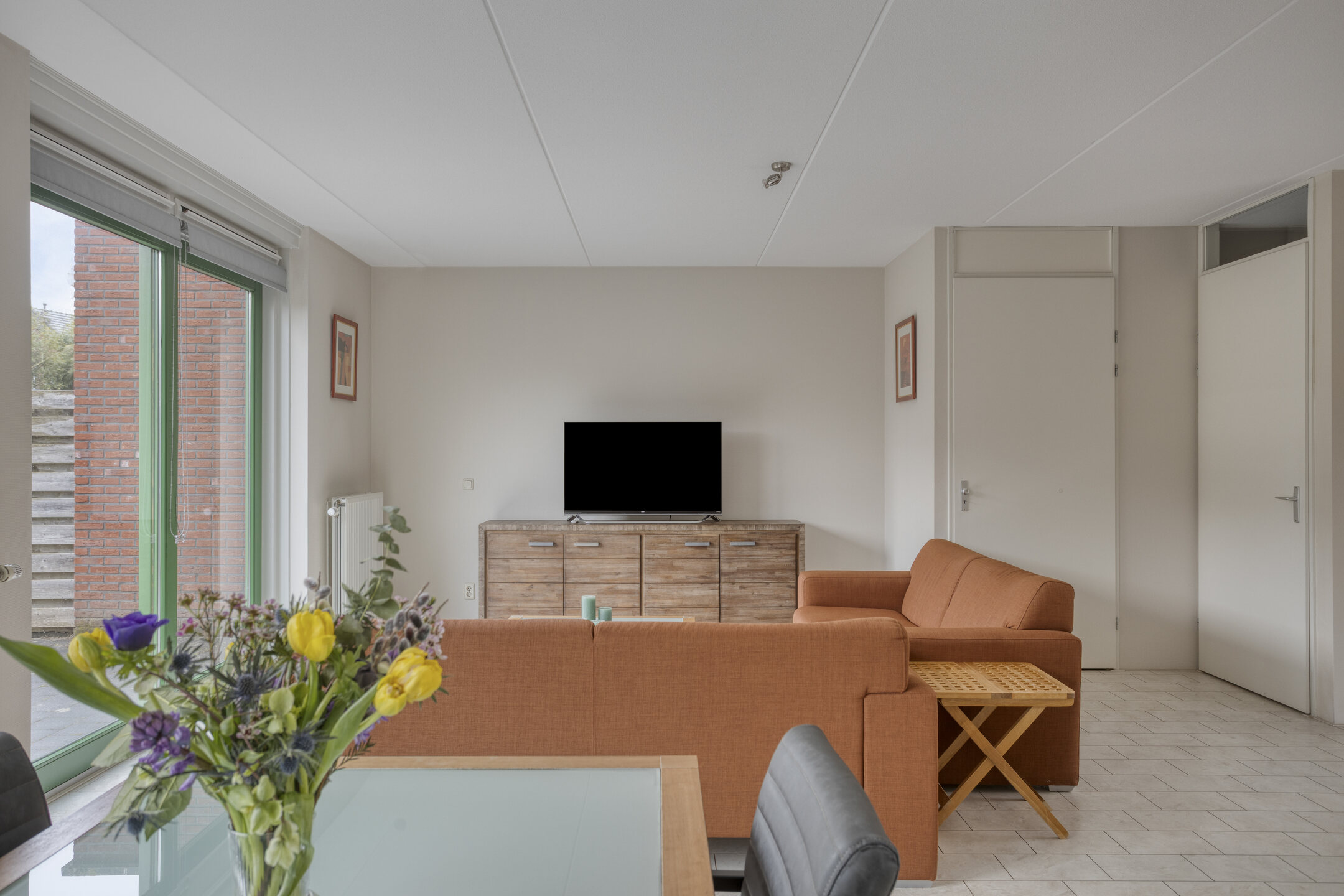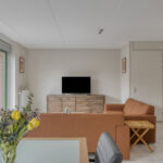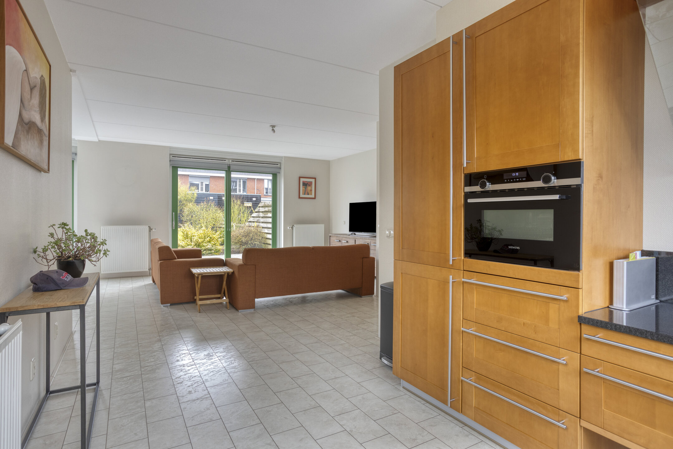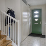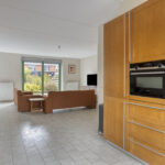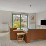 Je komt binnen in de hal met het toilet en de trapopgang naar de eerste verdieping. Vanuit hier loop je door naar de ruime en opvallend brede woonkamer. De twee schuifpuien zorgen voor veel lichtinval en een prettige verbinding met de tuin.