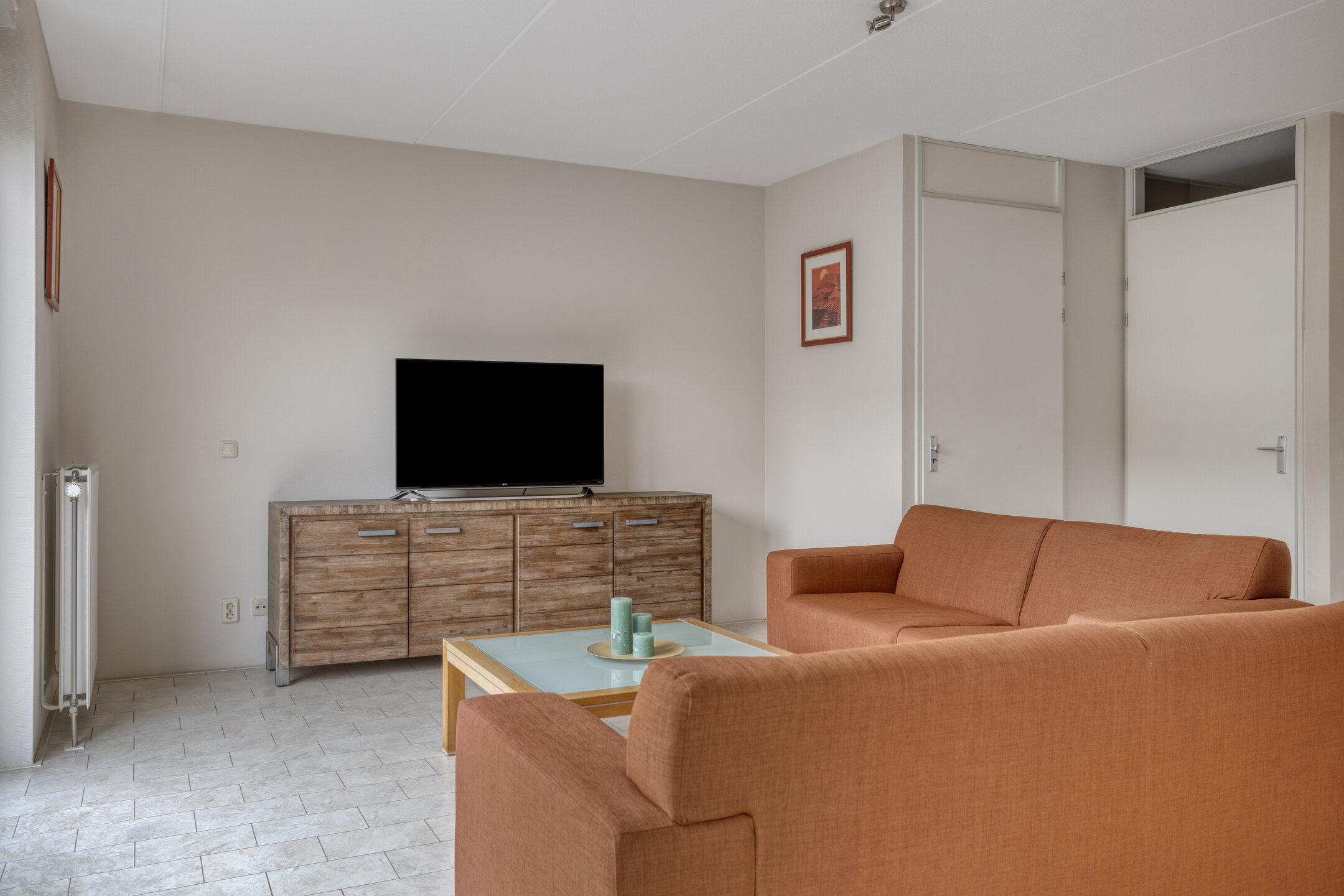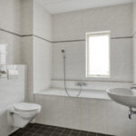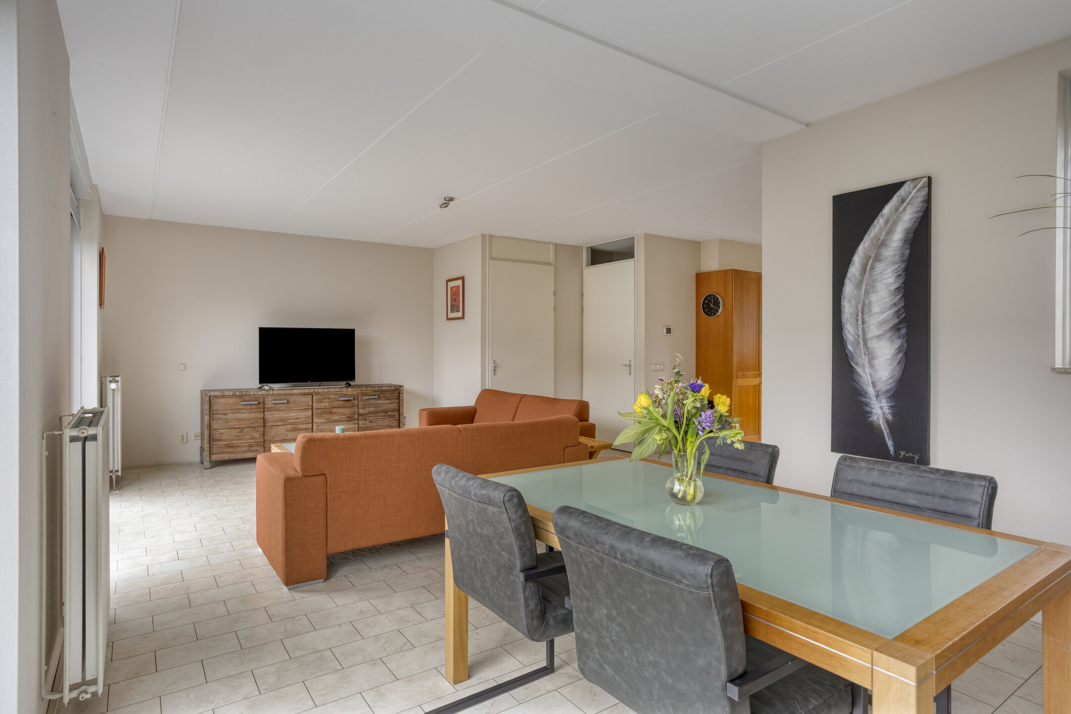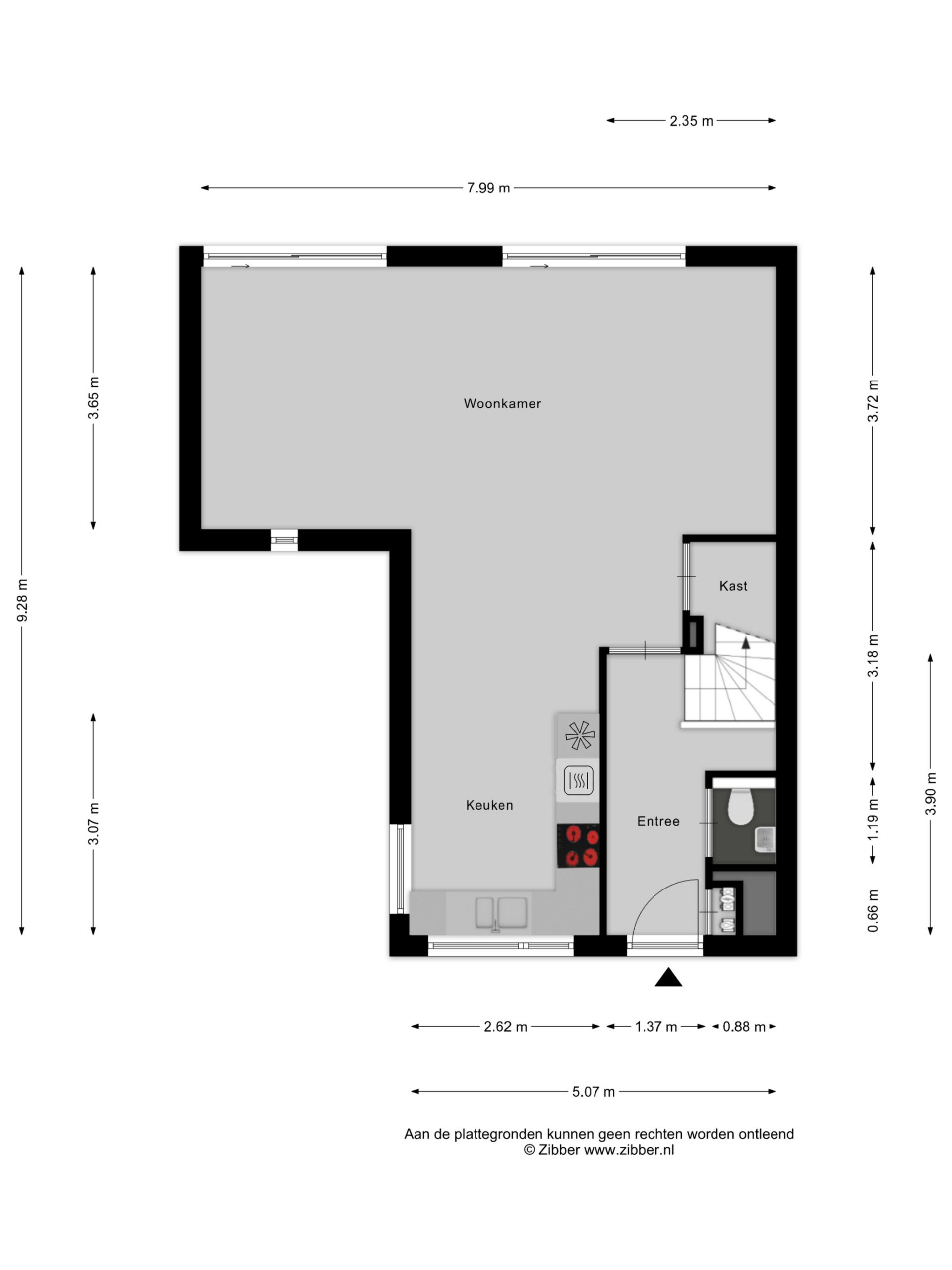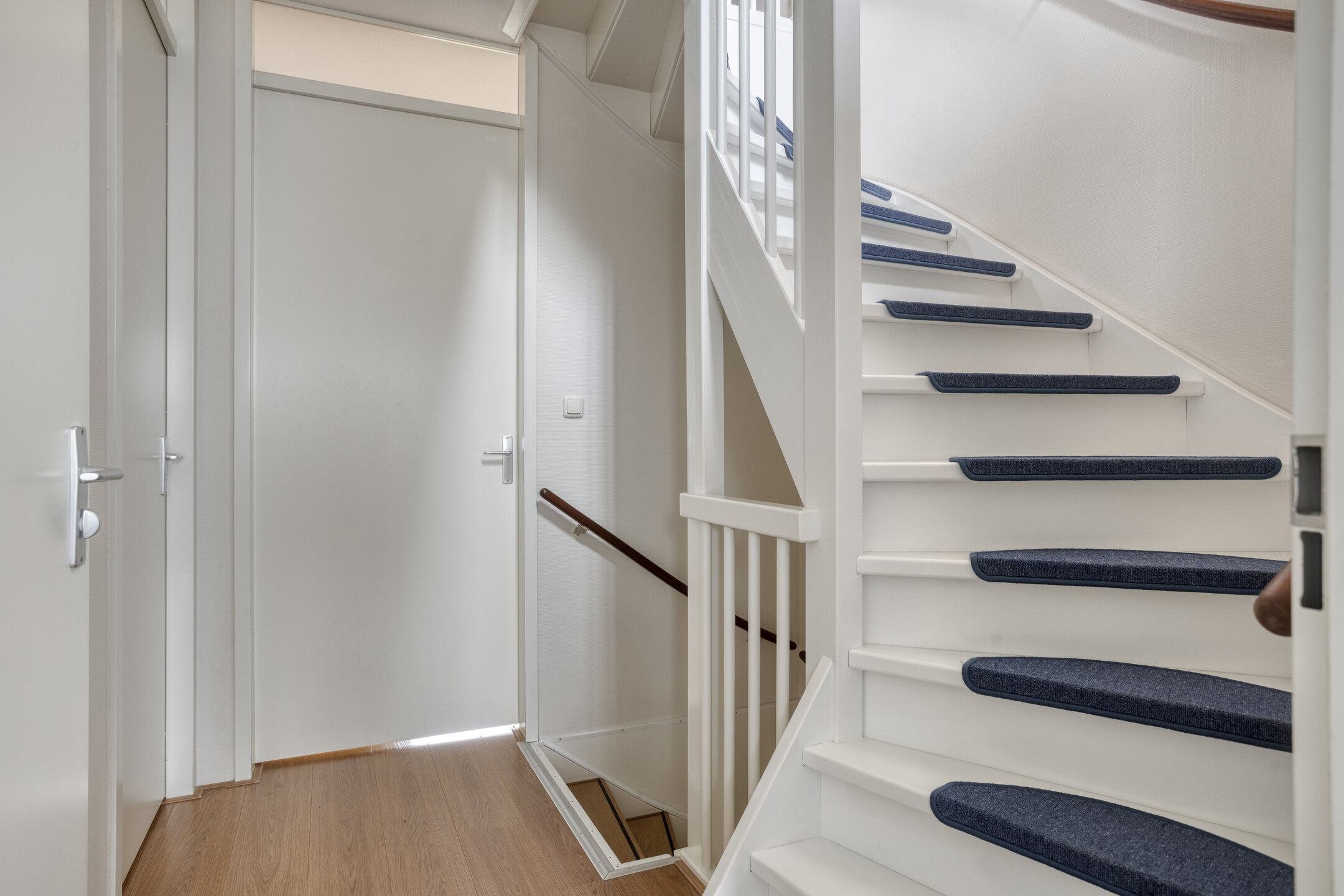 Je komt binnen in de hal met het toilet en de trapopgang naar de eerste verdieping. Vanuit hier loop je door naar de ruime en opvallend brede woonkamer. De twee schuifpuien zorgen voor veel lichtinval en een prettige verbinding met de tuin.