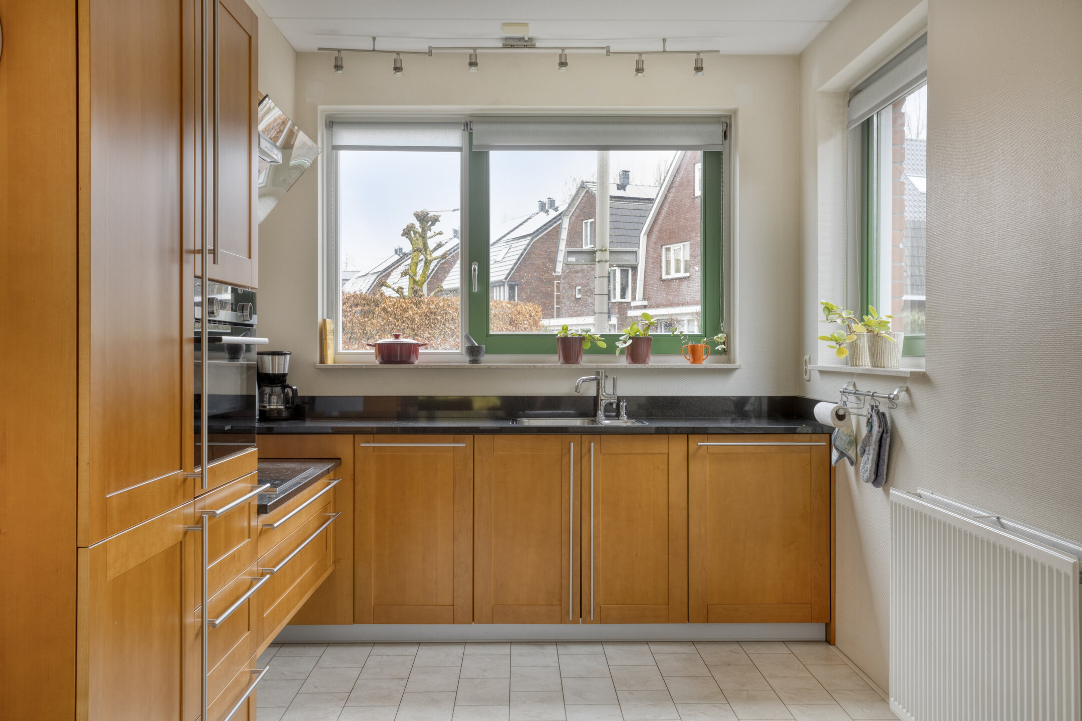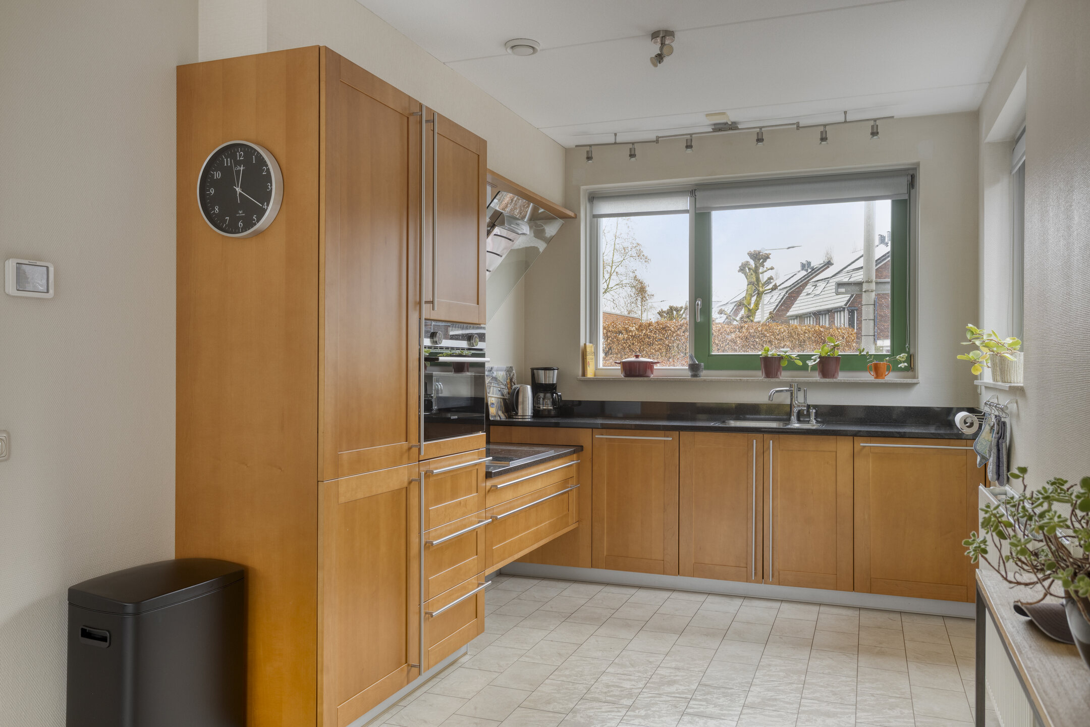 De keuken ligt aan de voorzijde van de woning en heeft een praktische L-vormige opstelling. De keuken is voorzien van diverse inbouwapparatuur en biedt voldoende werk- en opbergruimte.
