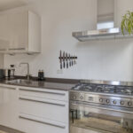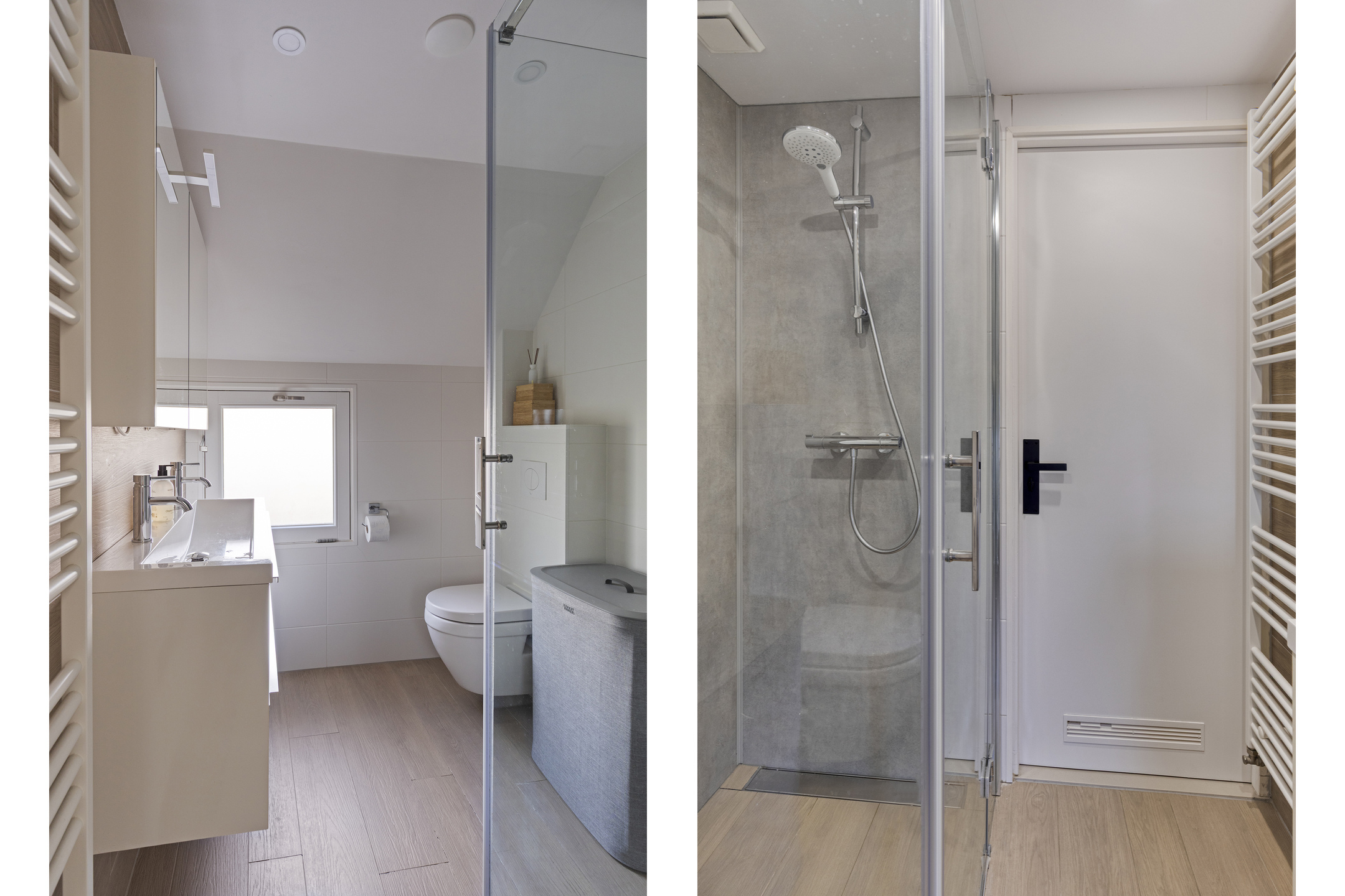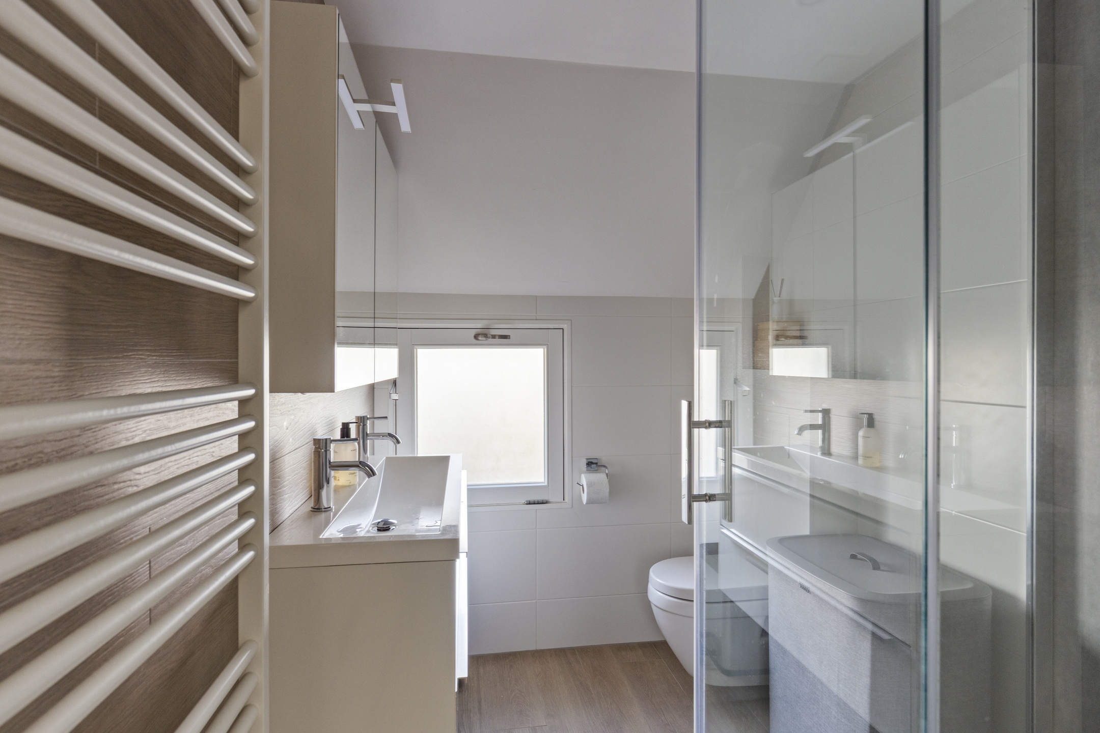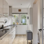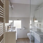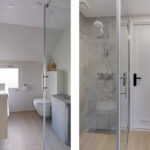 Moderne, neutrale badkamer en keuken;
