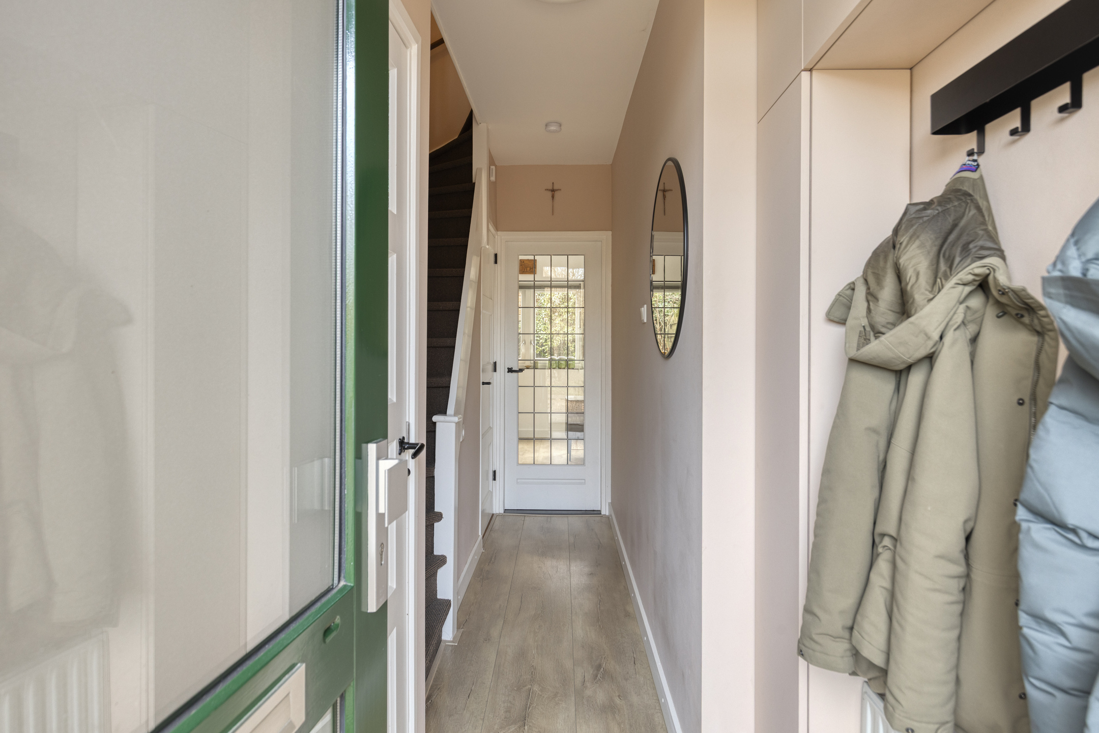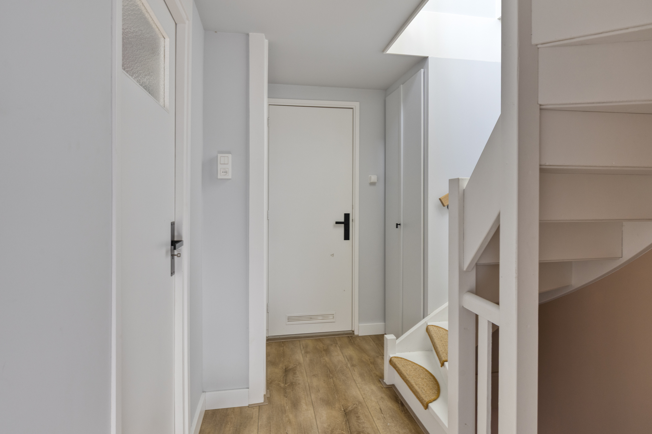 Eerste verdieping: Hier bevinden zich drie lichte slaapkamers, allen keurig afgewerkt met glasvezelbehang en strak gestuukte plafonds. De badkamer is modern en neutraal ingericht met een douche, een tweede toilet en een wastafelmeubel.