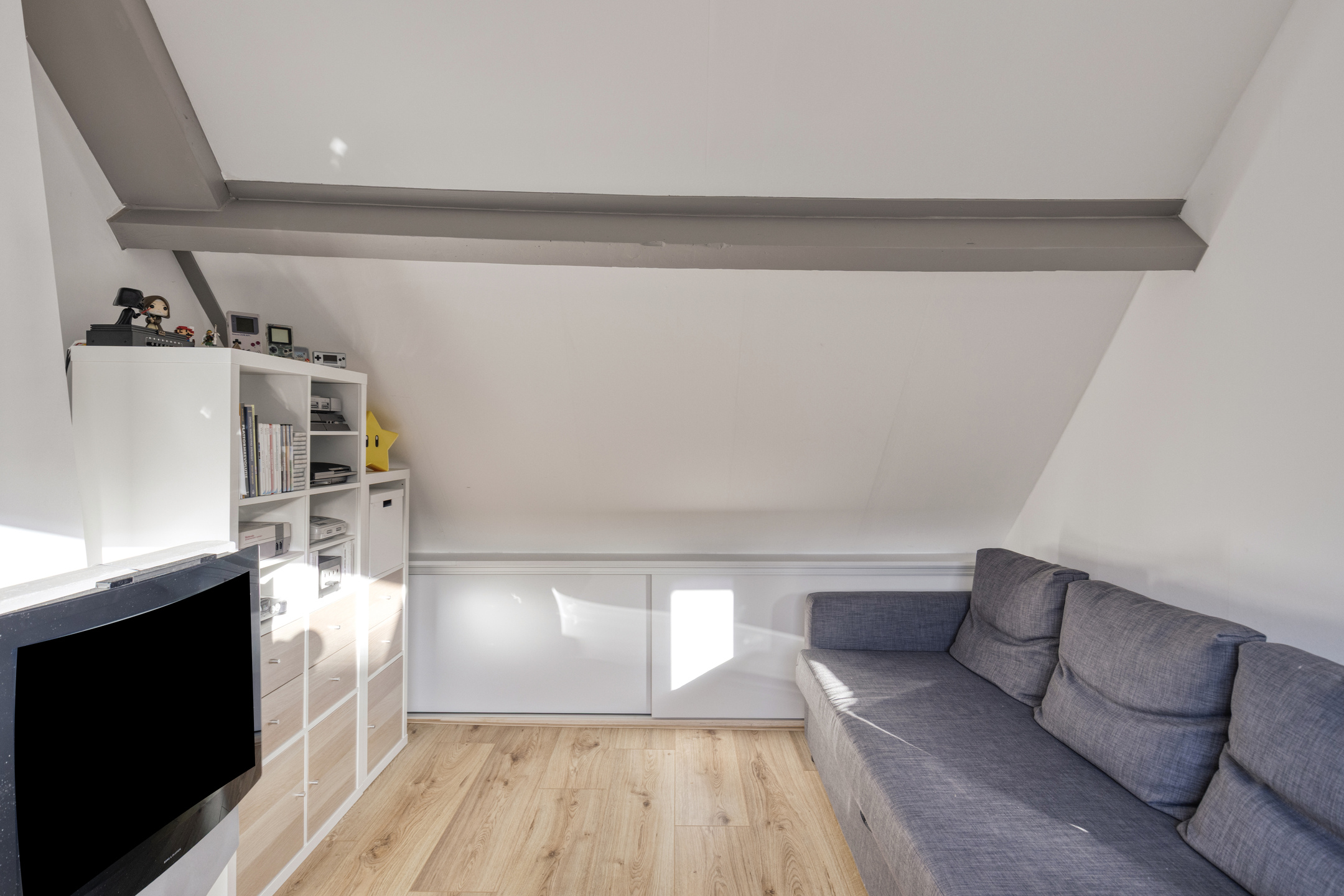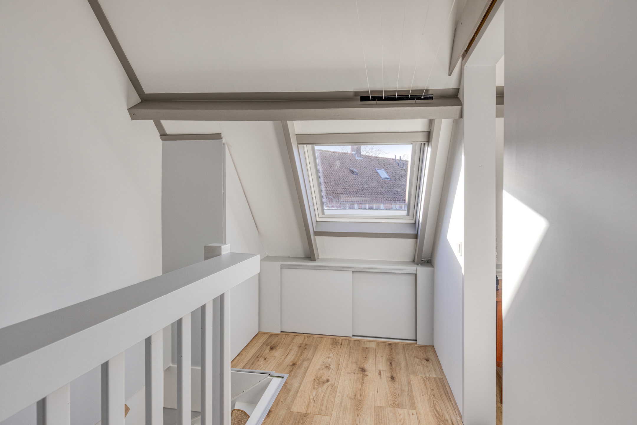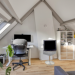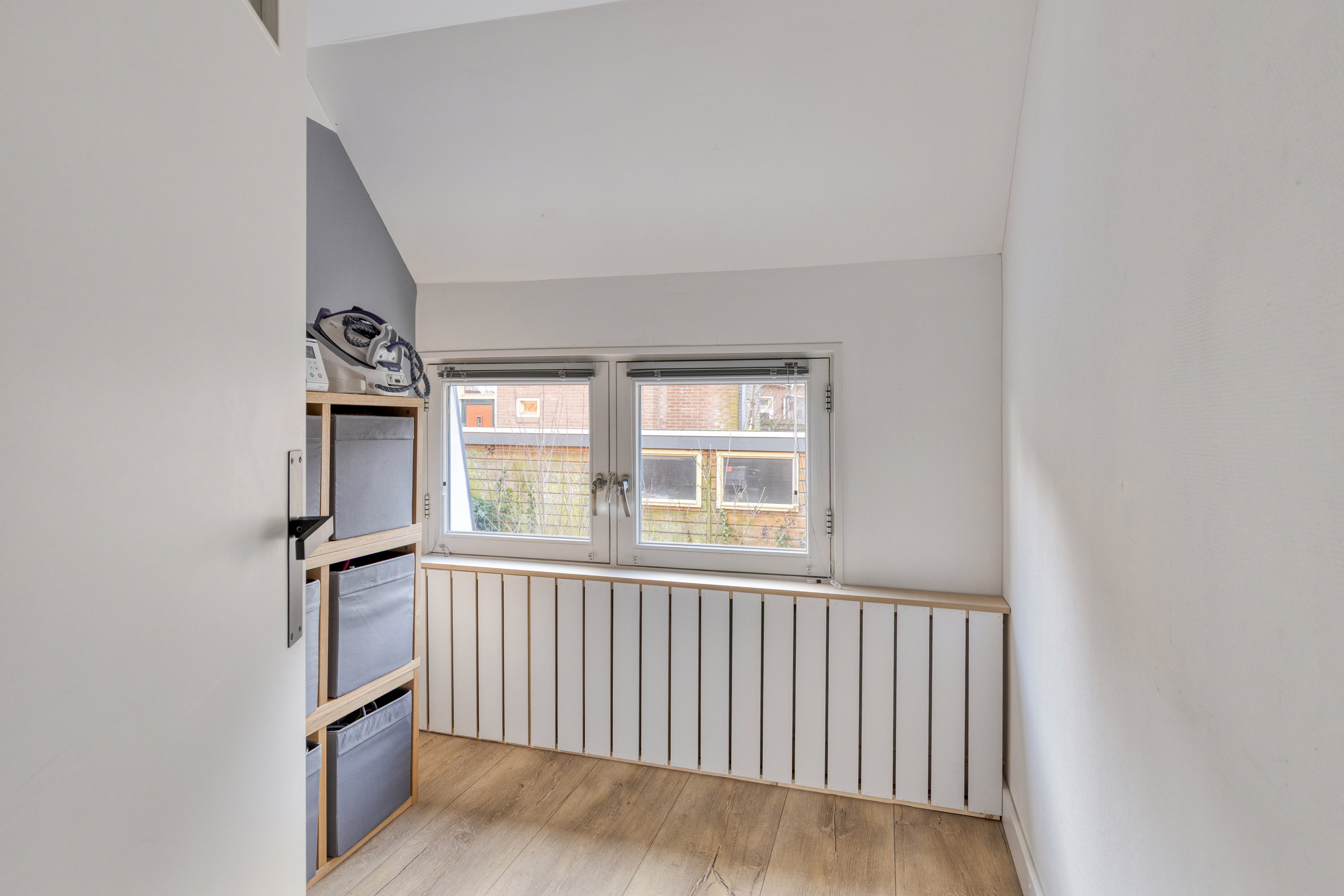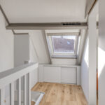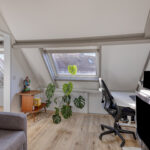 Tweede verdieping: In tegenstelling tot veel andere woningen in de wijk, beschikt dit huis over een vaste trap naar de tweede verdieping. Hierdoor is een volwaardige woonlaag ontstaan. Op de overloop vindt u de witgoedaansluitingen en de opstelling van de CV-ketel. De prachtige extra kamer is in 2020 volledig onder handen genomen en is uitstekend geschikt als vierde slaapkamer of rustige werkplek. De bergruimte achter de knieschotten zorgt ervoor dat u al uw spullen gemakkelijk uit het zicht opbergt.