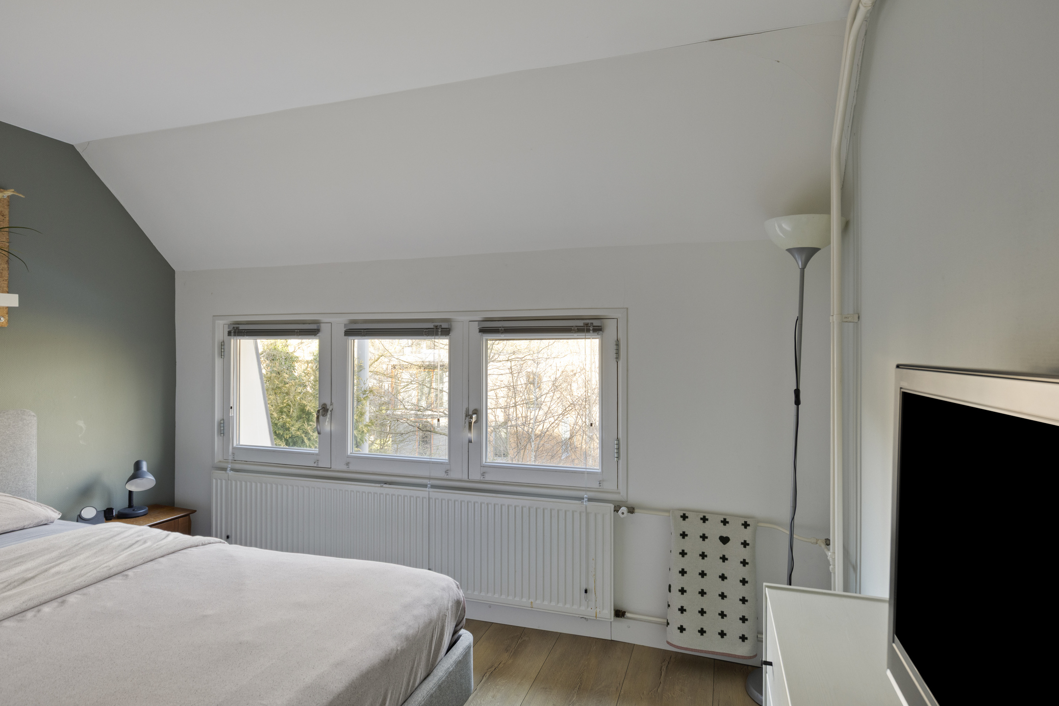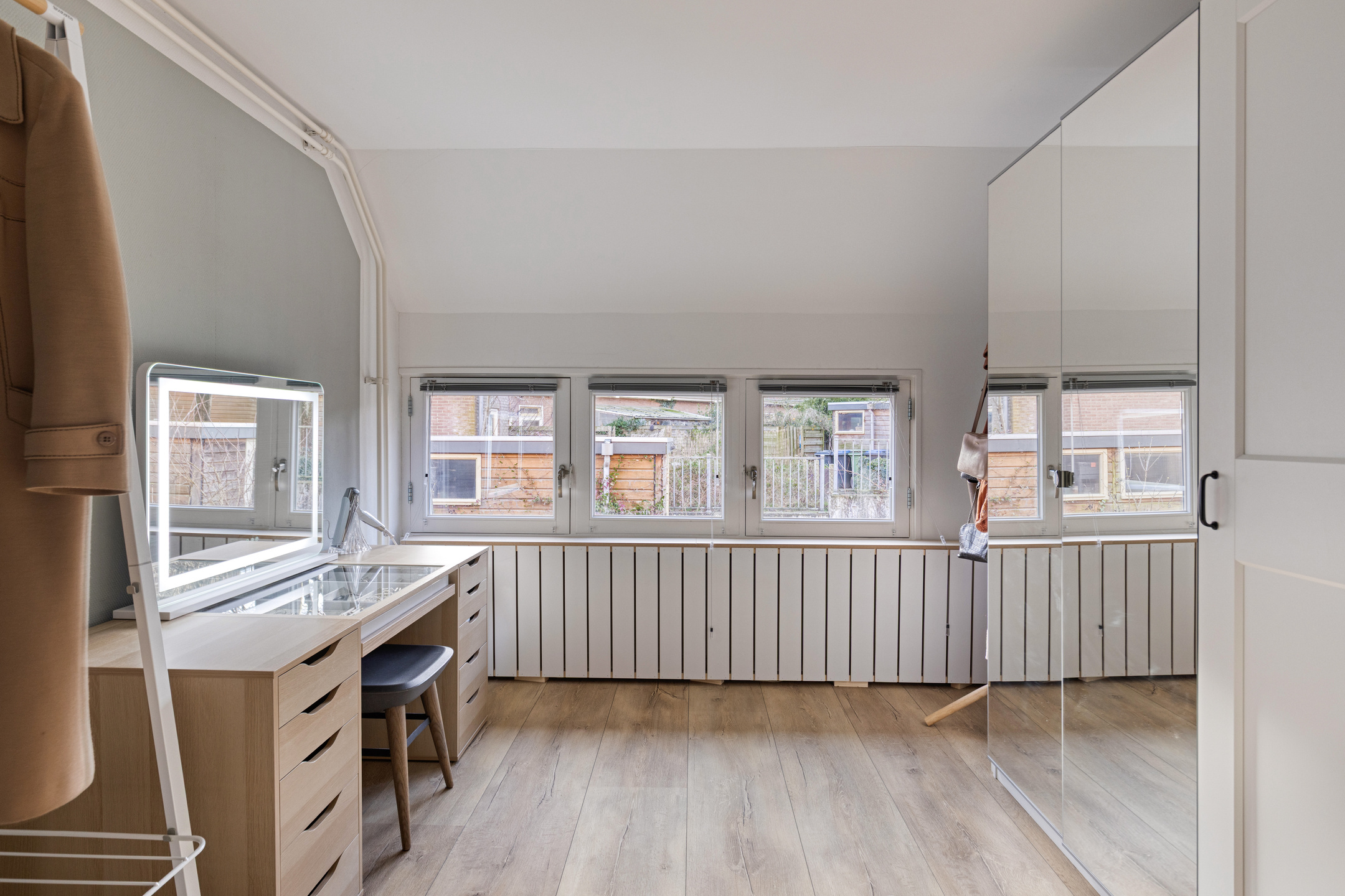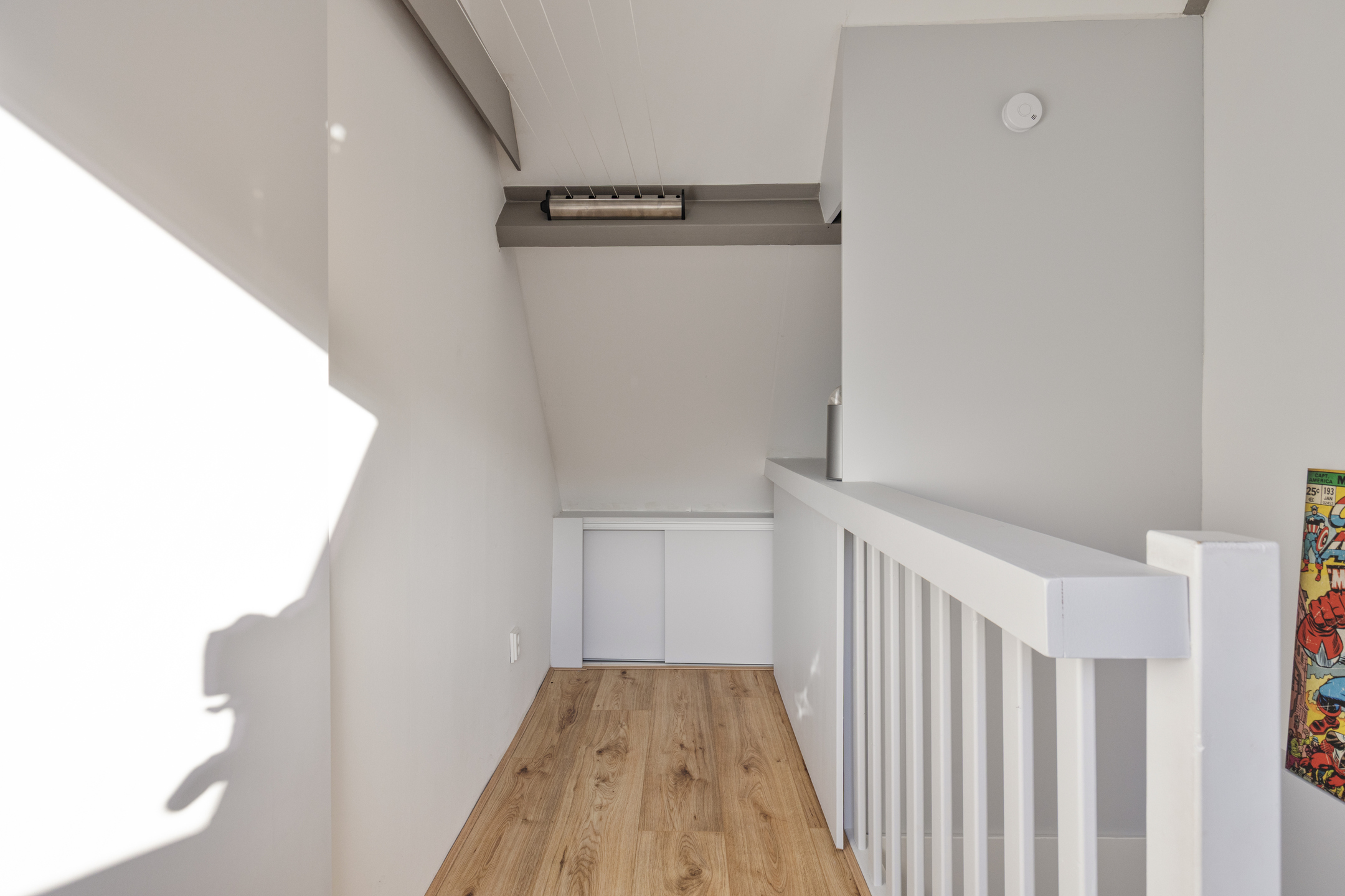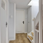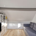Tweede verdieping: In tegenstelling tot veel andere woningen in de wijk, beschikt dit huis over een vaste trap naar de tweede verdieping. Hierdoor is een volwaardige woonlaag ontstaan. Op de overloop vindt u de witgoedaansluitingen en de opstelling van de CV-ketel. De prachtige extra kamer is in 2020 volledig onder handen genomen en is uitstekend geschikt als vierde slaapkamer of rustige werkplek. De bergruimte achter de knieschotten zorgt ervoor dat u al uw spullen gemakkelijk uit het zicht opbergt.